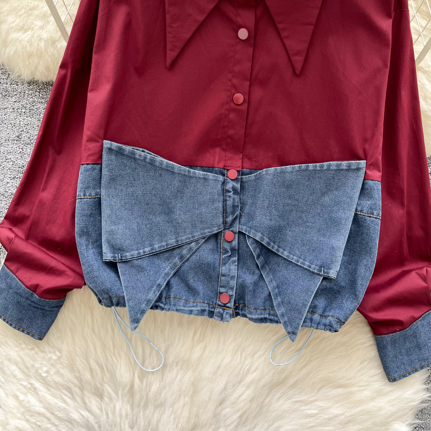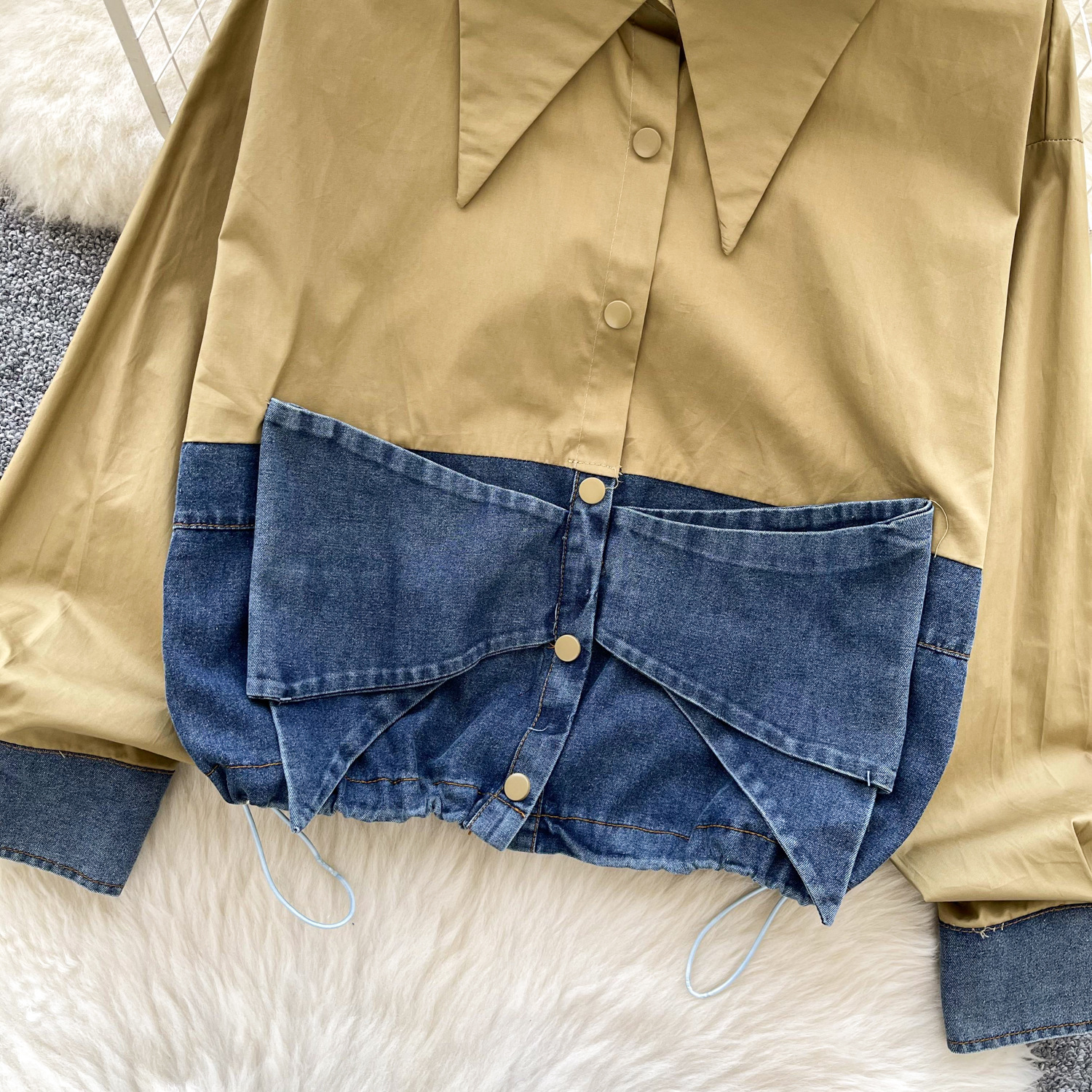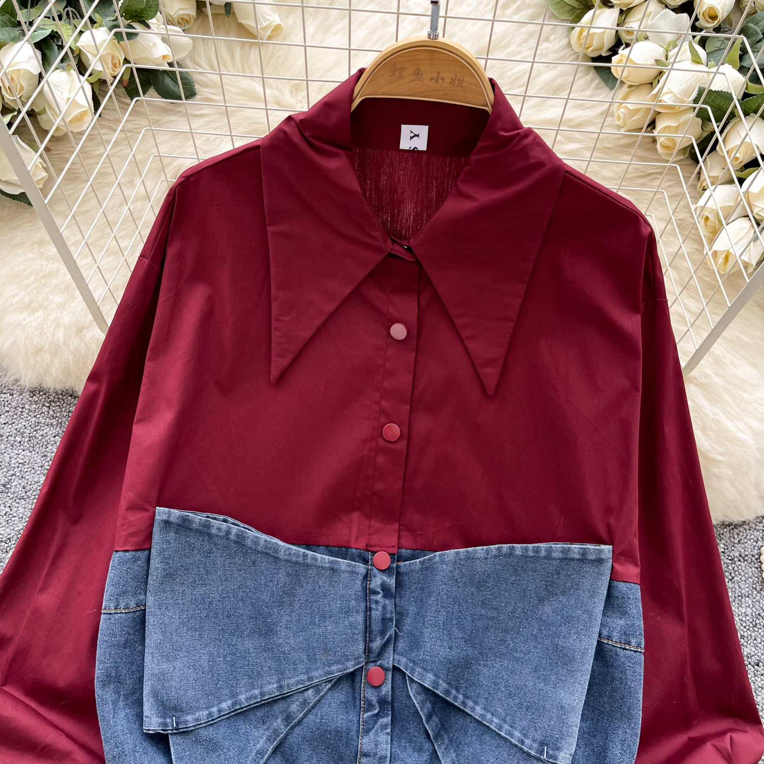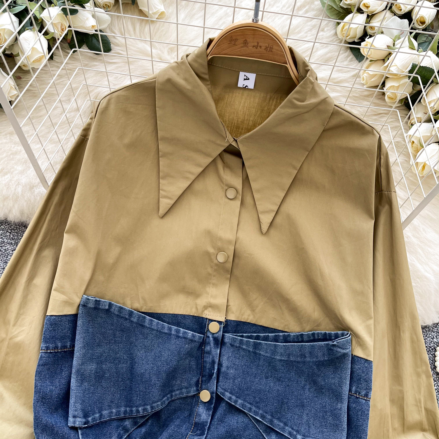 봄 의류 한국 스타일 패션 디자인 센스 활 데님 긴 소매 셔츠 바느질 여성용 루즈 셔츠 탑스토어 가기