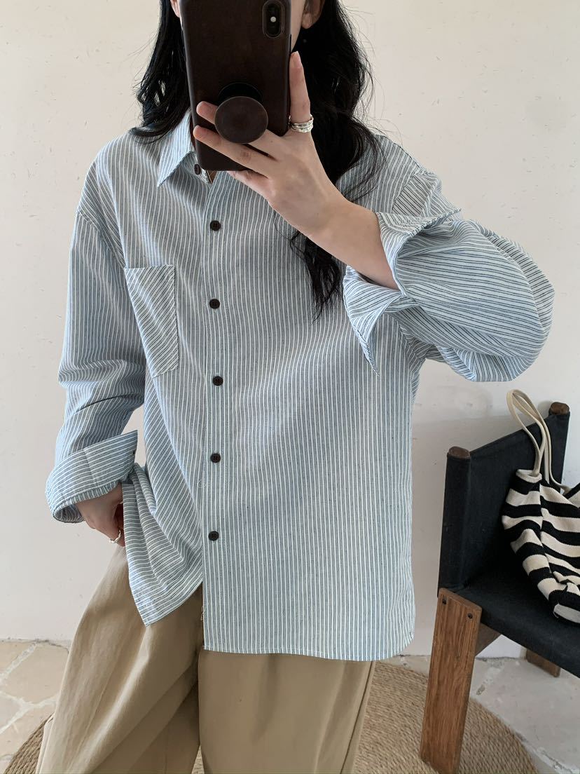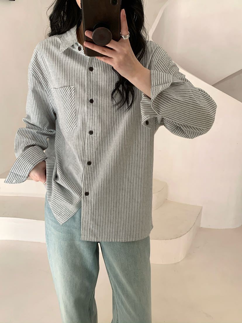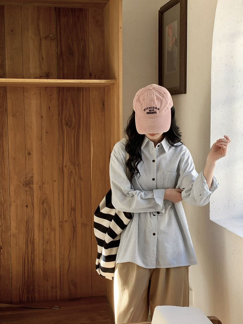 핀스트라이프 옷깃 셔츠 여성 캐주얼 루즈 탑 봄과 가을 2025 새로운 올 매치 셔츠스토어 가기
