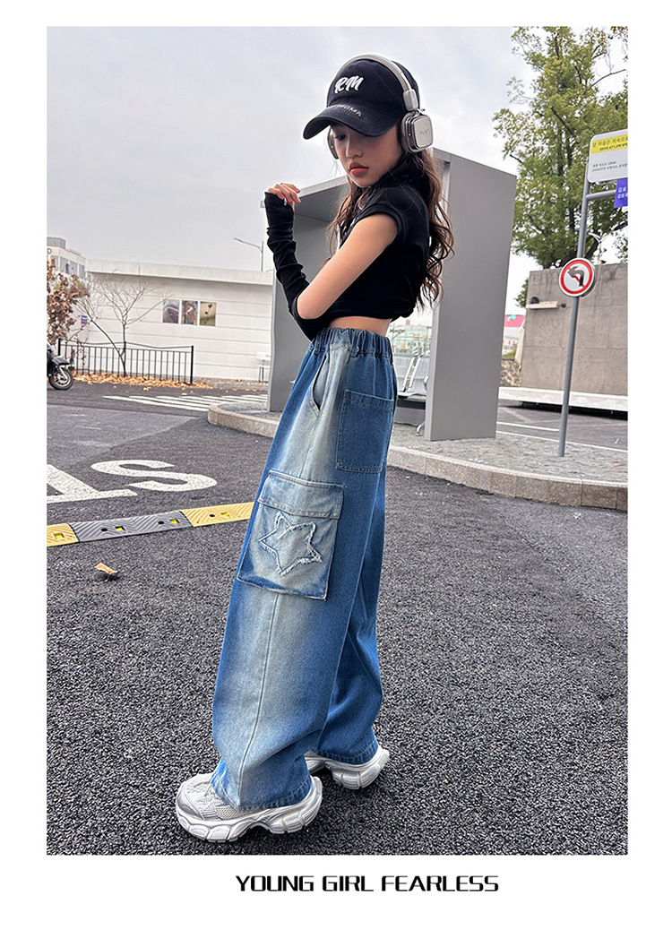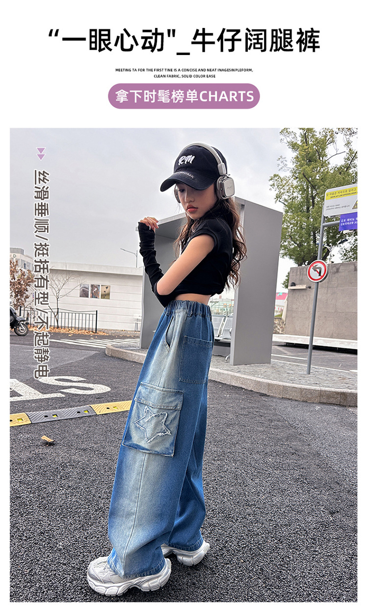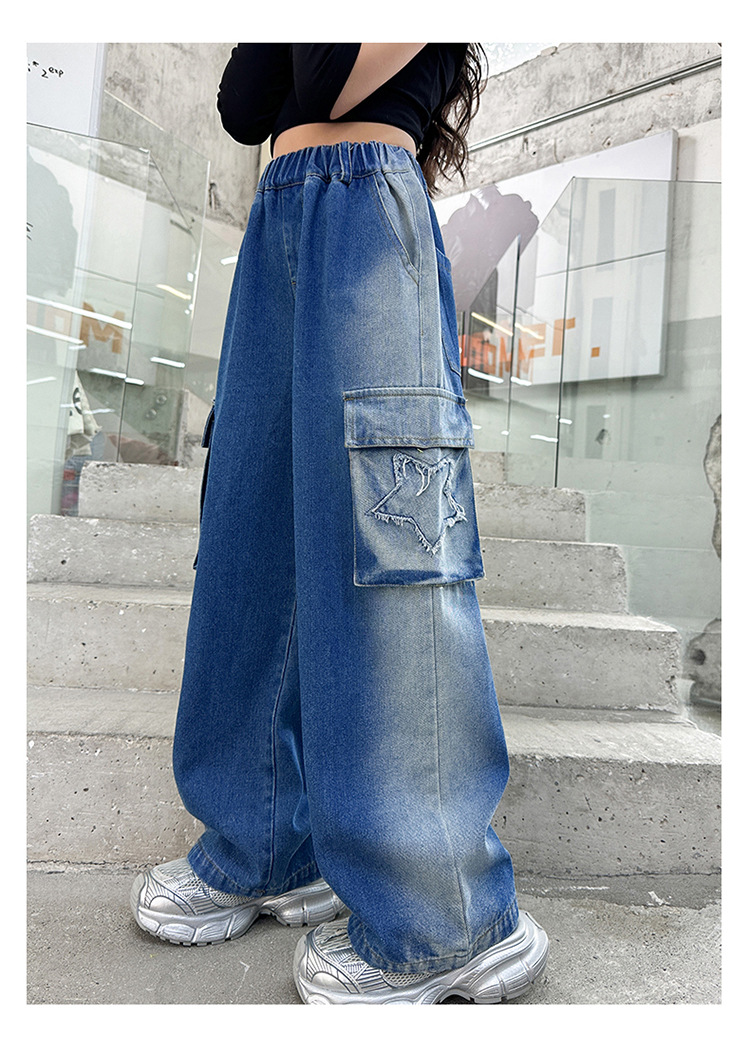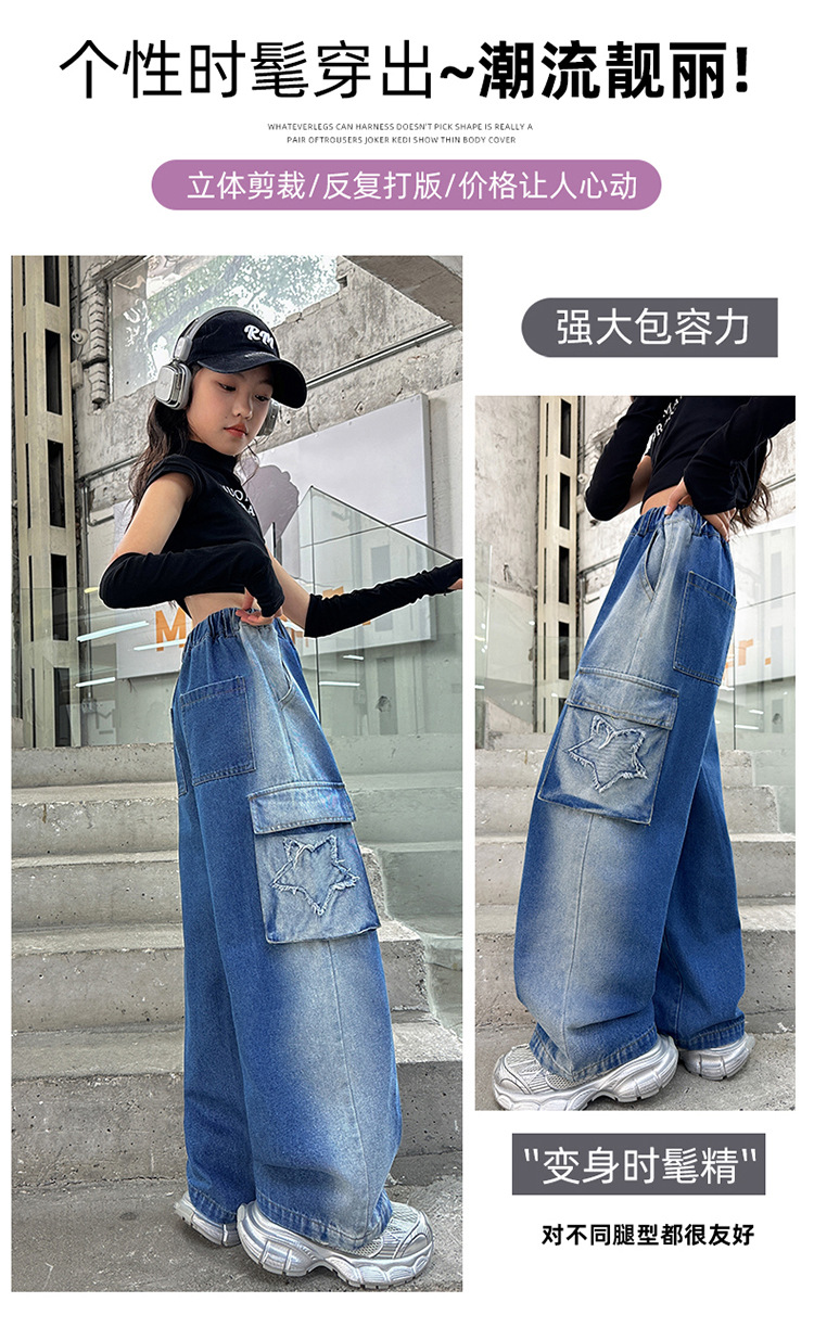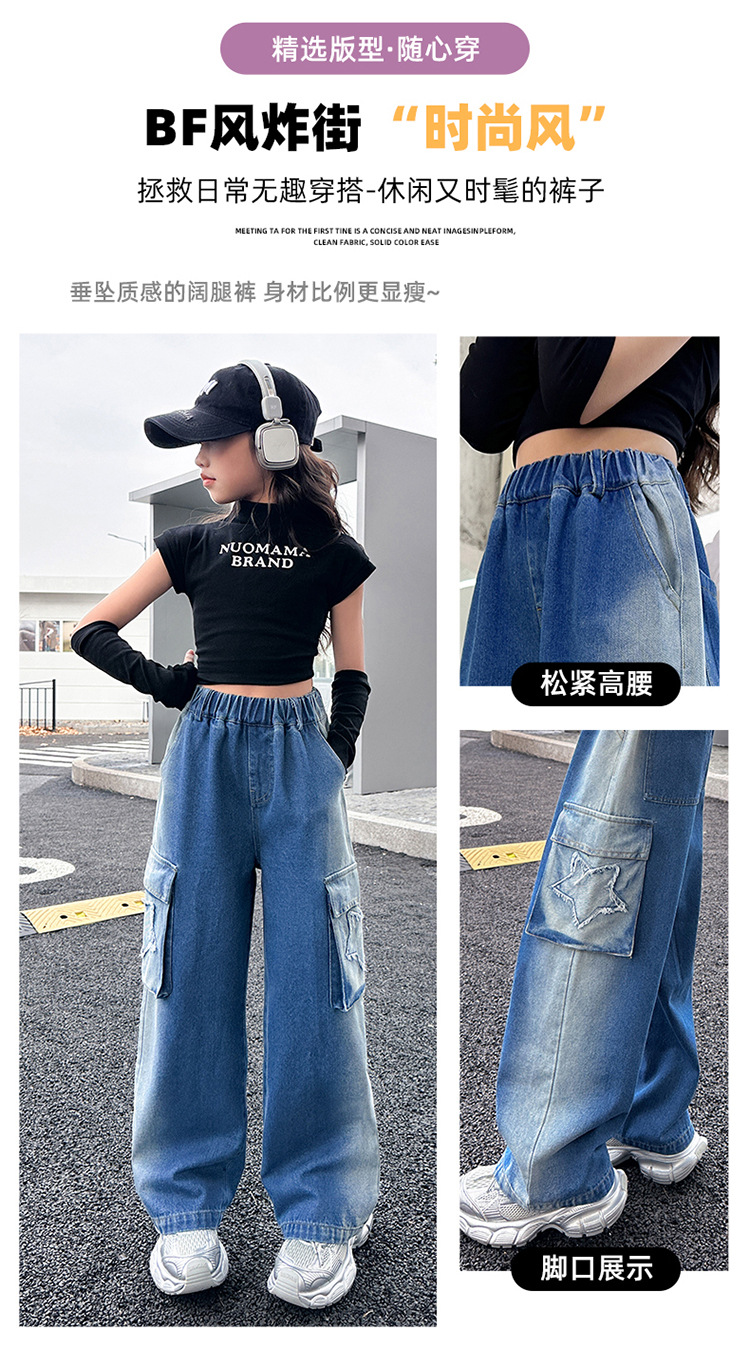 소녀 청바지 봄과 가을 2025 새로운 스타일 바지 서양식 한국 스타일 큰 아이들 느슨한 넓은 다리 바지 아동화물 바지스토어 가기