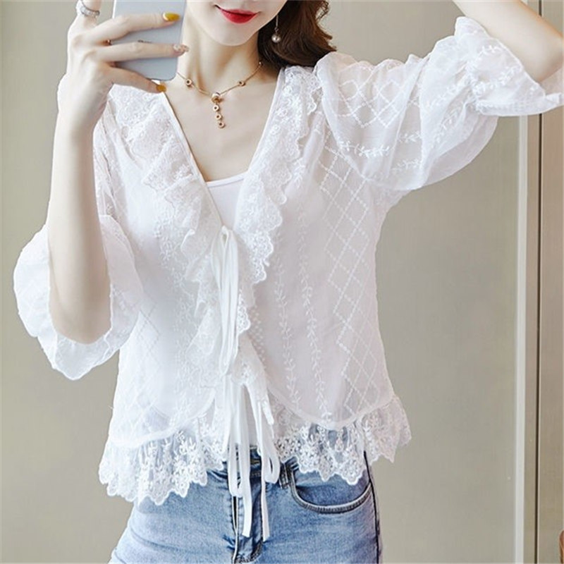쉬폰 선 카디건 얇은 여성 여름 목도리 아우터 쇼트 탑 미드 슬리브 블라우스 레이스 스몰 웨이스트 코트
