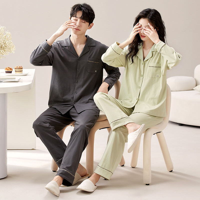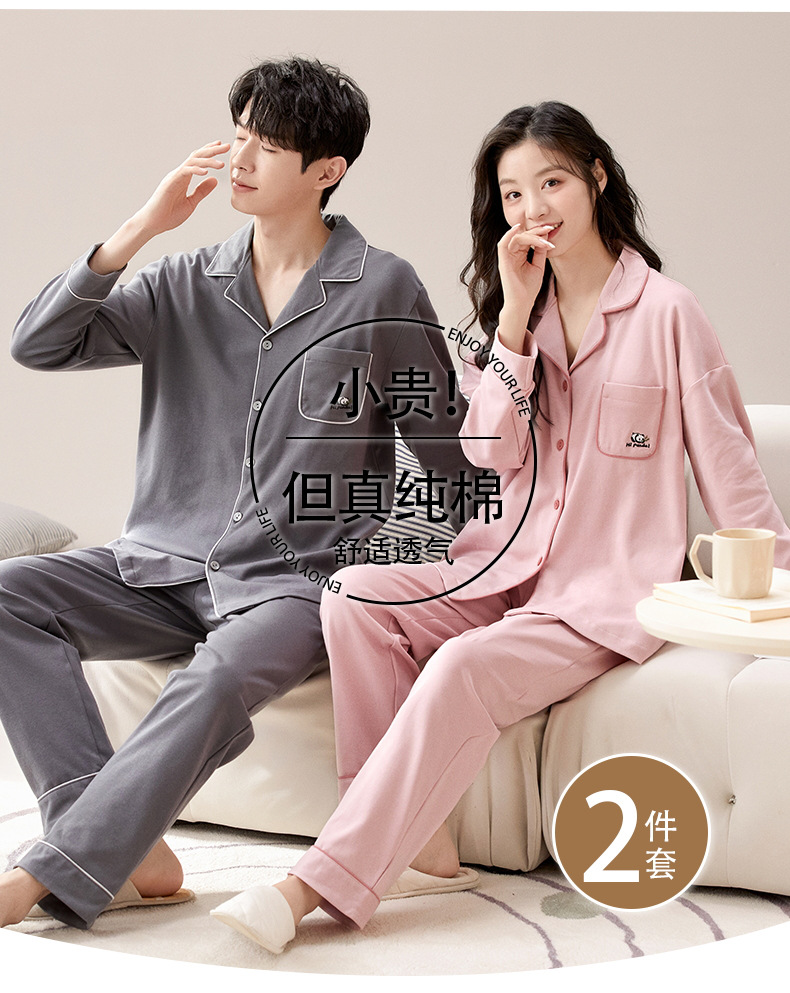 커플 잠옷 면 긴 소매 봄과 가을 여성의 간단한 캐주얼 남성 편안한 카디건 옷깃 홈 의류 세트