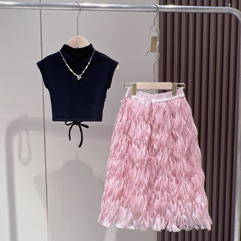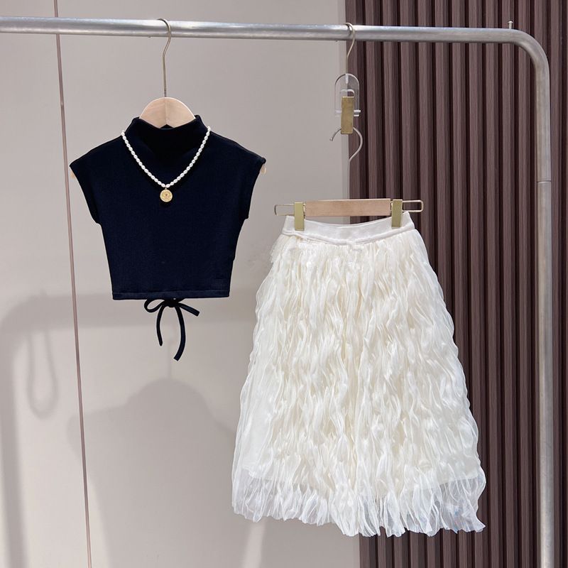 여자 여름 스커트 2024 새로운 한국 스타일 숙녀 작은 플라이 슬리브 티셔츠 메쉬 스커트 세트.스토어 가기