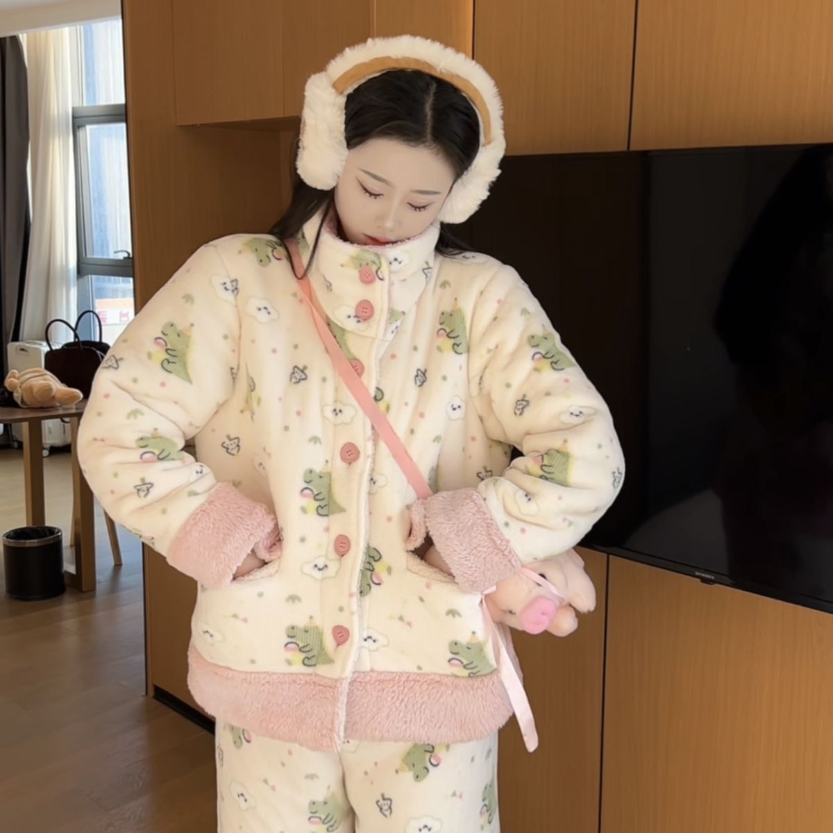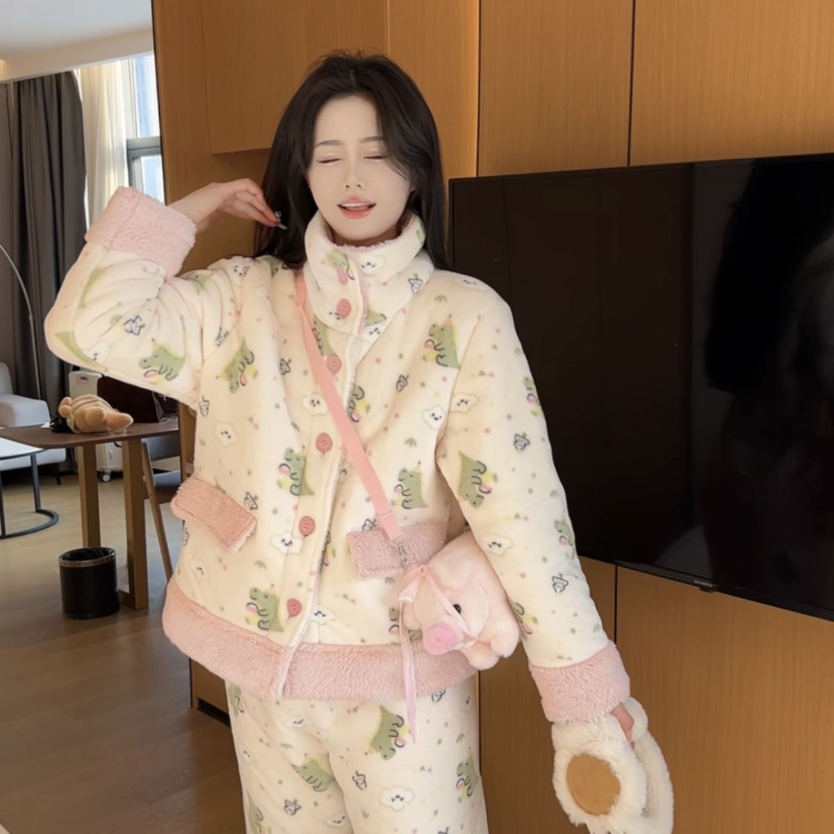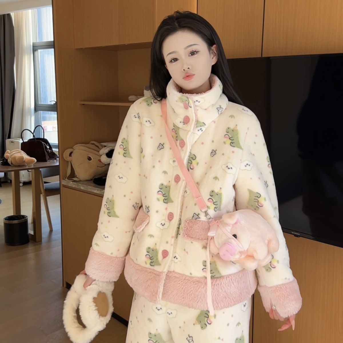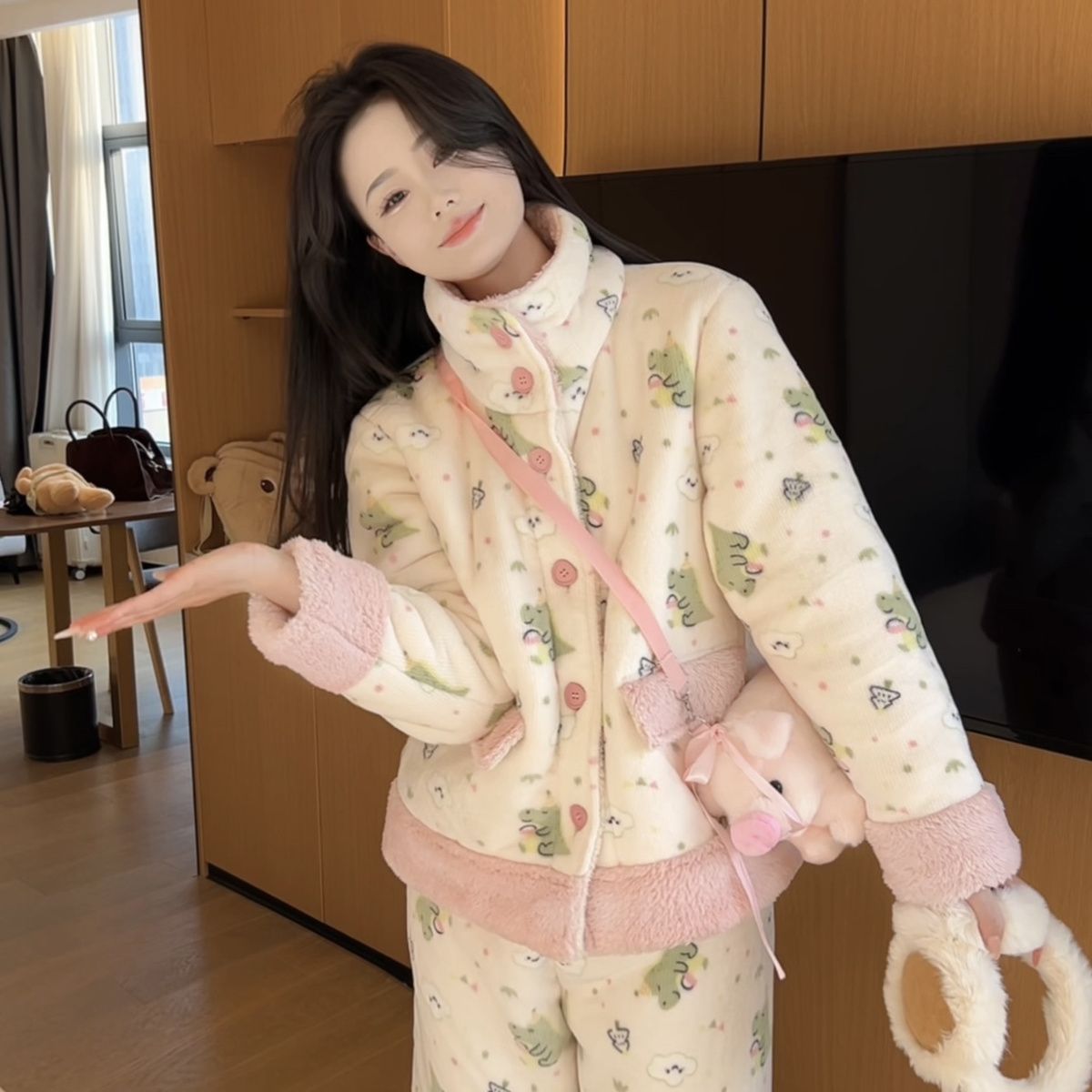 겨울용 두꺼운 보온 공룡 스타일 플러시 잠옷, 하이넥 홈웨어, 여성용, 외출 가능, 귀여운 스타일스토어 가기