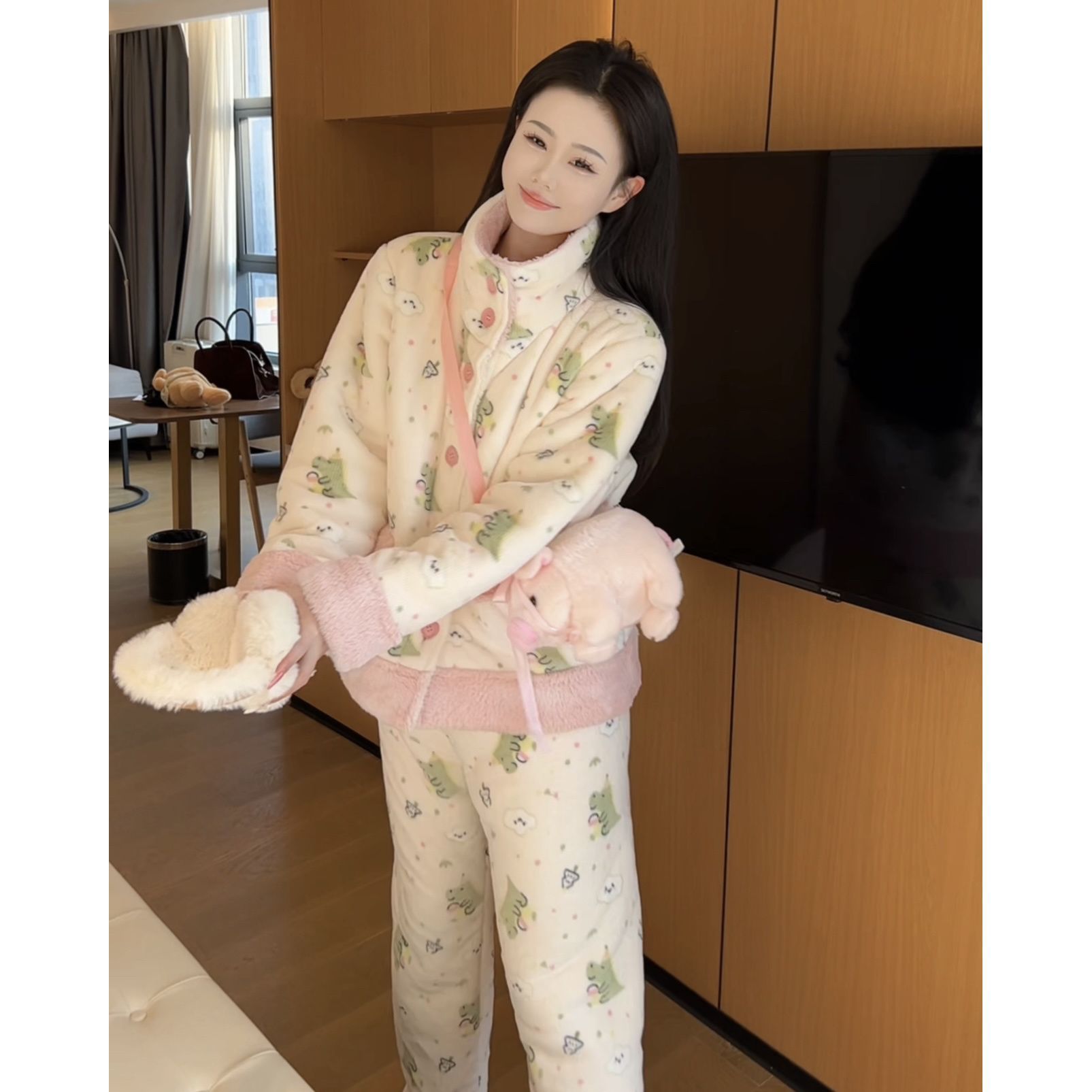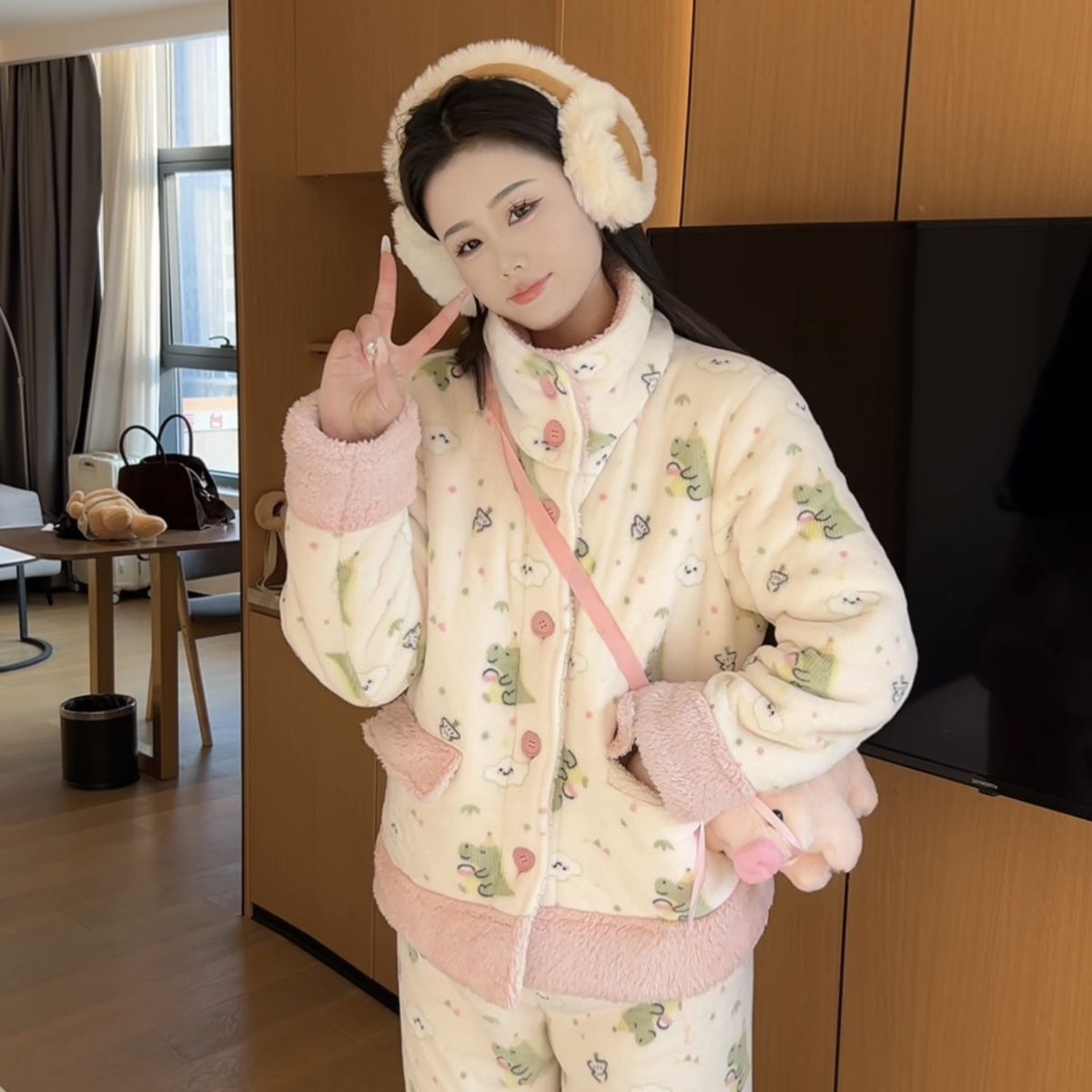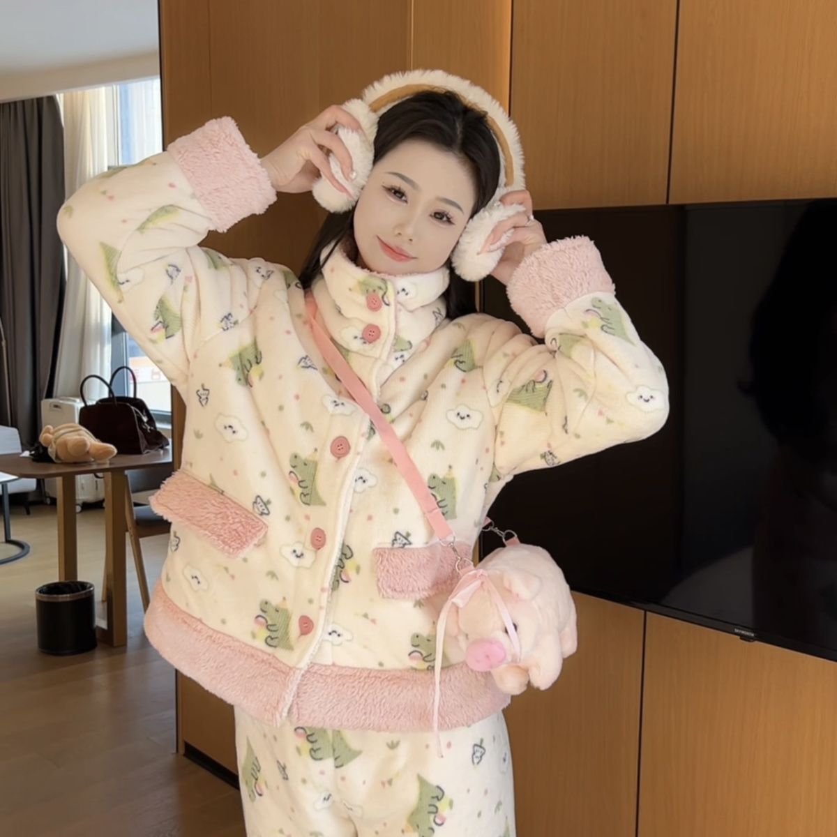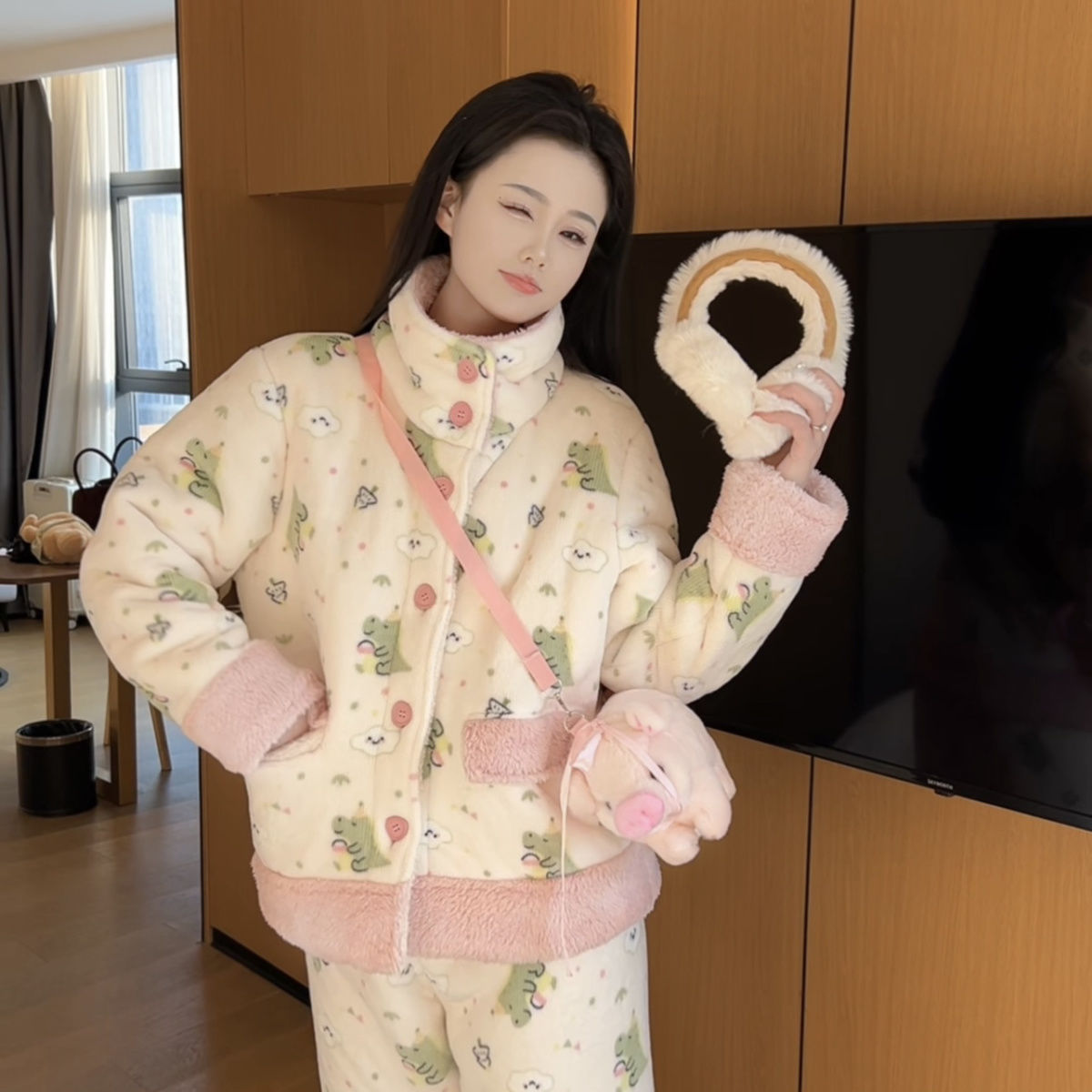 겨울용 두꺼운 보온 공룡 스타일 플러시 잠옷, 하이넥 홈웨어, 여성용, 외출 가능, 귀여운 스타일스토어 가기