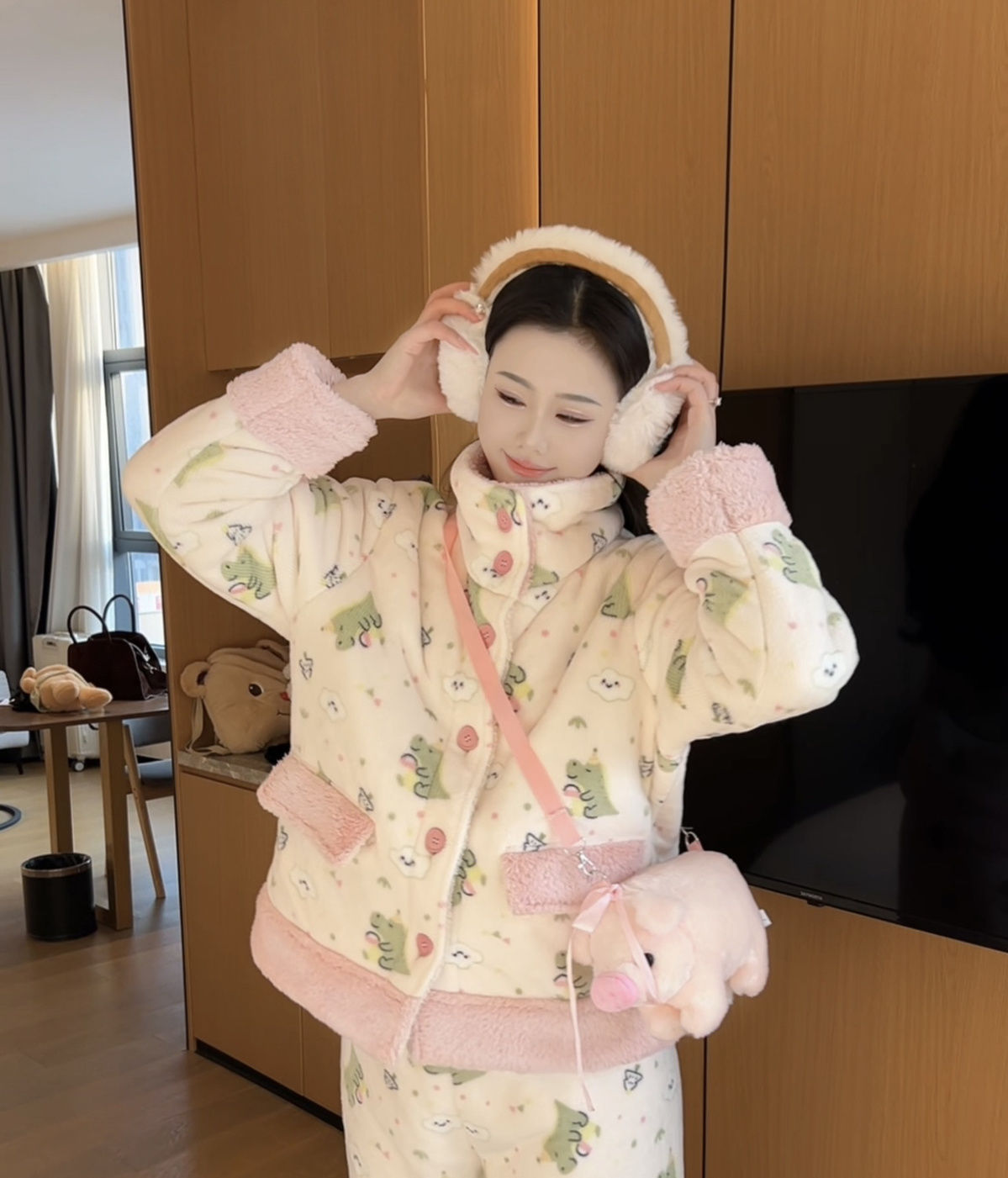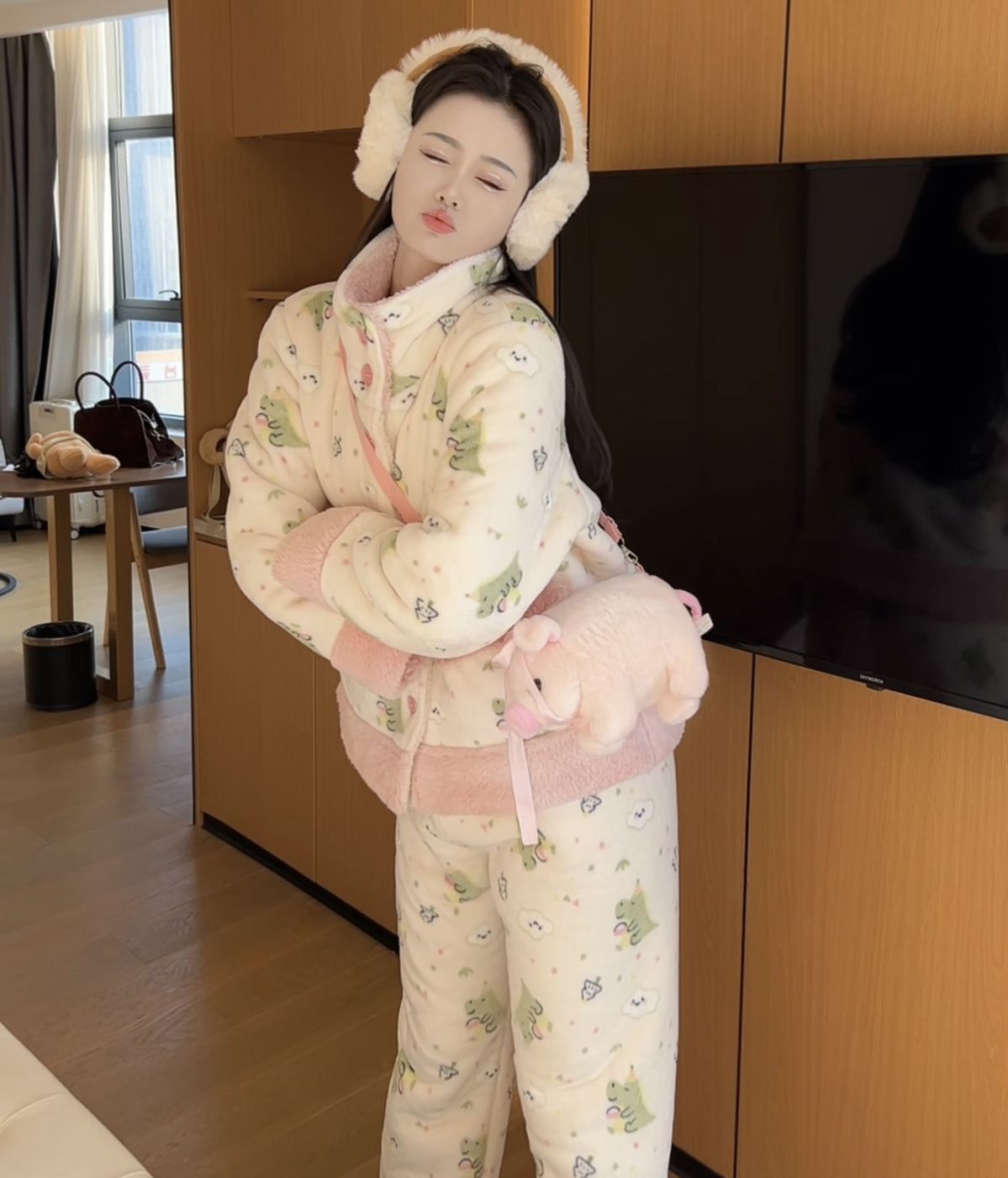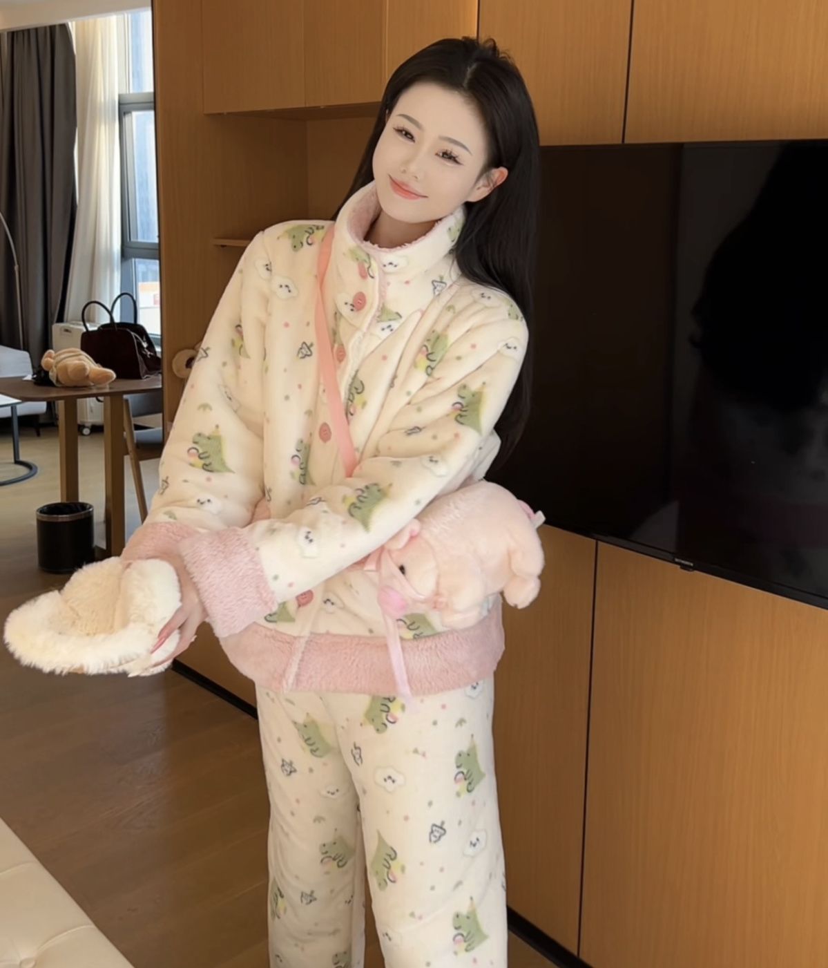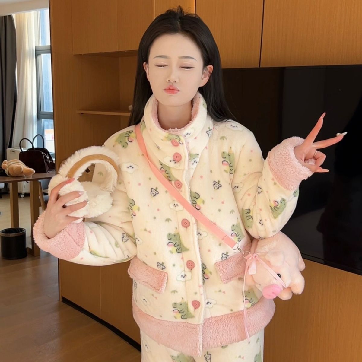 겨울용 두꺼운 보온 공룡 스타일 플러시 잠옷, 하이넥 홈웨어, 여성용, 외출 가능, 귀여운 스타일스토어 가기