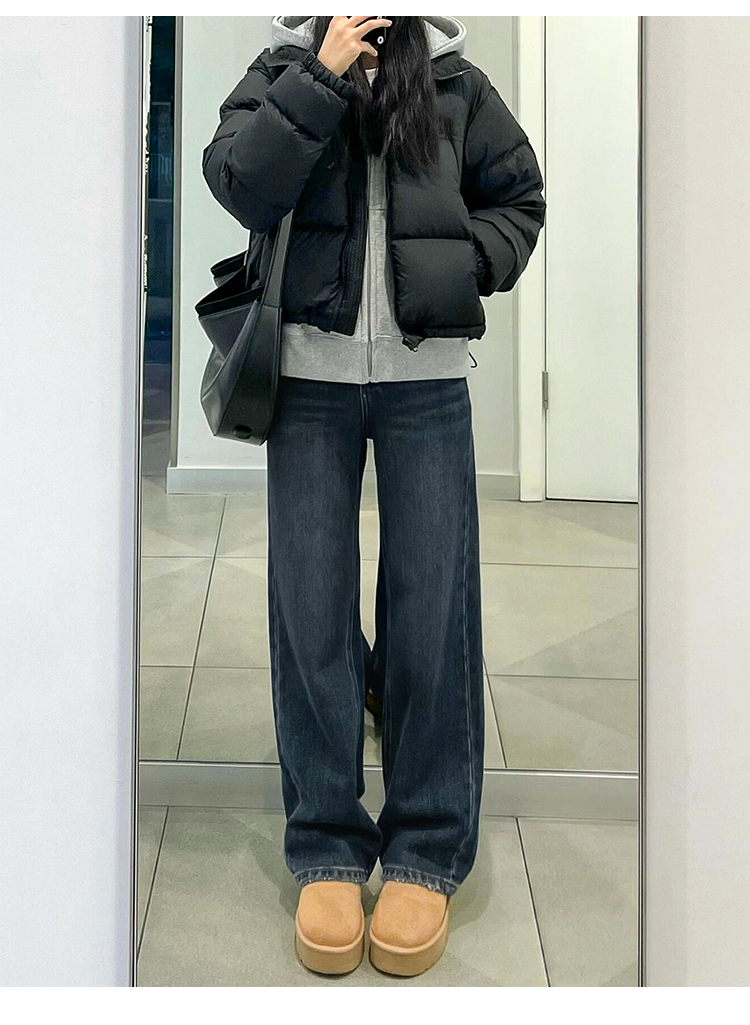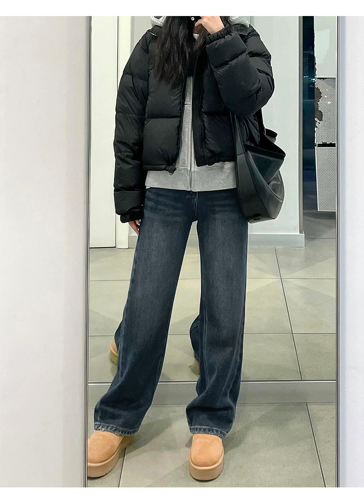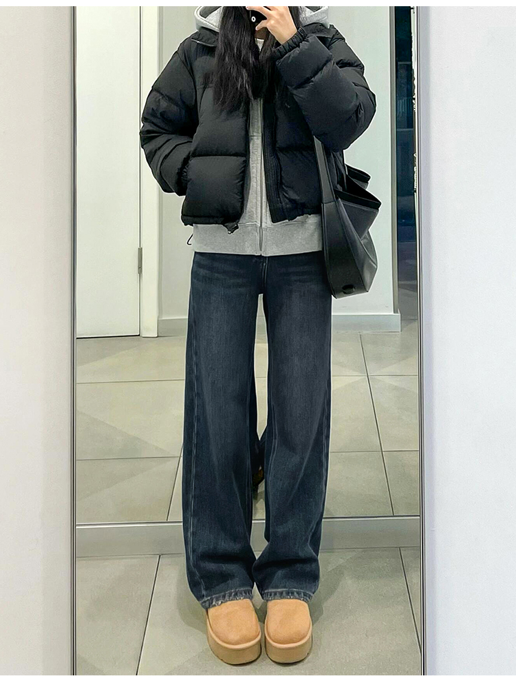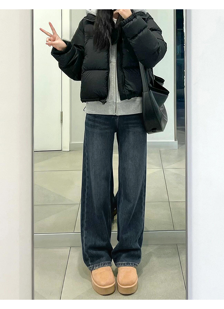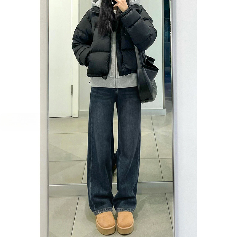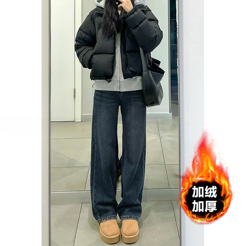 블루 그레이 스트레이트 레그 청바지 여성용 겨울 기모 플러스 사이즈 배 모양의 바디 통통녀 느슨한 슬리밍 좁은 넓은 다리 바지스토어 가기