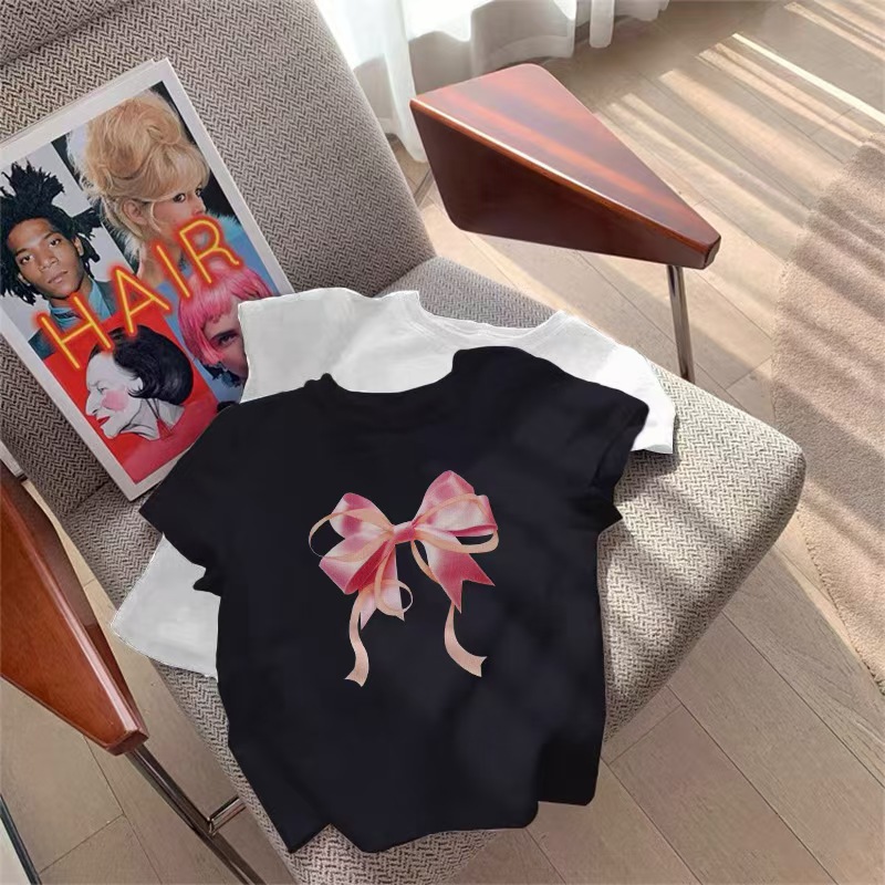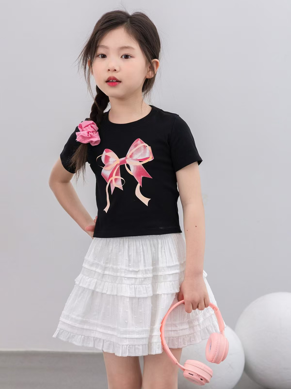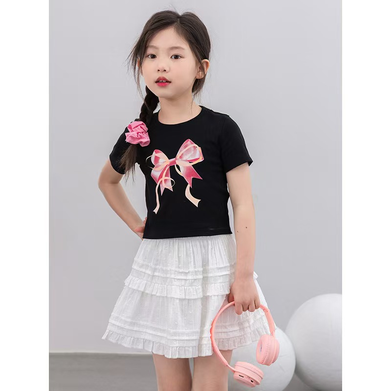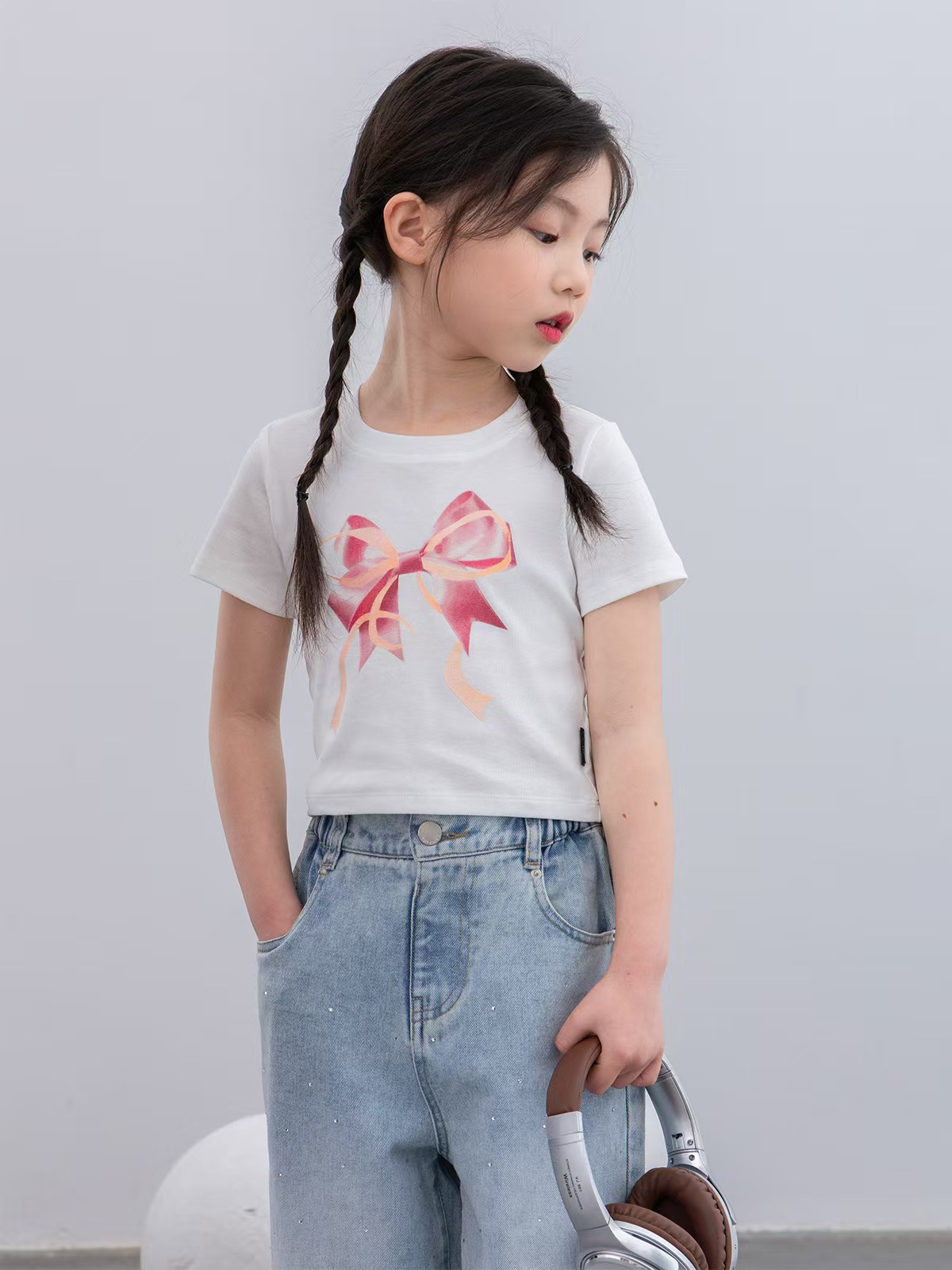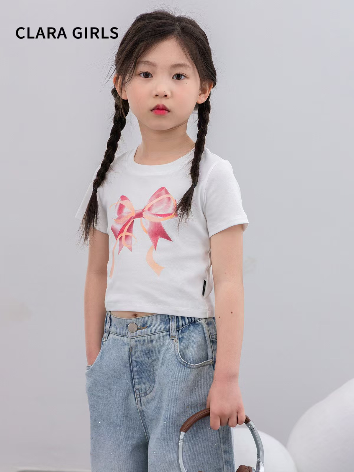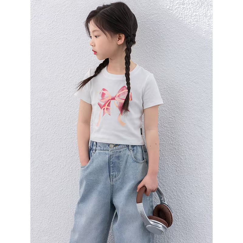 소녀 활 반팔 티셔츠 2025 여름 어린이 슬림 핏 짧은 둥근 목 티셔츠 달콤한 디자인 탑스토어 가기