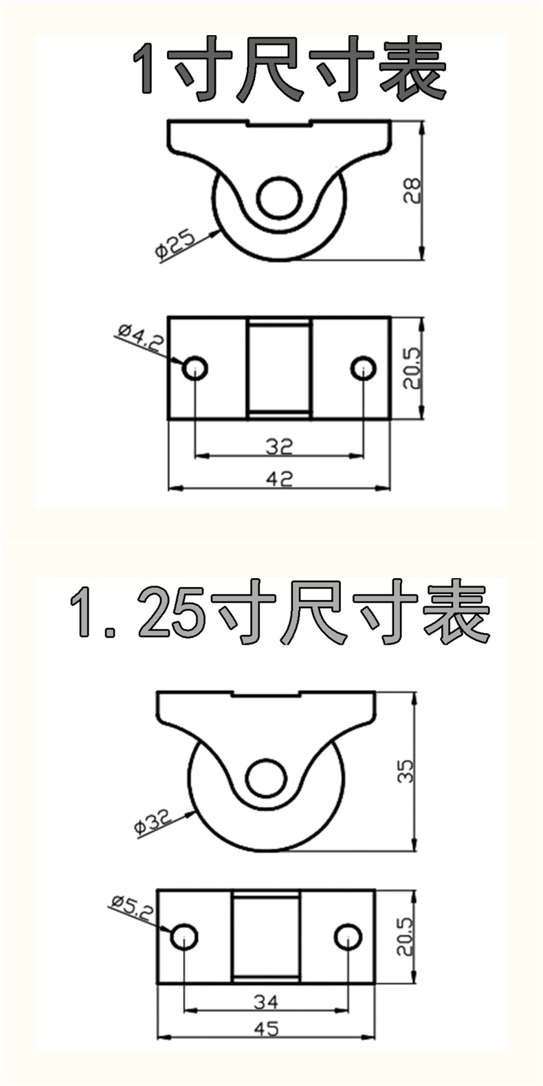 • 수직 장착 휠 0.8inch 갈색 고무 유형(4개)