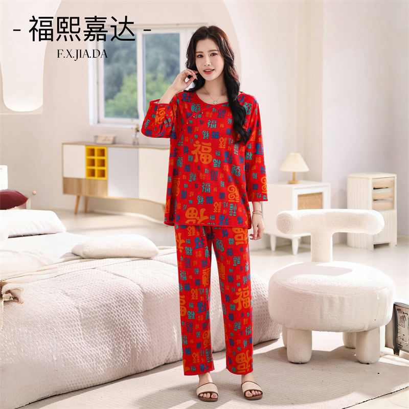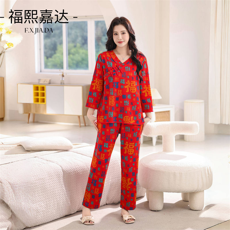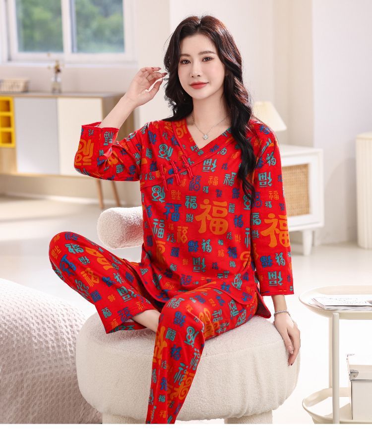 새로운 잠옷 여성의 새로운 중국 스타일 국가 스타일 트랜스 버튼 바이푸 캐릭터 축제 붉은 가족 년 홈 의류 세트 외부 착용