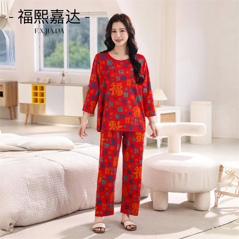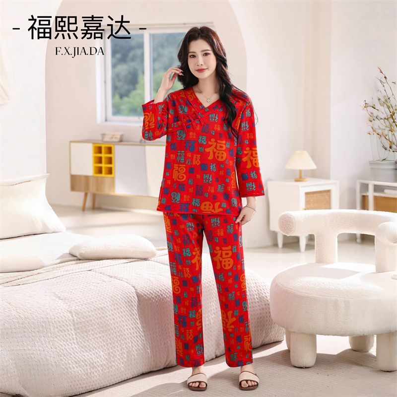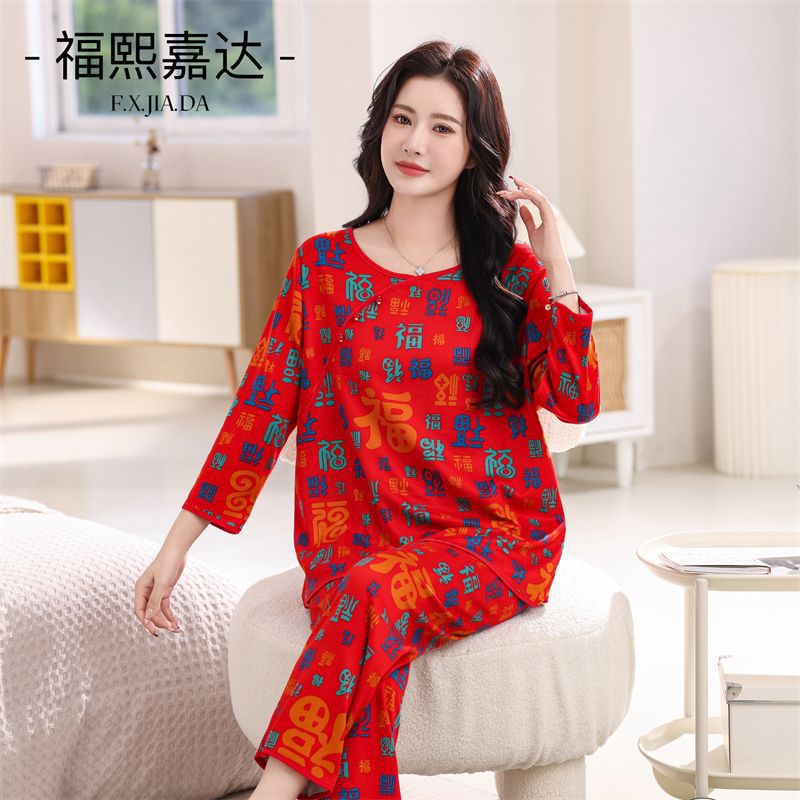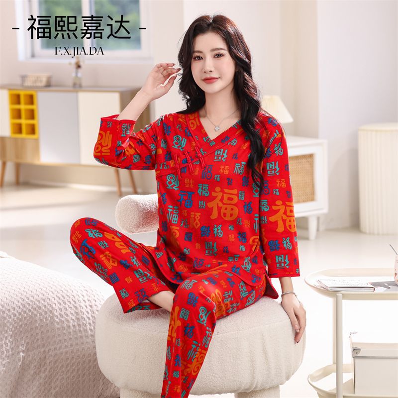 새로운 잠옷 여성의 새로운 중국 스타일 국가 스타일 트랜스 버튼 바이푸 캐릭터 축제 붉은 가족 년 홈 의류 세트 외부 착용스토어 가기