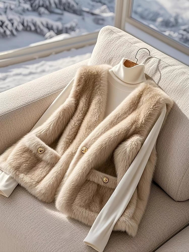 샤넬 스타일 얕은 카키 양고기 양모 조끼 코트 여성용 겨울 외부 착용 작은 밍크 벨벳 원피스 조끼스토어 가기