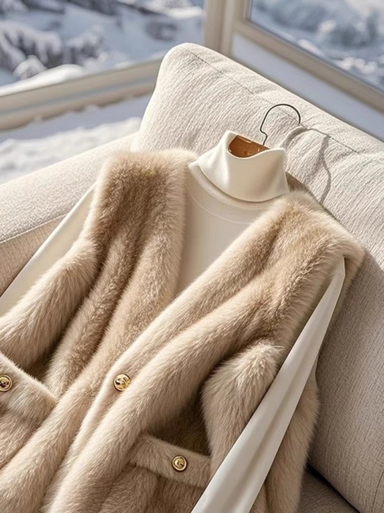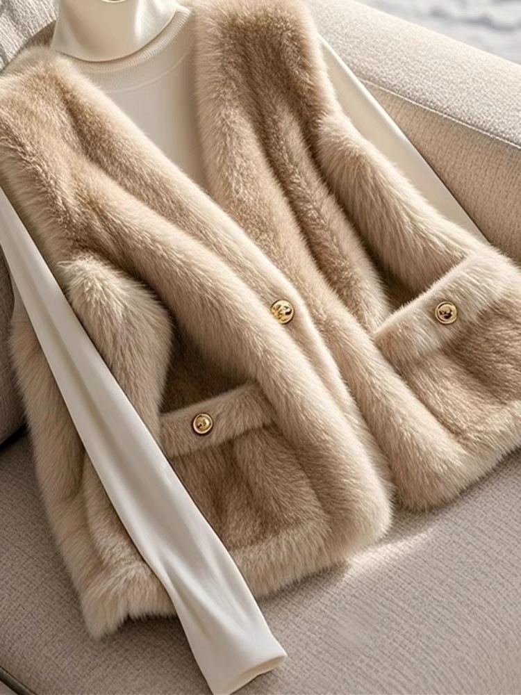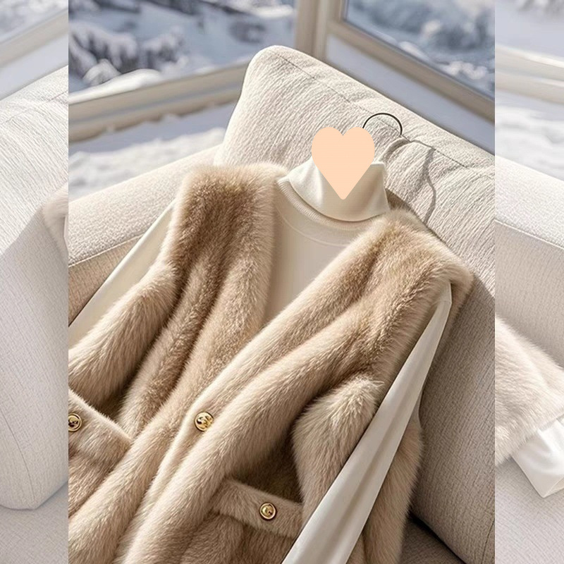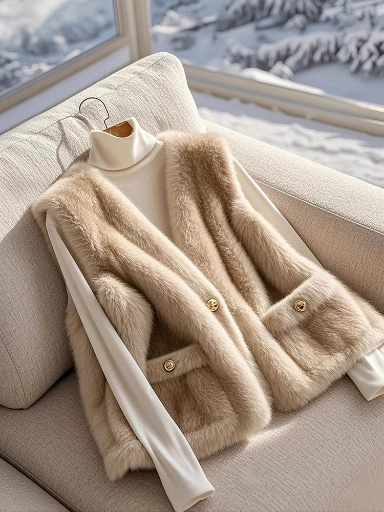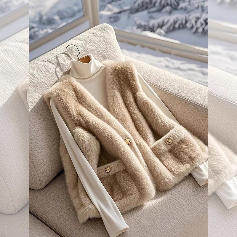 샤넬 스타일 얕은 카키 양고기 양모 조끼 코트 여성용 겨울 외부 착용 작은 밍크 벨벳 원피스 조끼