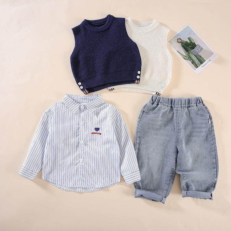 국경 간 아동복 2025 봄과 가을 셔츠와 소년 소녀를위한 조끼 어린 소년 외국식 스웨터 조수 브랜드 세트 3 종 세트