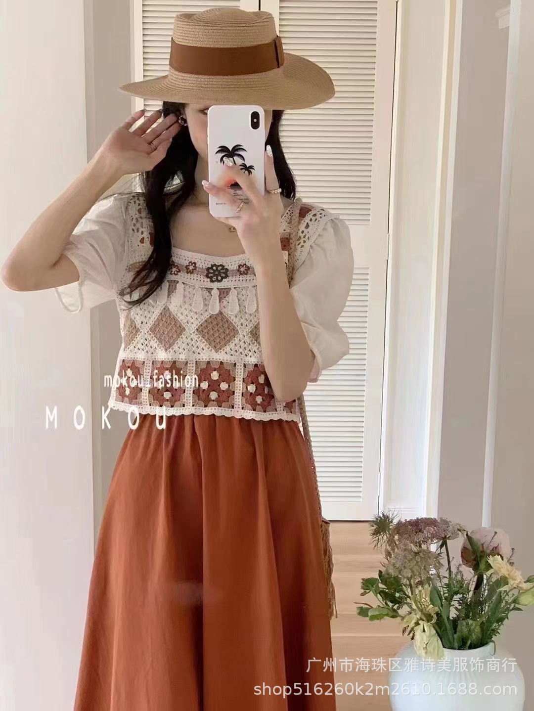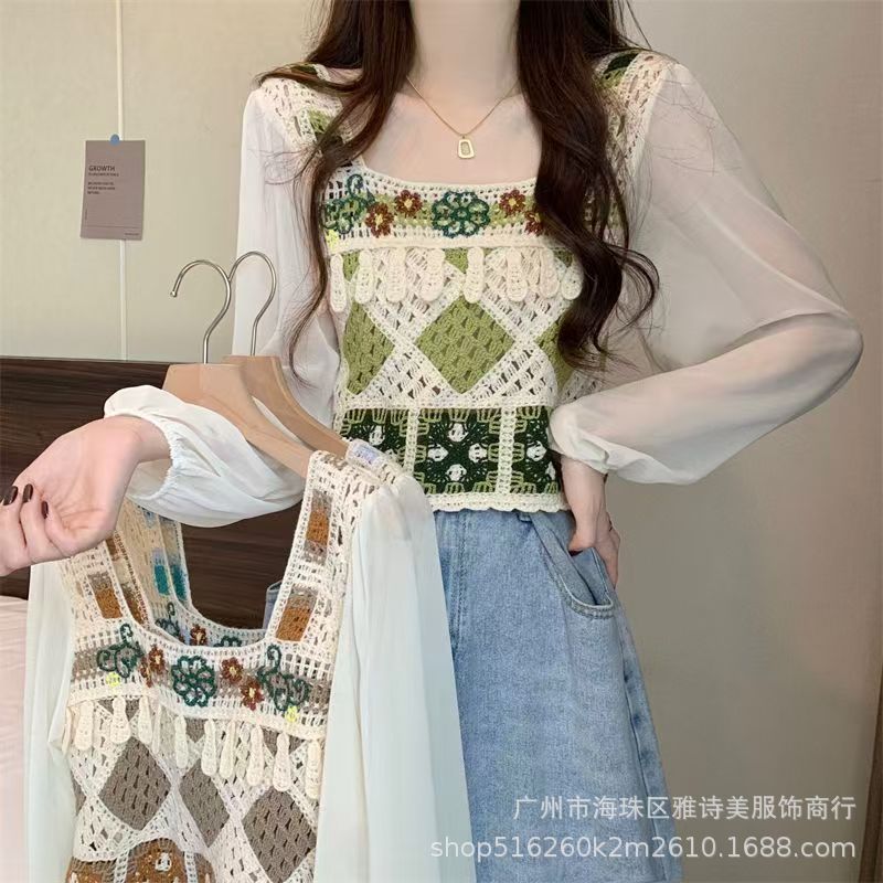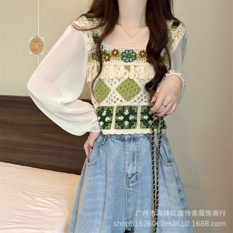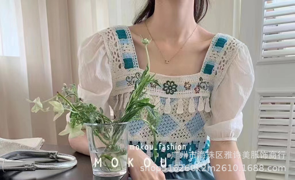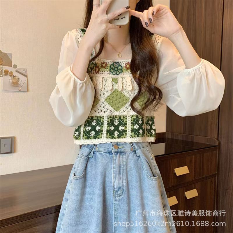 중국 스타일 빈티지 스티칭 퍼프 슬리브 쉬폰 셔츠 여성의 봄 새로운 디자인 센스 크로 셰 뜨개질 할로우 우아한 최고 트렌디스토어 가기