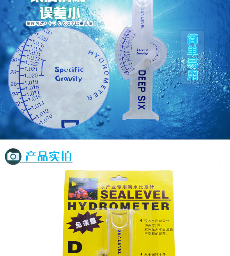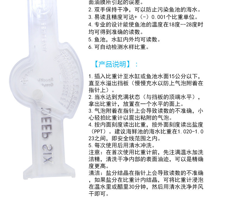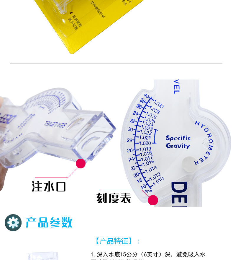 1,插入比重计至水缸或鱼池15公分以下,直至水溢出档板。