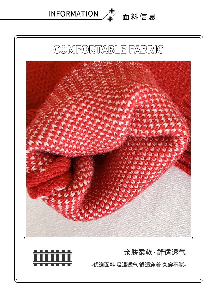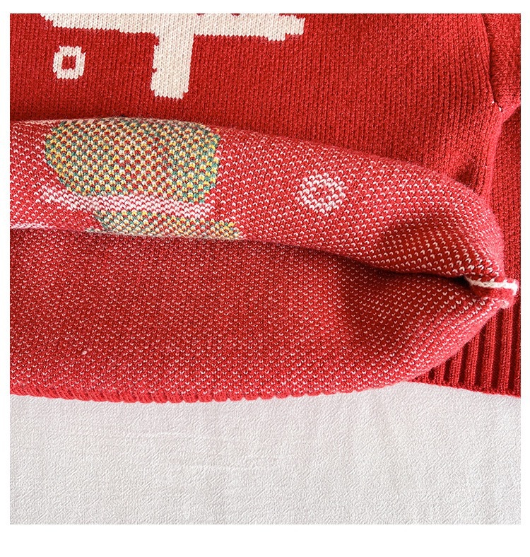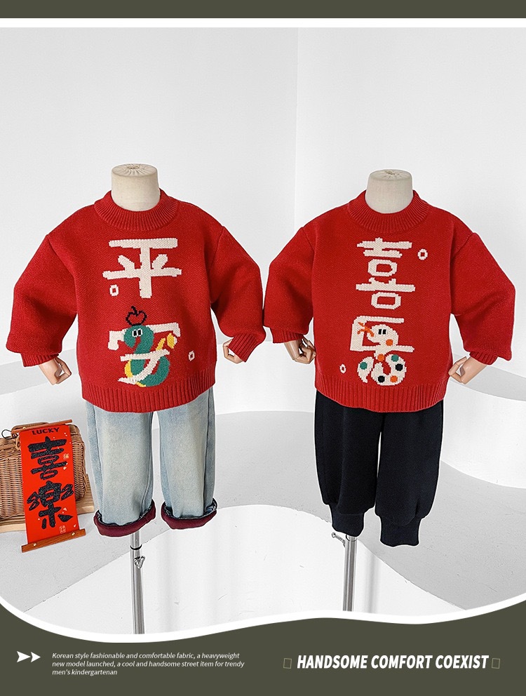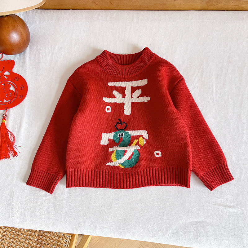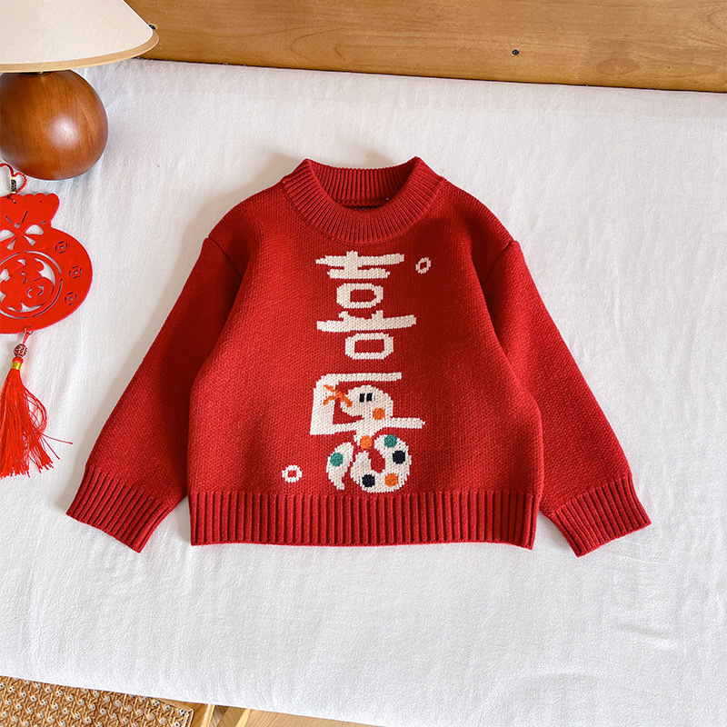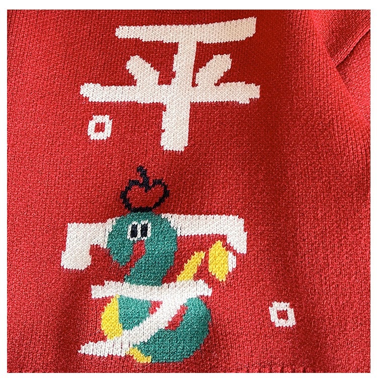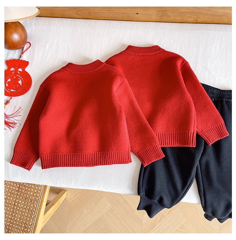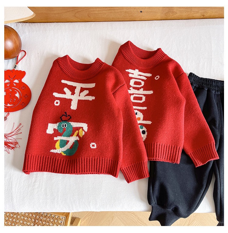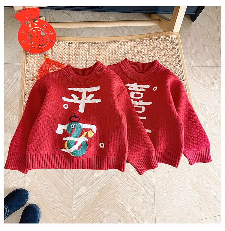 2025 겨울 새 아동복 어린이 신년복 핑 조이 소녀 레드 스웨터 소년의 두꺼운 니트 스웨터