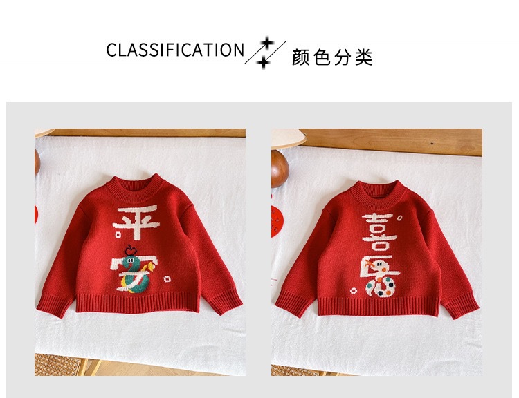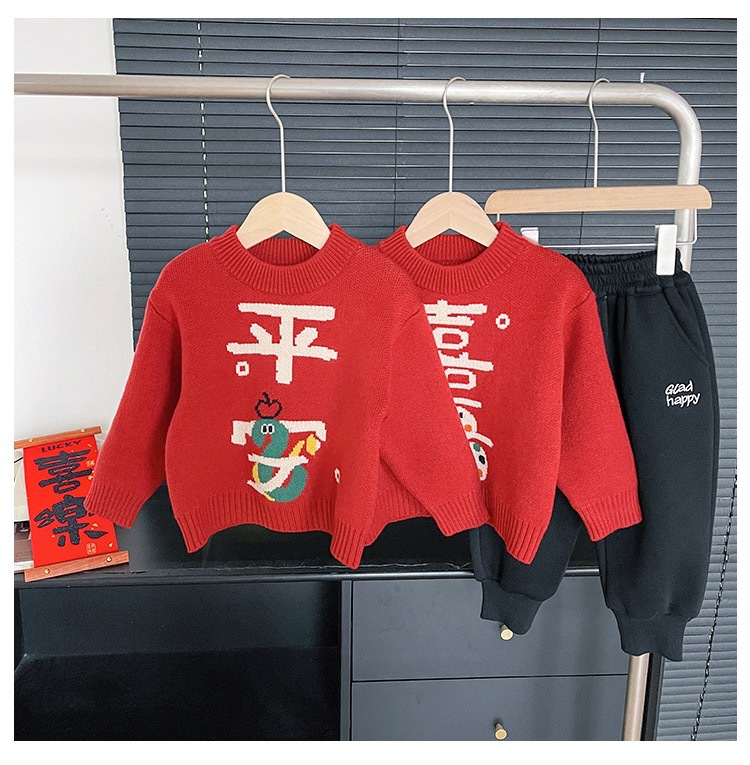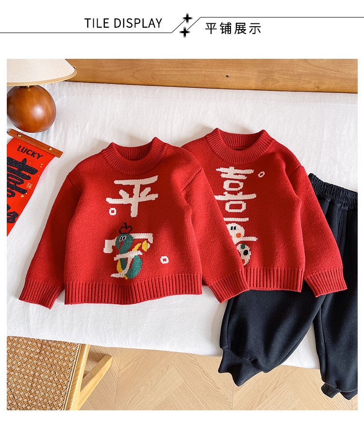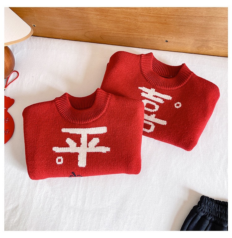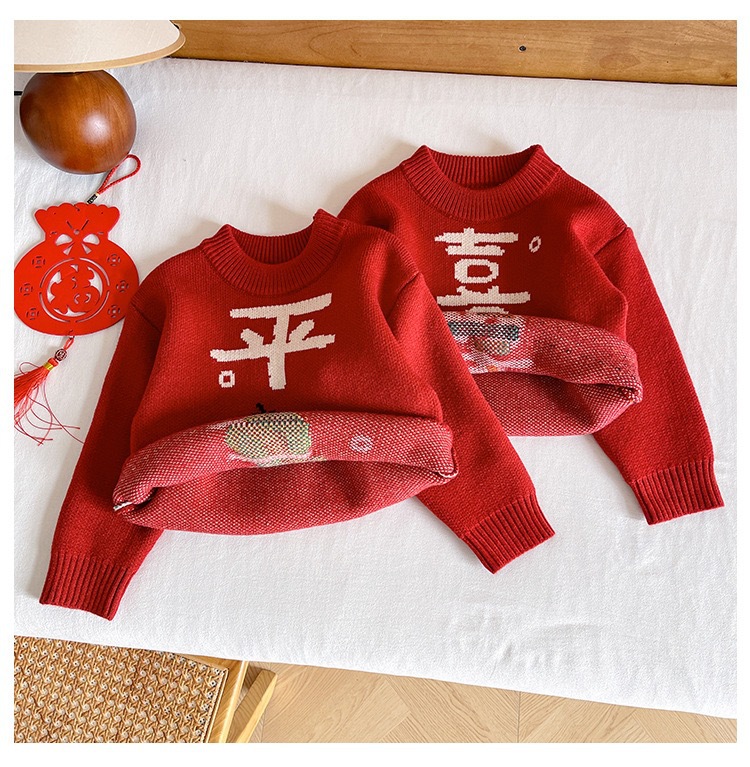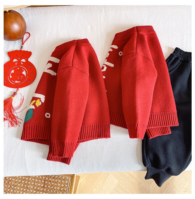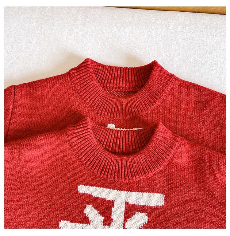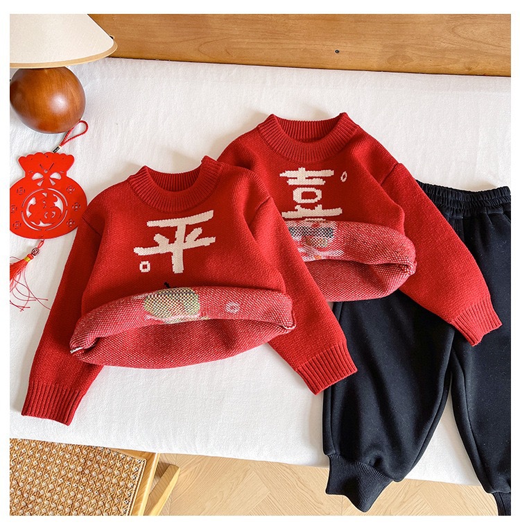 2025 겨울 새 아동복 어린이 신년복 핑 조이 소녀 레드 스웨터 소년의 두꺼운 니트 스웨터스토어 가기