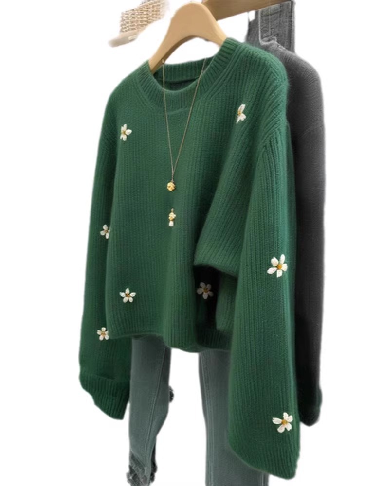 디자인 센스 다크 그린 꽃 자수 니트 스웨터 웨스턴 스타일 독특한 세련된 아름다운 우아한 봄 여성 탑