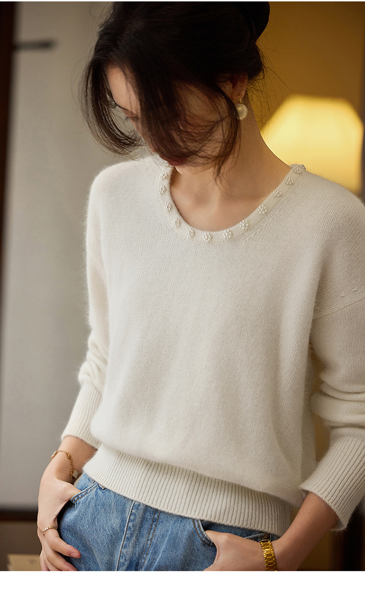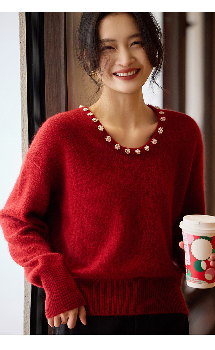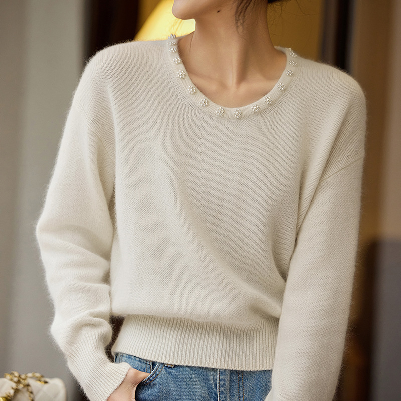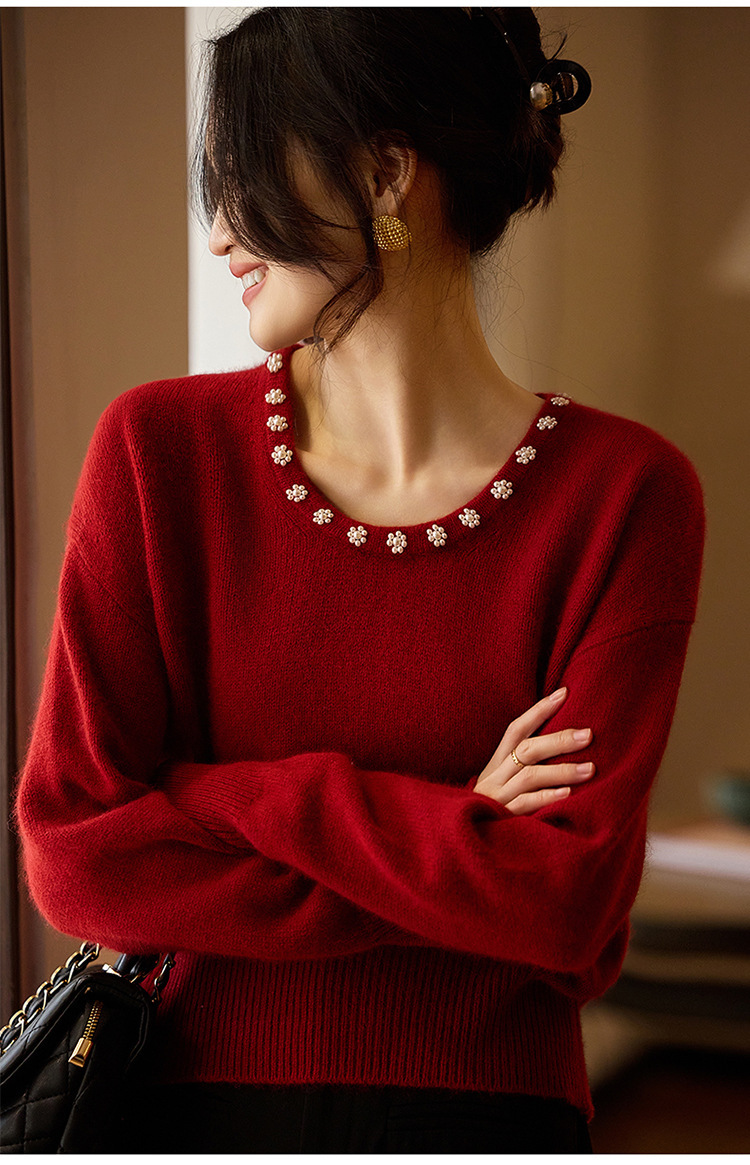 여성을위한 새로운 순수 양모 크루 넥 니트 셔츠 목 구슬 디자인 통근 샤넬 스타일 풀오버 스웨터스토어 가기