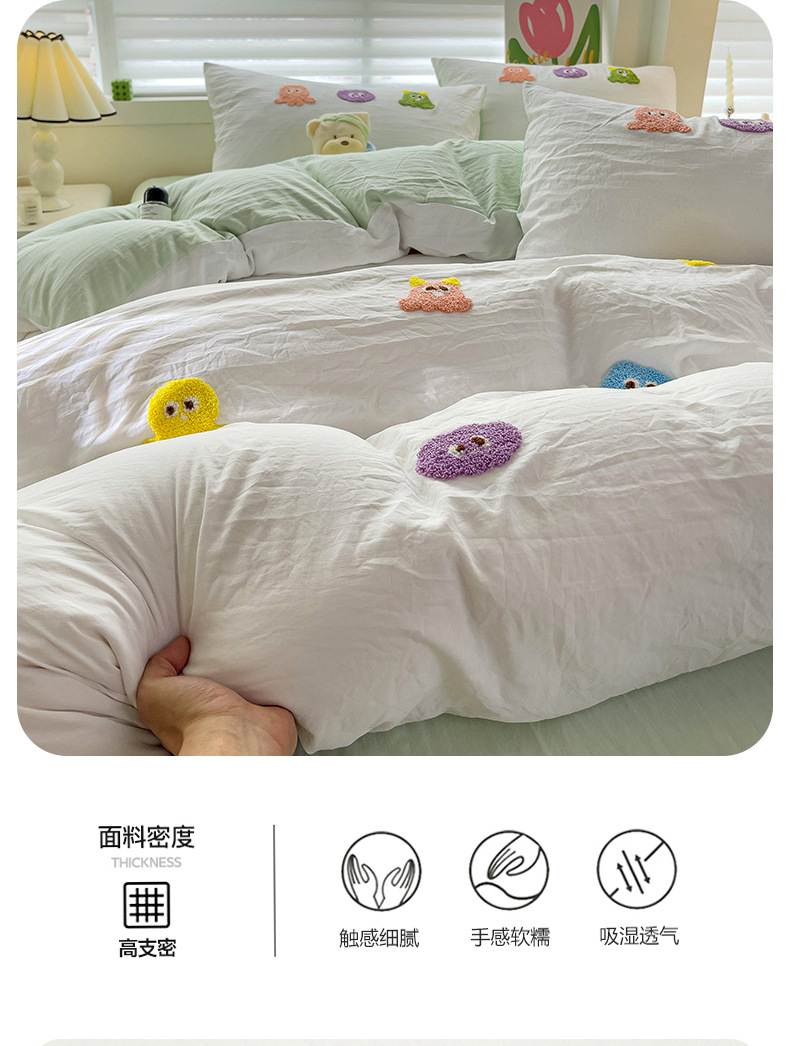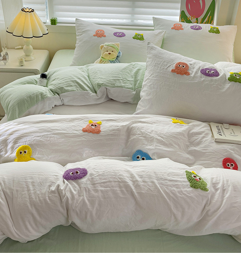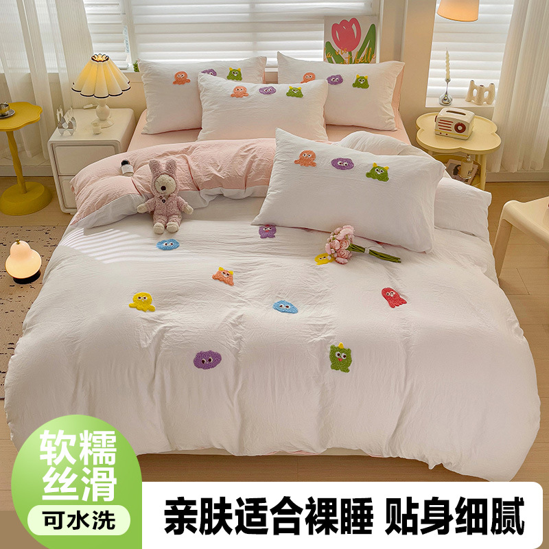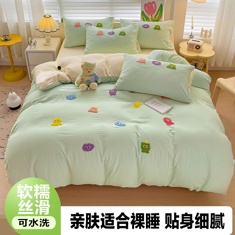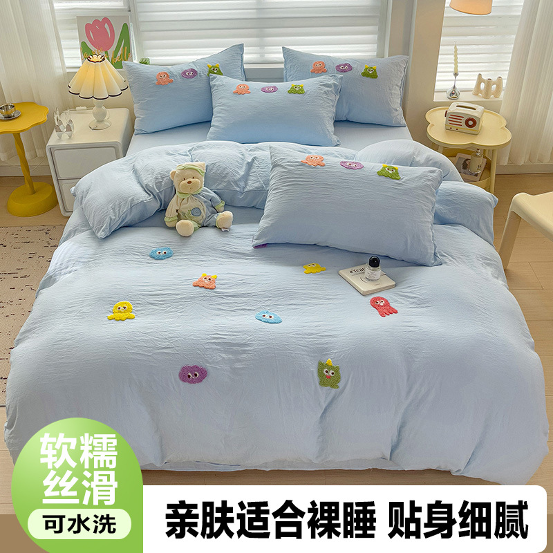 슈퍼 소프트 클라우드 느낌 세척 코튼 타월 자수 4 피스 세트 싱글 더블 사계절 학생 기숙사 3 피스 퀼트 커버