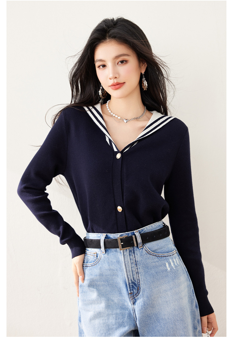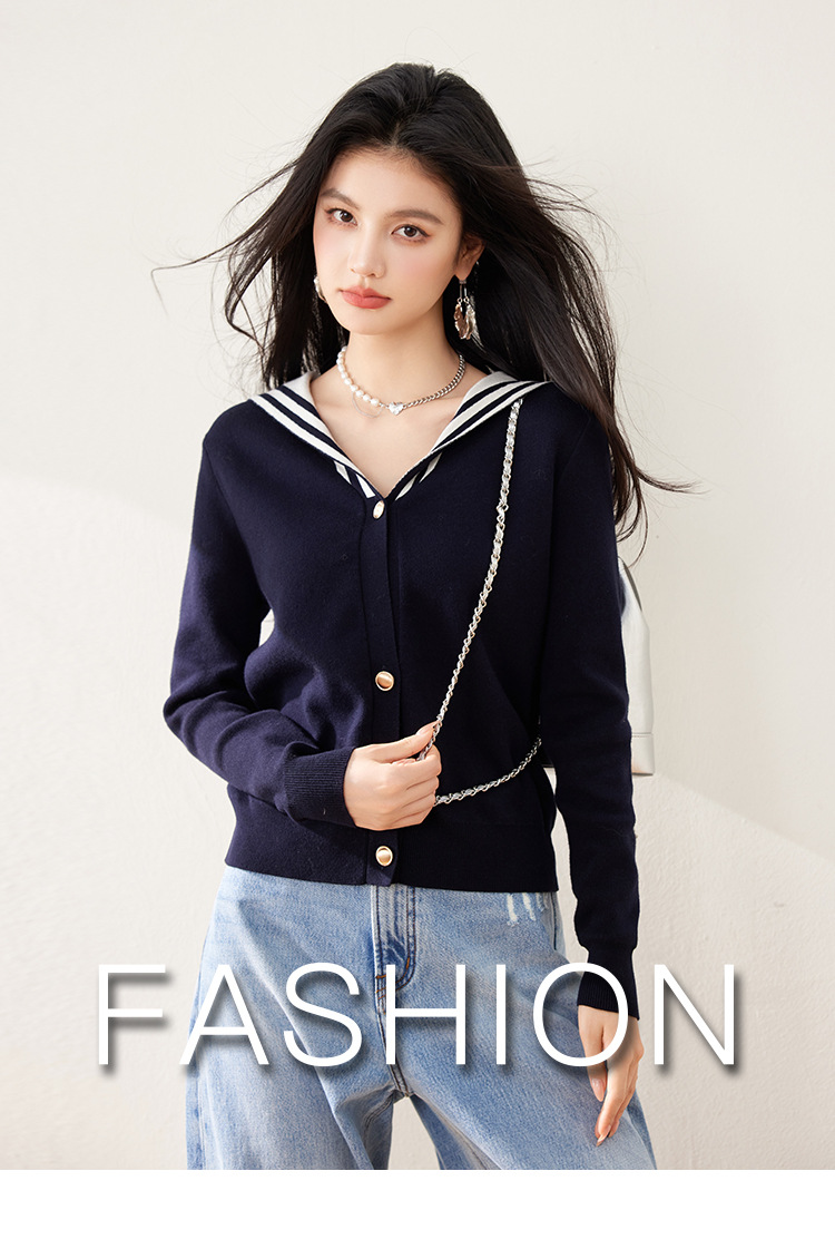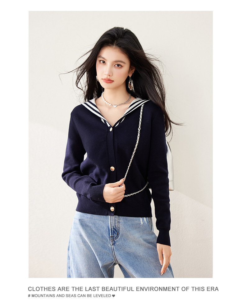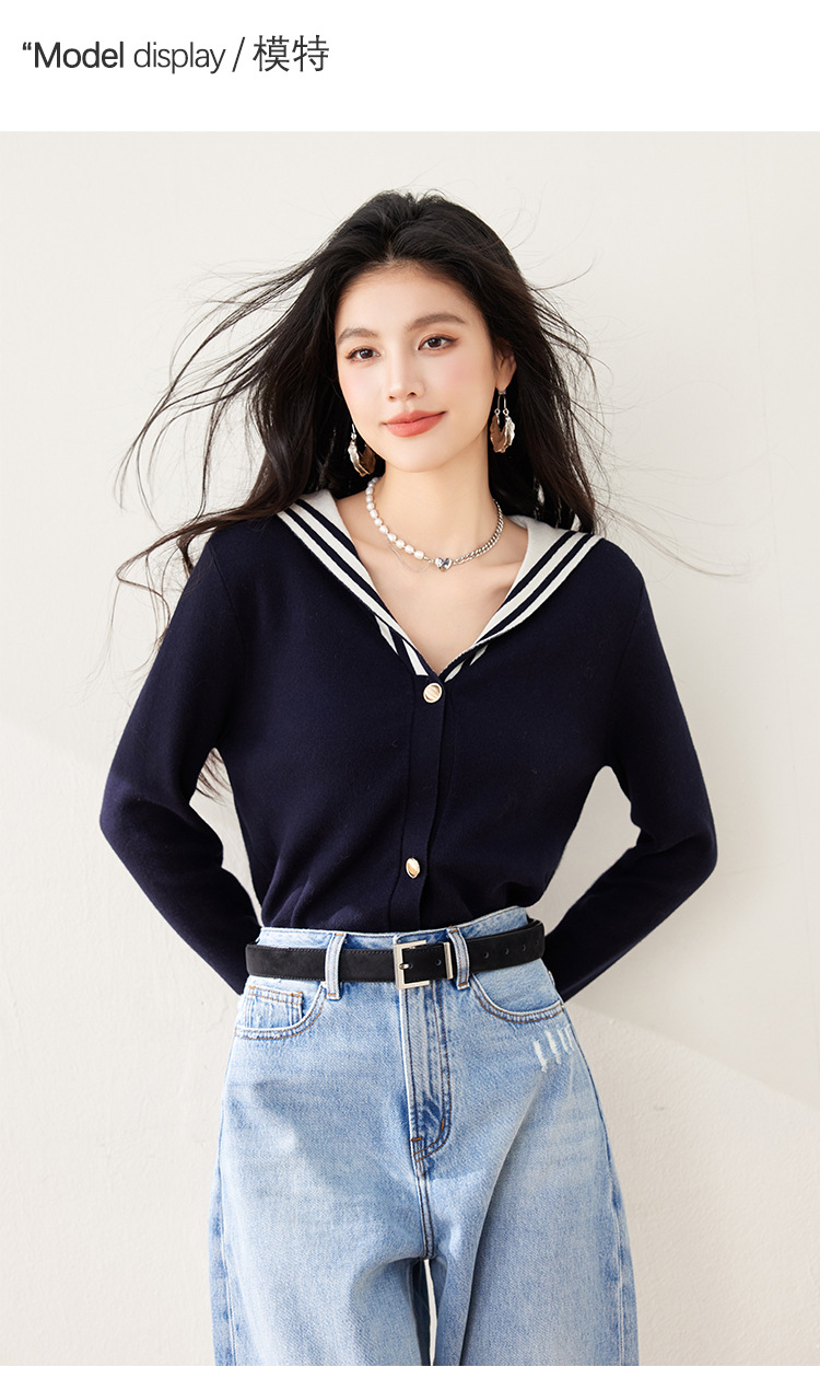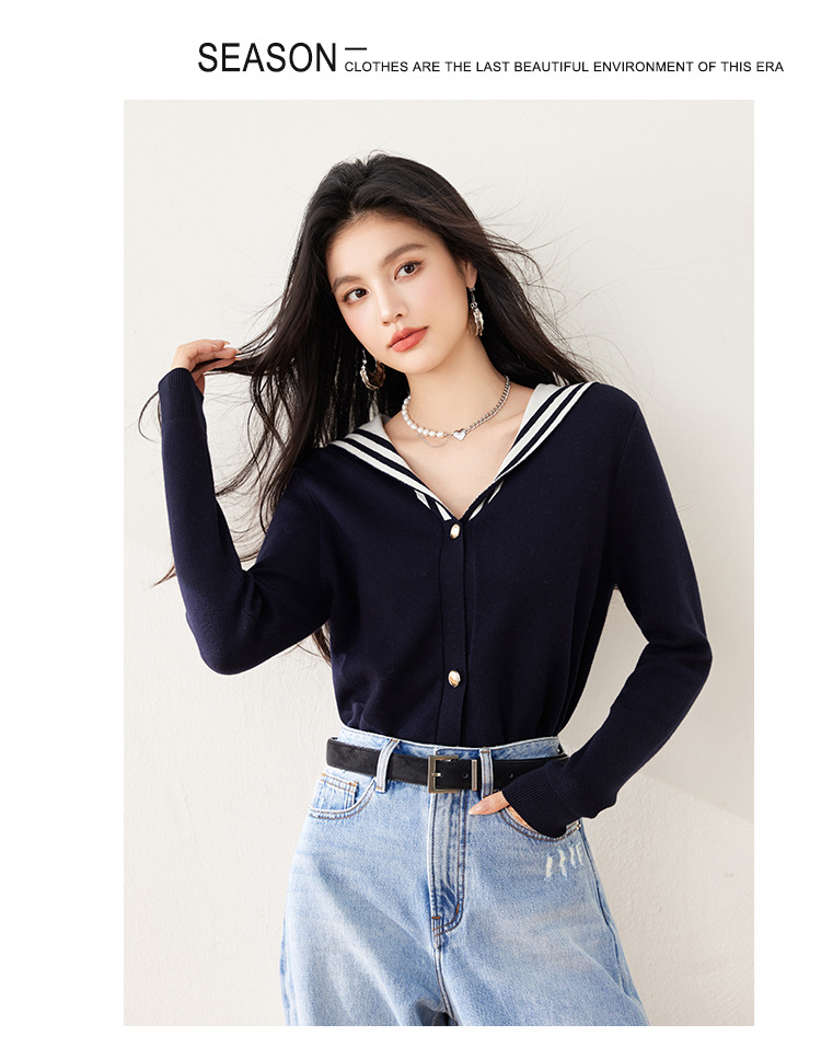 2025 년 봄 새로운 통근 착용 해군 목 틈새 디자인 니트 카디건 긴 소매 여성을위한 우아한 탑
