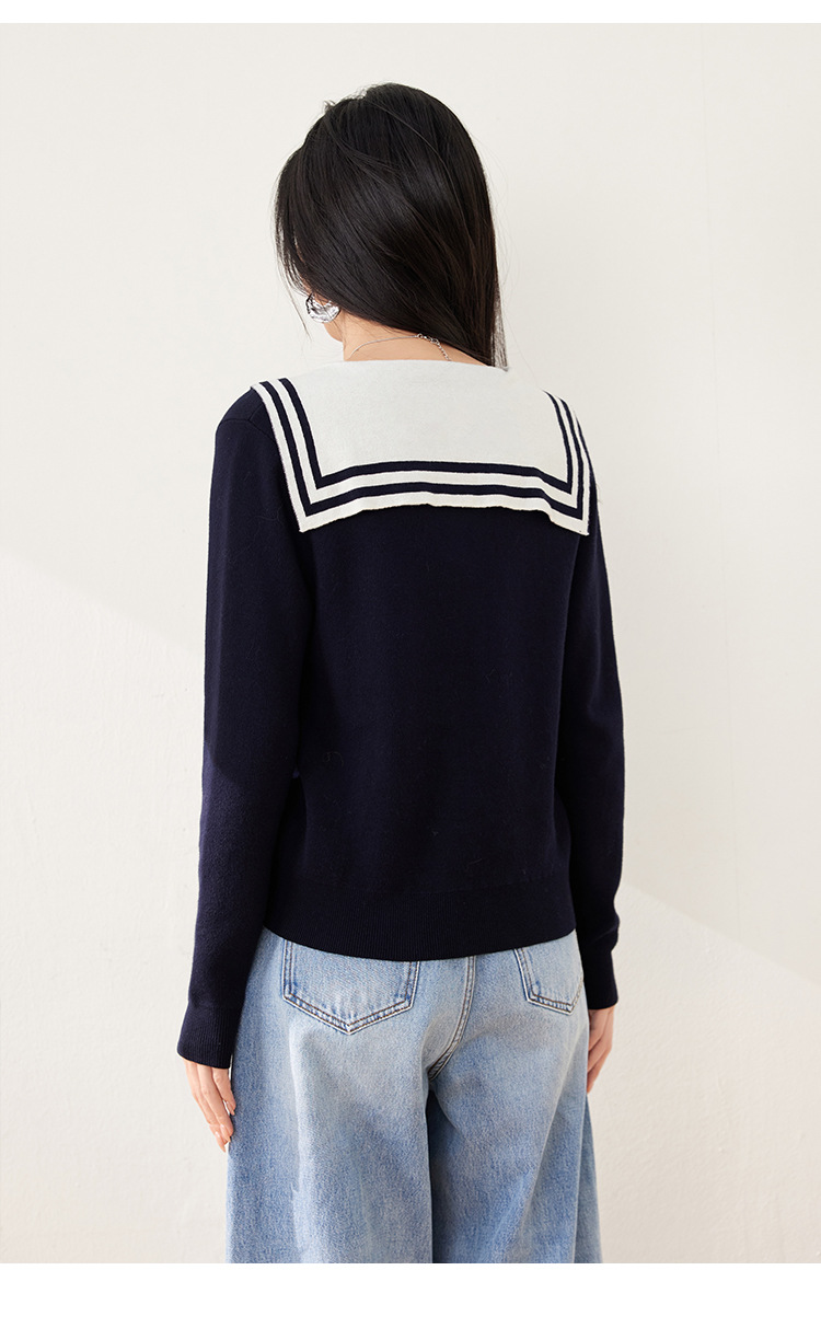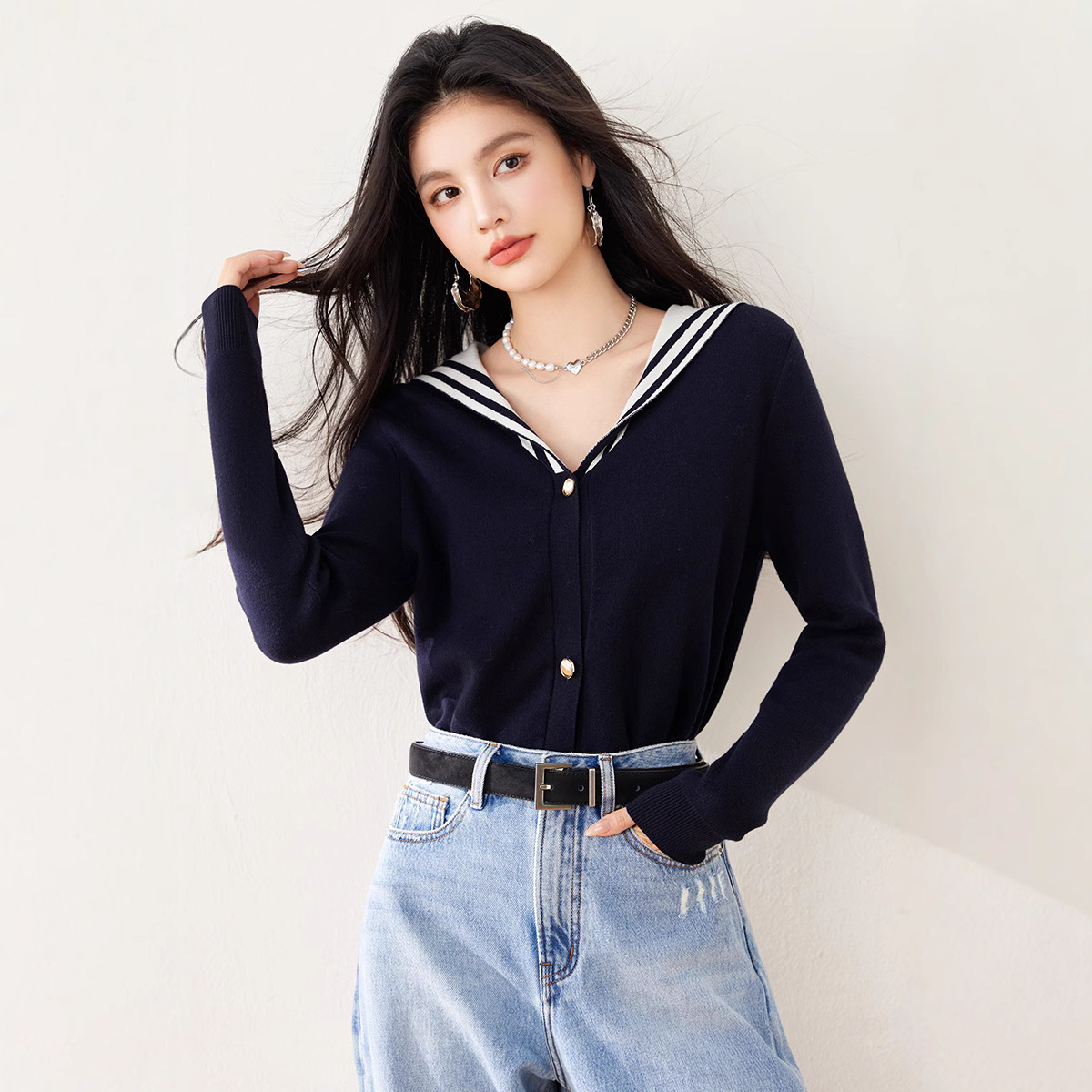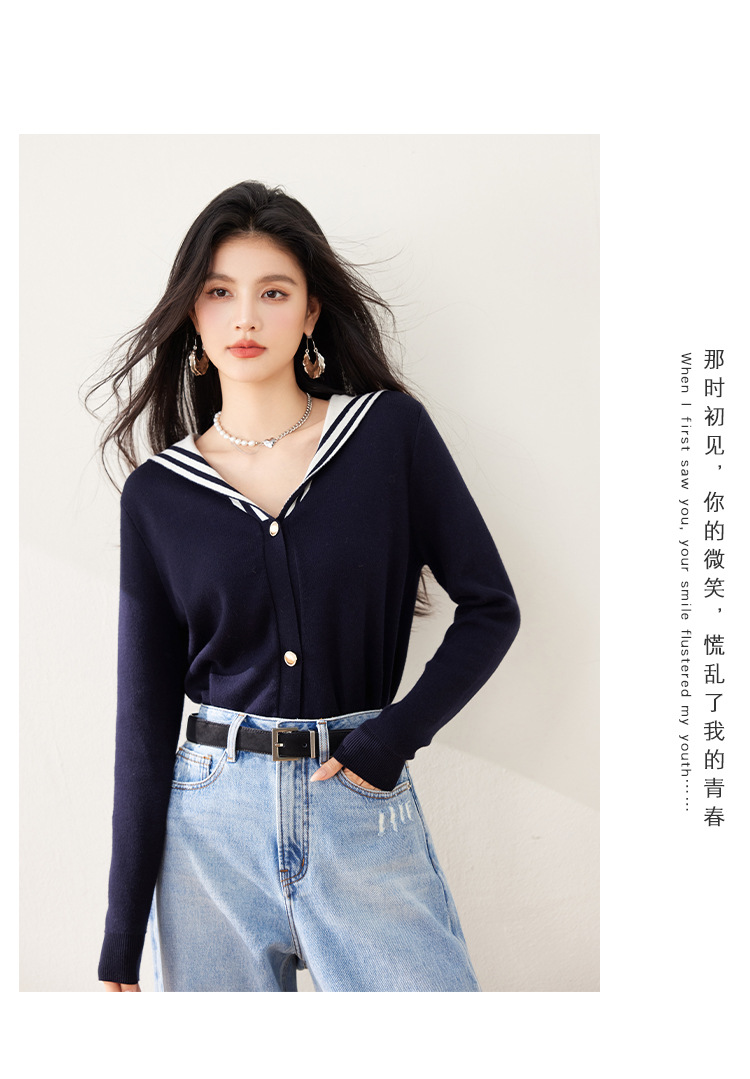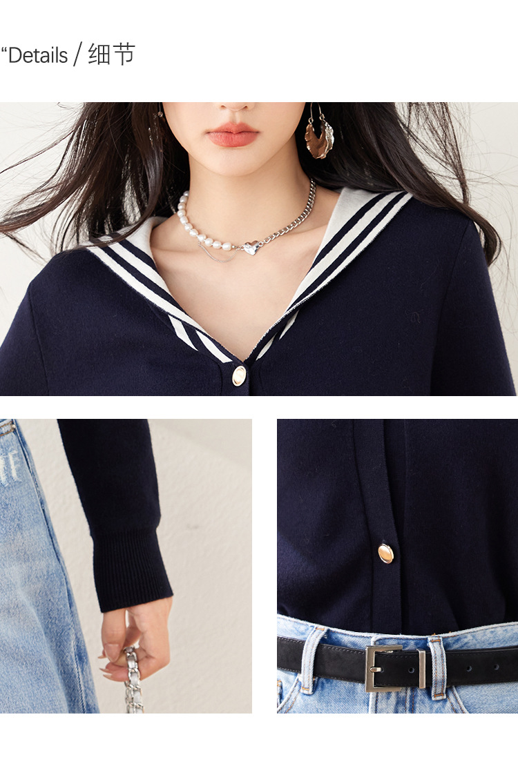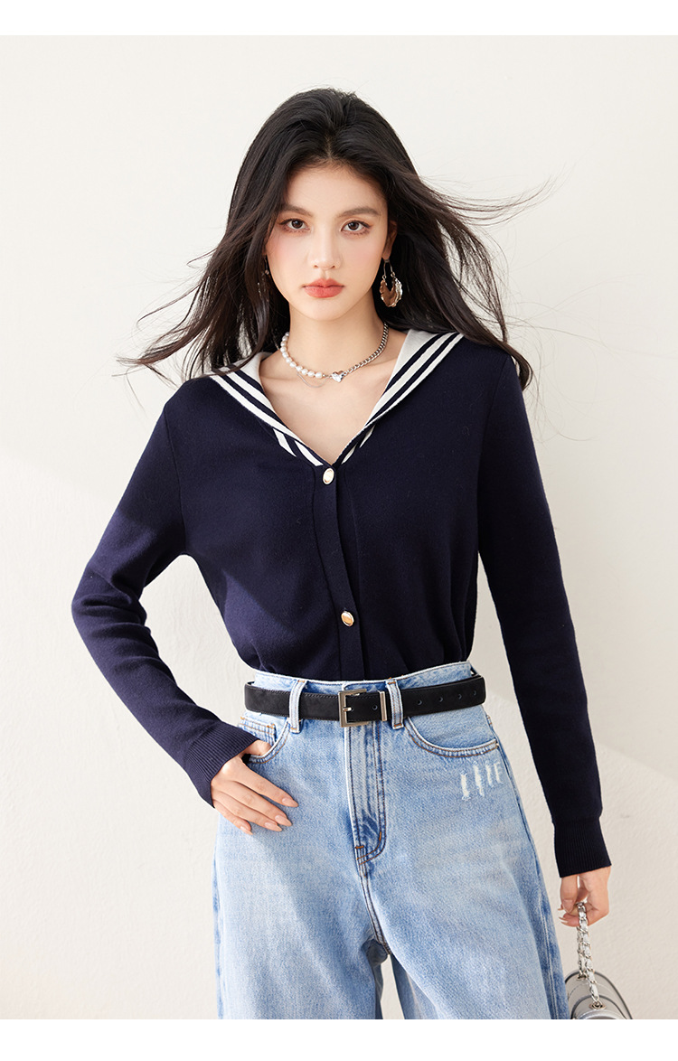 2025 년 봄 새로운 통근 착용 해군 목 틈새 디자인 니트 카디건 긴 소매 여성을위한 우아한 탑
