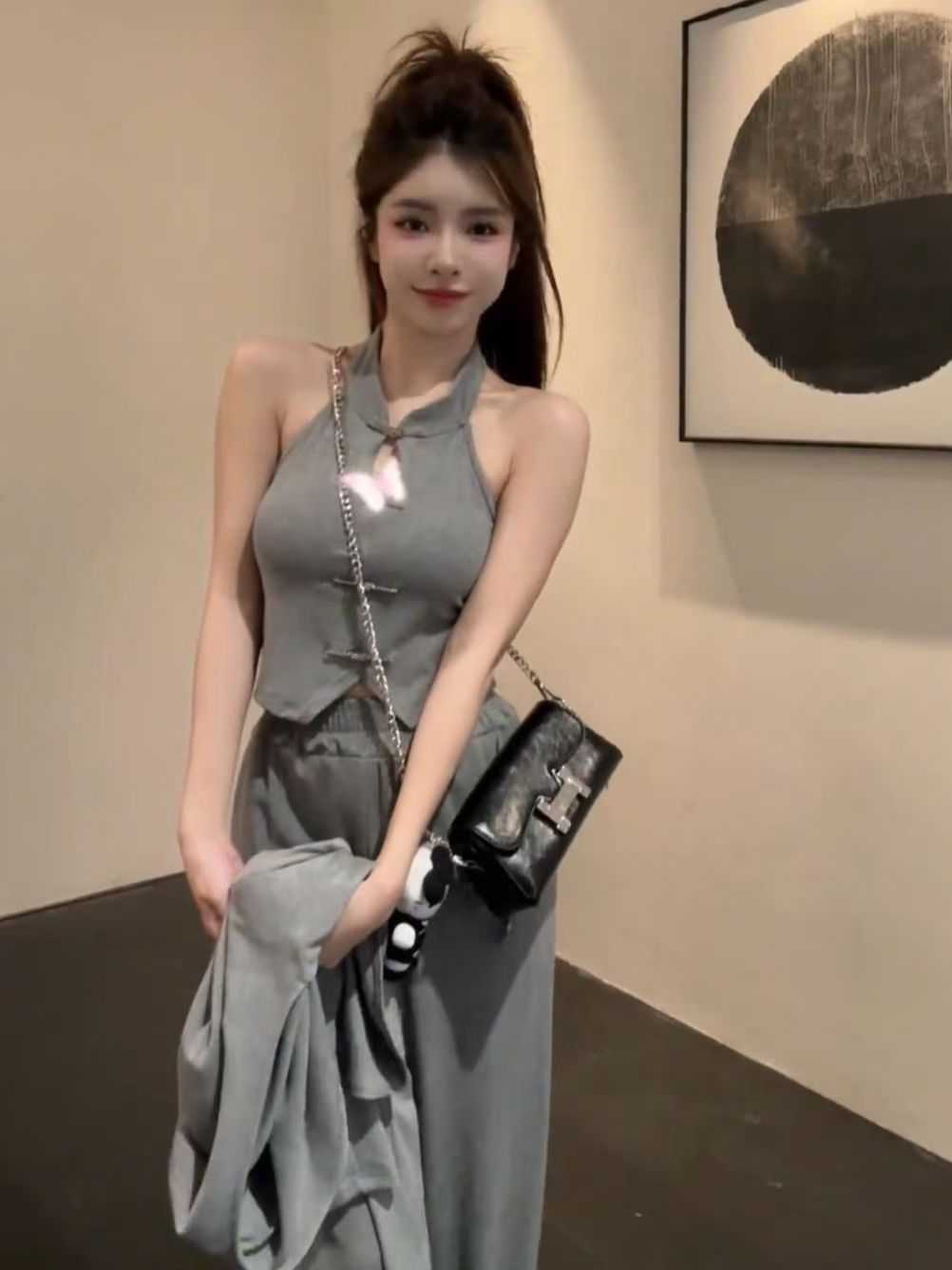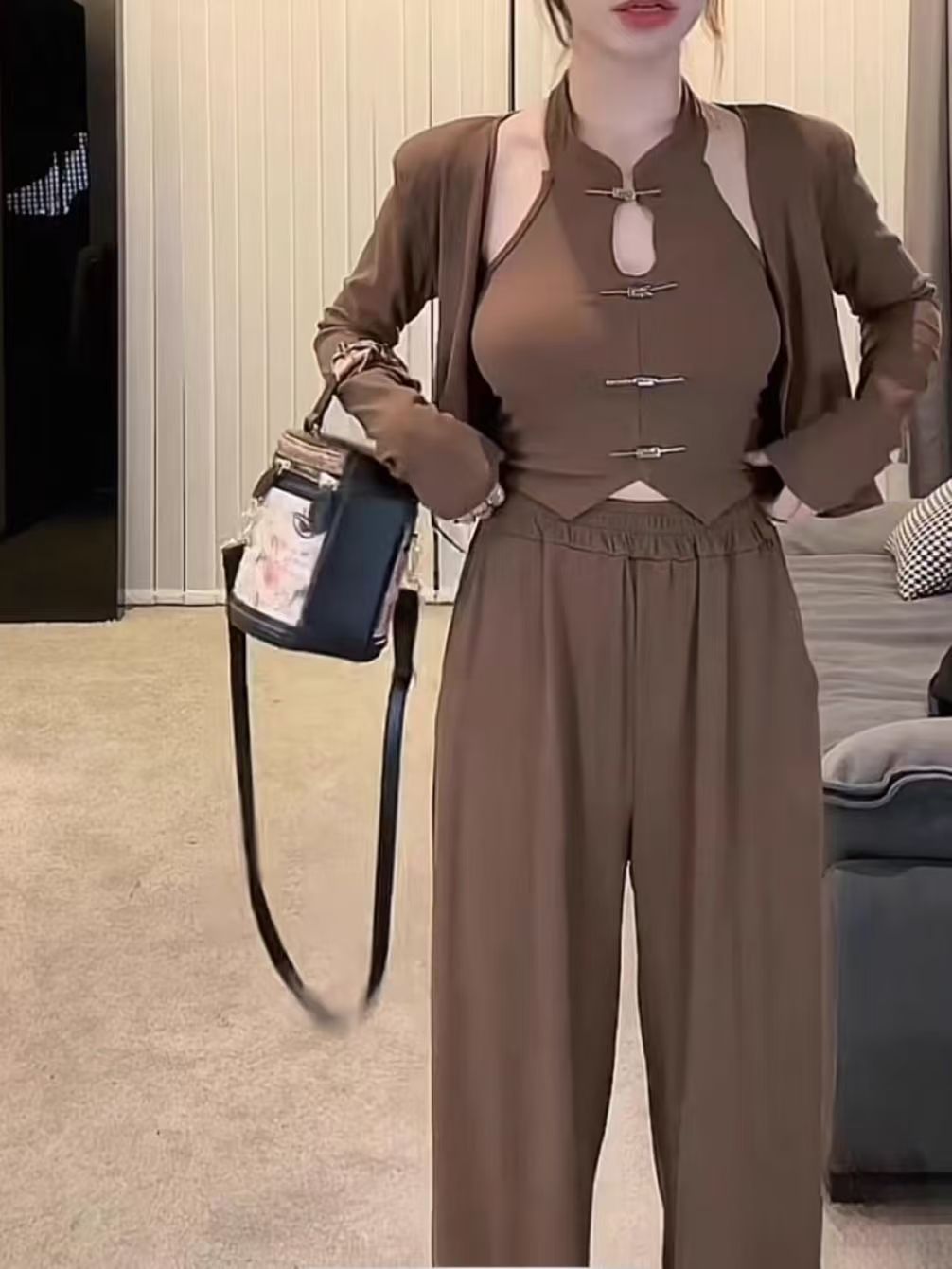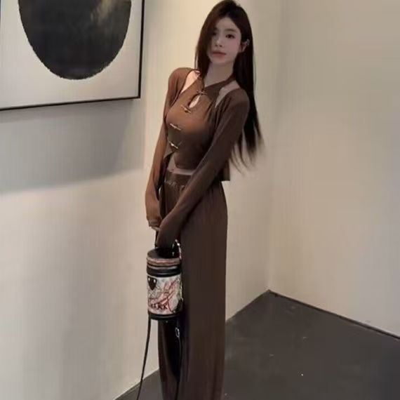 새로운 중국 스타일 세트 여성의 2025 새로운 봄 국가 스타일 중공 목 조끼 긴 소매 최고 캐주얼 3 조각 유행 세트
