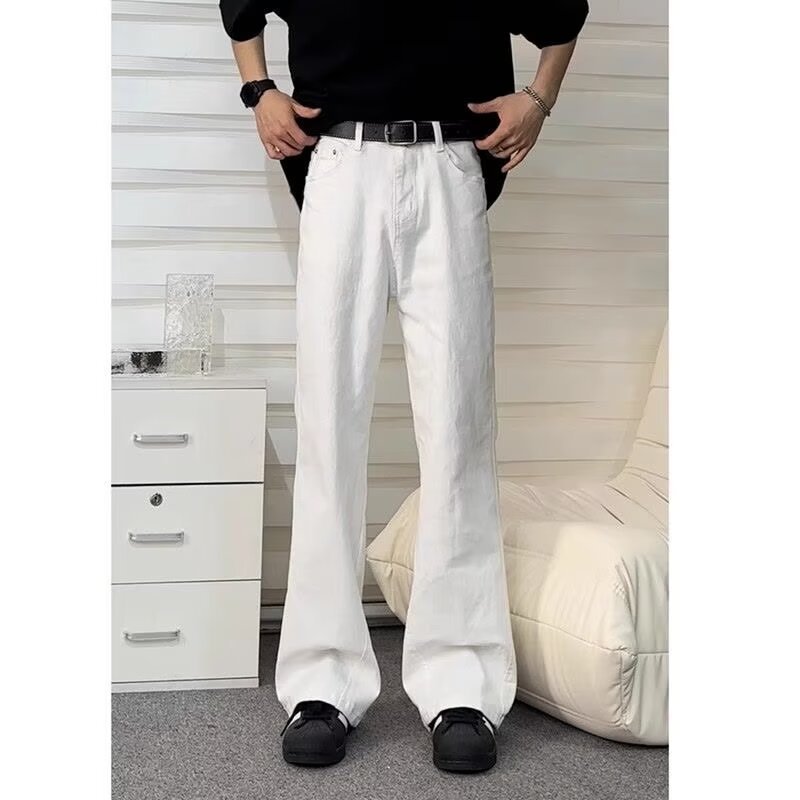 고급 화이트 스트레치 패브릭 마이크로 청바지 Ins 트렌디 한 스트레이트 루즈 바지 캐주얼 틈새 바지