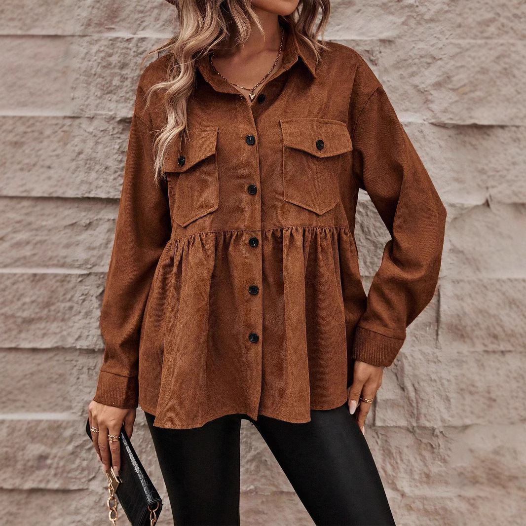 유럽과 미국 여성의 2 색 버튼 코듀로이 재킷 수직 칼라 더블 포켓 헴 루즈 밴드 캐주얼 홀리데이 스타일 탑