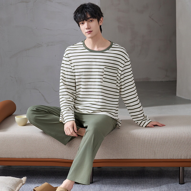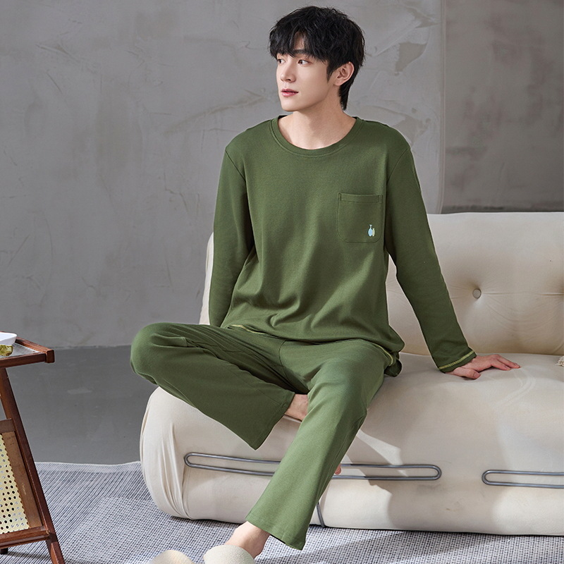 클래스 A 항균 순면 잠옷 남자 봄과 가을 긴팔 크루 넥 풀오버 남자 다리 플러스 사이즈 의상 홈 옷
