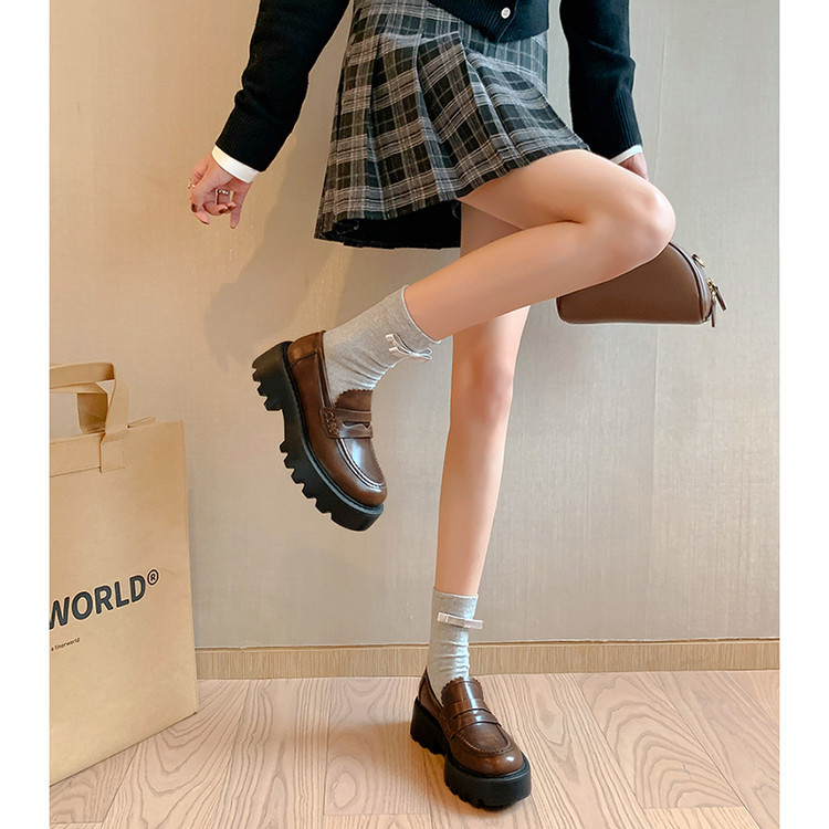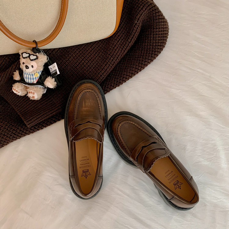 두꺼운 밑창 풀 가죽 작은 가죽 신발 여성의 대학 스타일 스폰지 케이크 싱글 레이어 신발 이른 봄 새 가죽 내부 및 외부 풀 가죽 라운드 발가락 미드 힐 여성용 싱글 레이어 신발