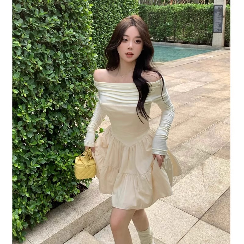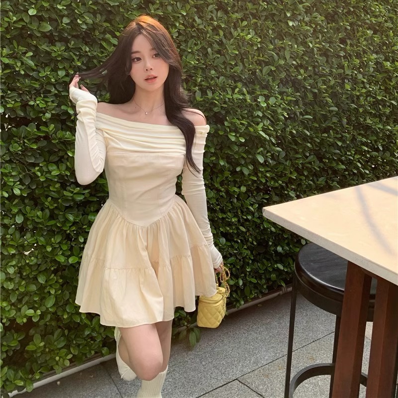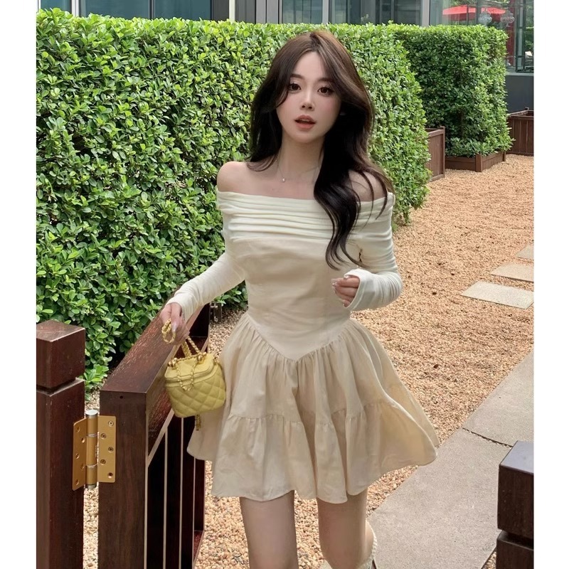 순수한 욕망 스파이스 소녀 오프 숄더 긴팔 원피스 여성 2025 봄 우아한 팝 스커트 허리 짧은 치마스토어 가기