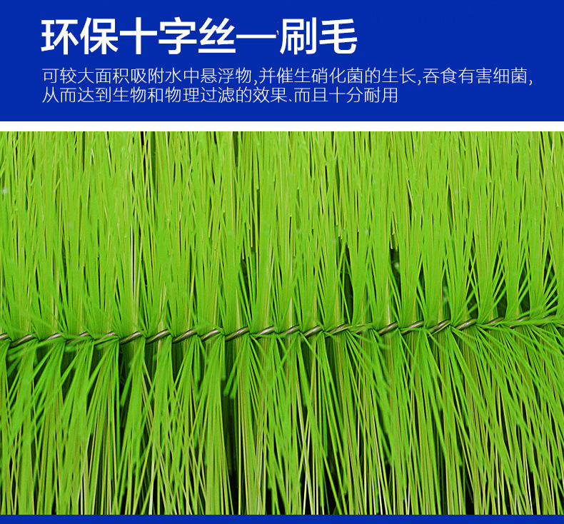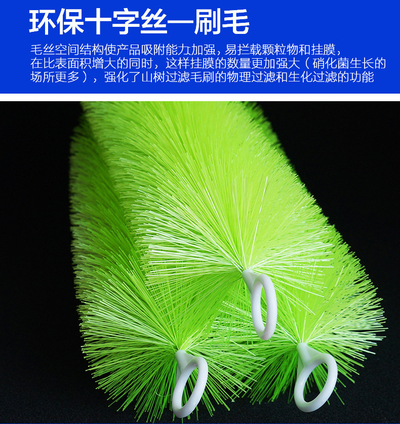 2.刷毛:环保十字丝—刷毛,毛丝韧性好,不容易变形,能长时间反复使用。十字型毛丝空间结构使产品吸附能力大大加强,更易拦载颗粒物和挂膜,在比表面积增大的同时,这样挂膜的数量更加强大(硝化菌生长的场所更多),强化了山树净化刷的物理过滤和生化过滤的功能。在同等体积的过滤池/过滤缸中,过滤及稳定水质的效果更加显著。