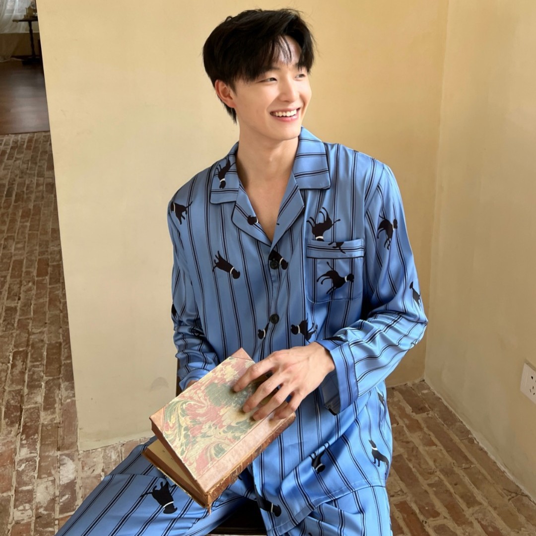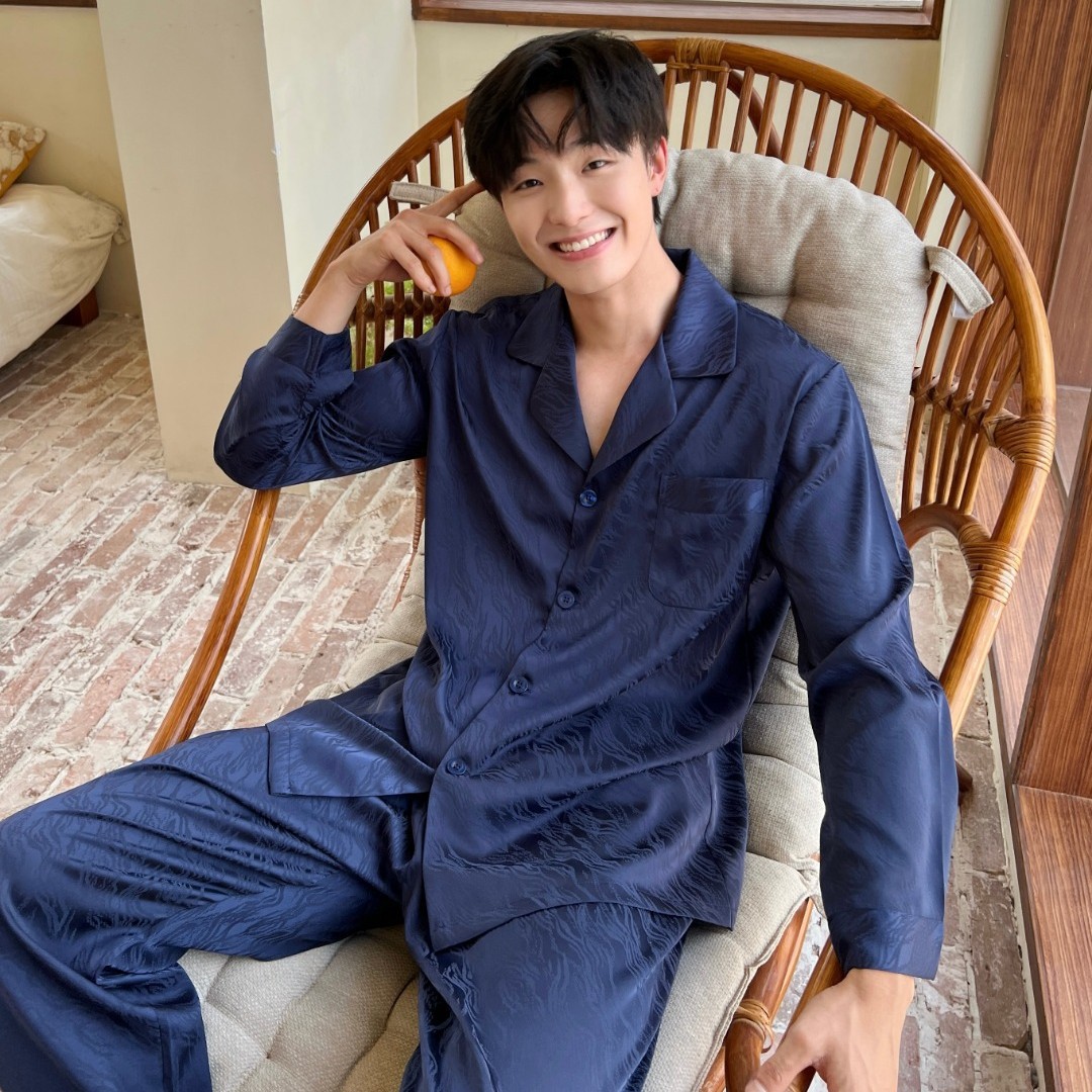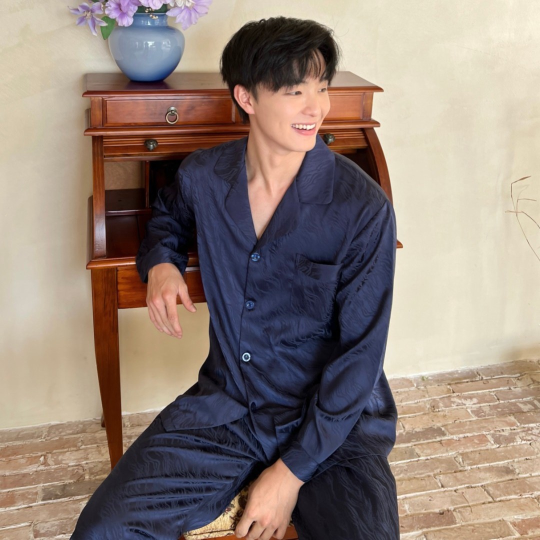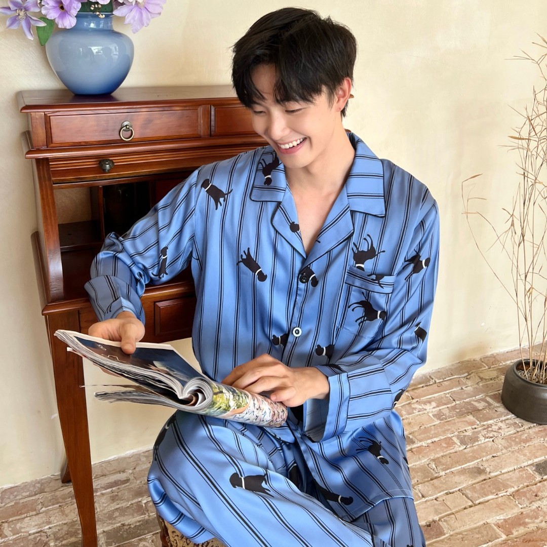 봄과 여름 새로운 아이스 실크 파자마 남자 긴팔 바지 느슨한 간단한 얇은 모조 실크 홈 의류 세트스토어 가기