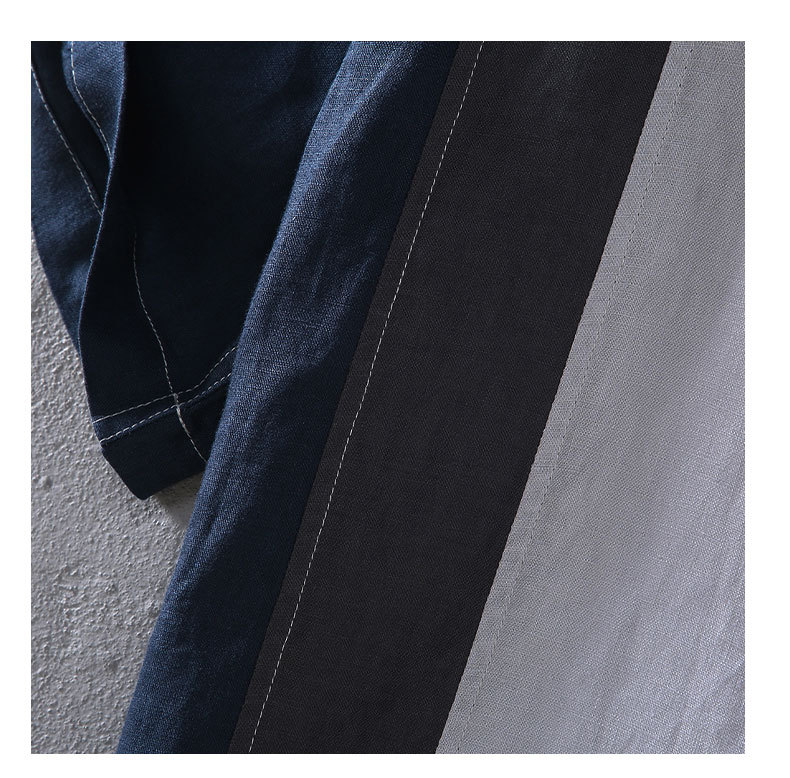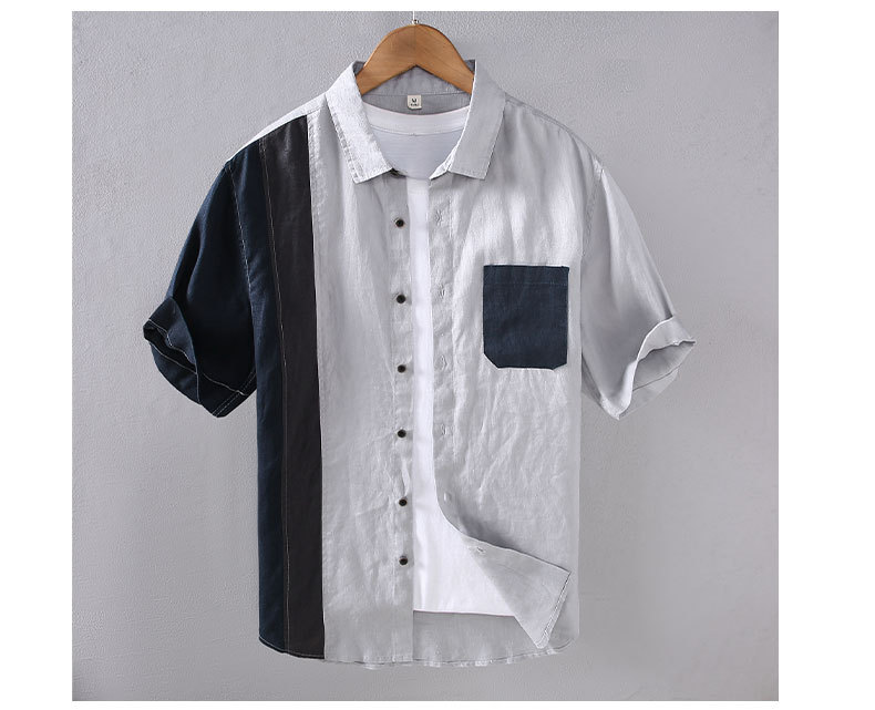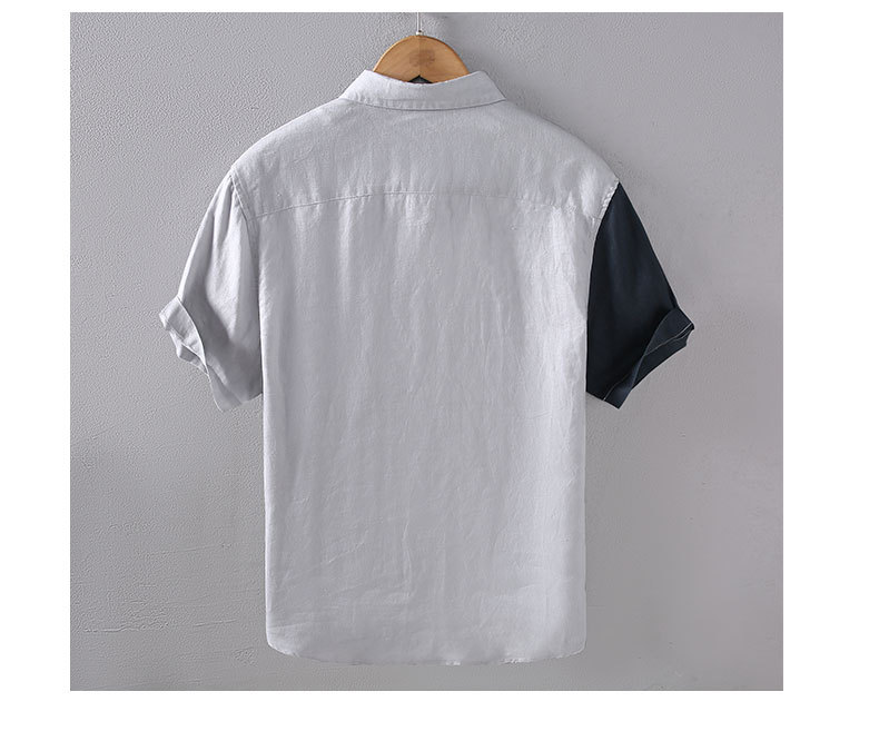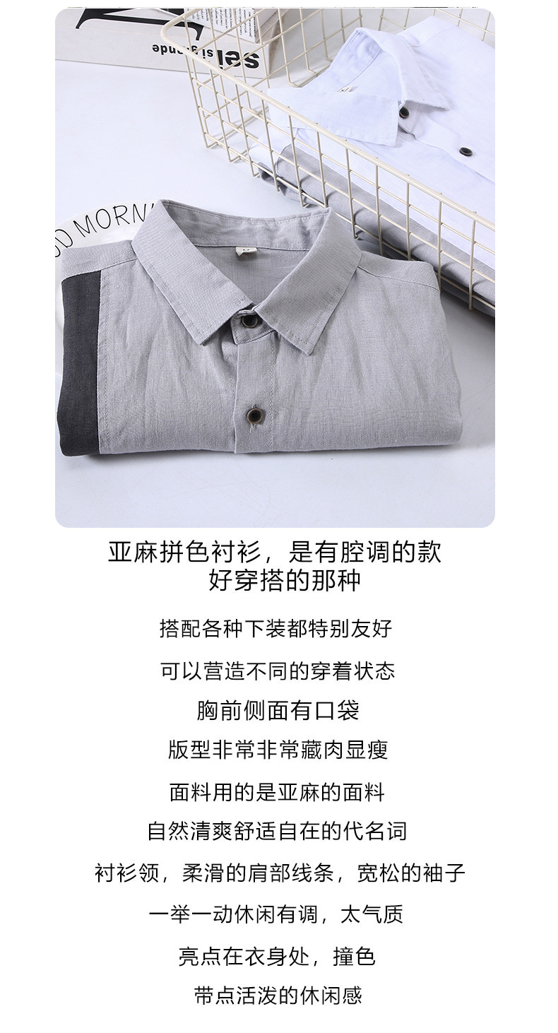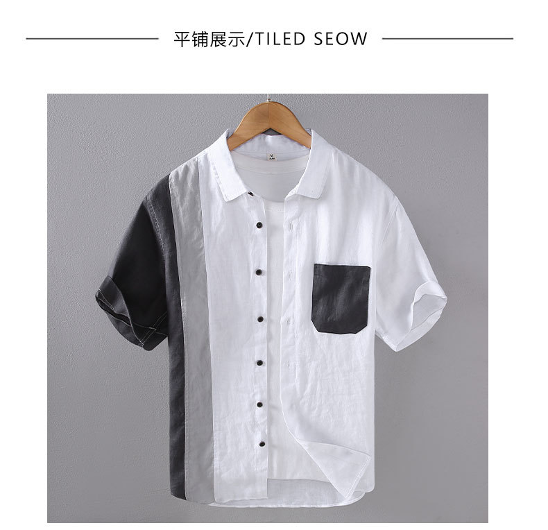 D940 스티칭 대조 컬러 반팔 리넨 셔츠 남성 여름 일본 스타일 복고풍 디자인 센스 풀 리넨 캐주얼 셔츠 트렌디스토어 가기