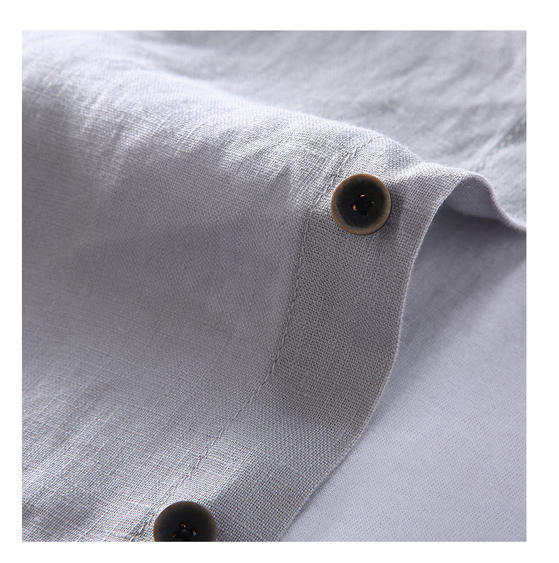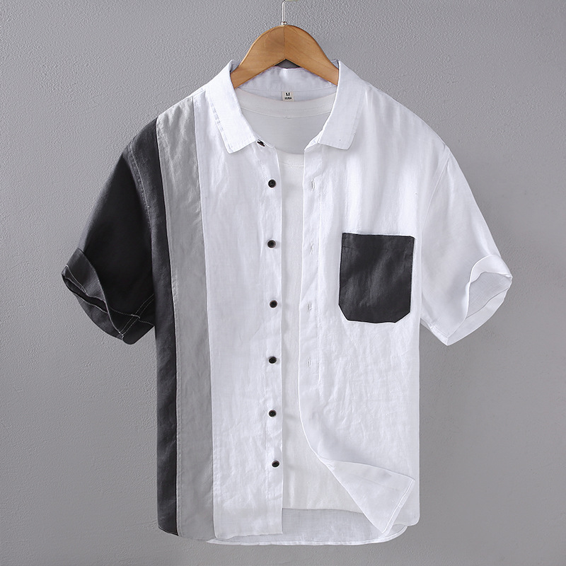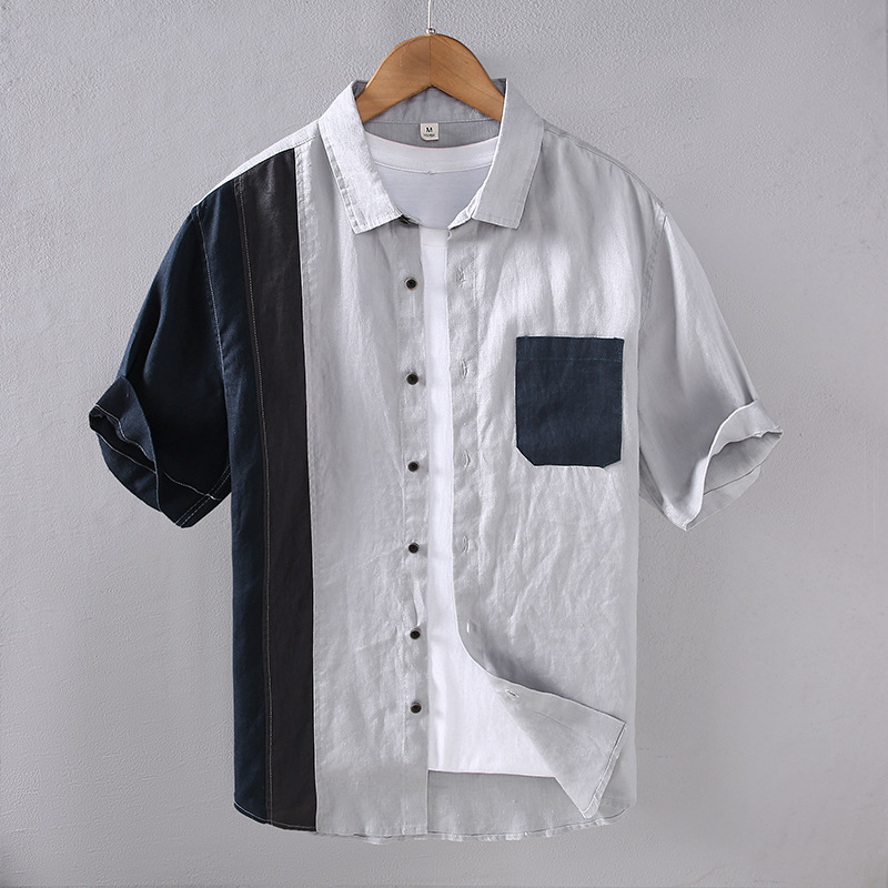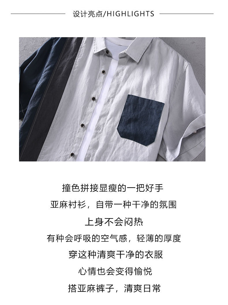 D940 스티칭 대조 컬러 반팔 리넨 셔츠 남성 여름 일본 스타일 복고풍 디자인 센스 풀 리넨 캐주얼 셔츠 트렌디