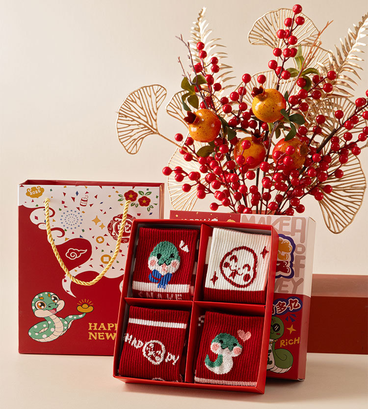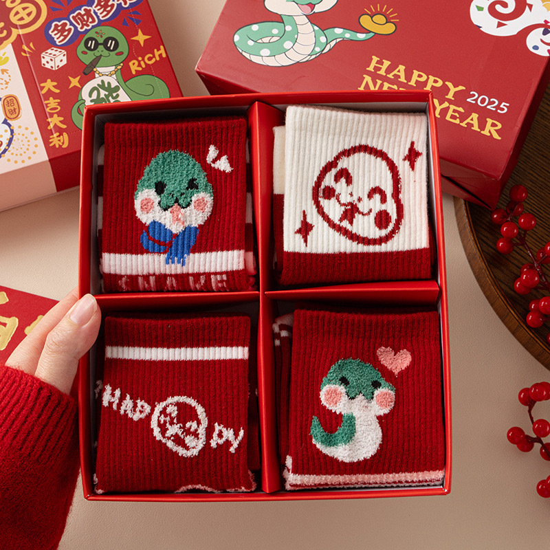 2025 년 뱀 빨간 양말 여성 뼈 년 붉은 축제 새해 양말 귀여운 만화 뱀 양말 선물 상자