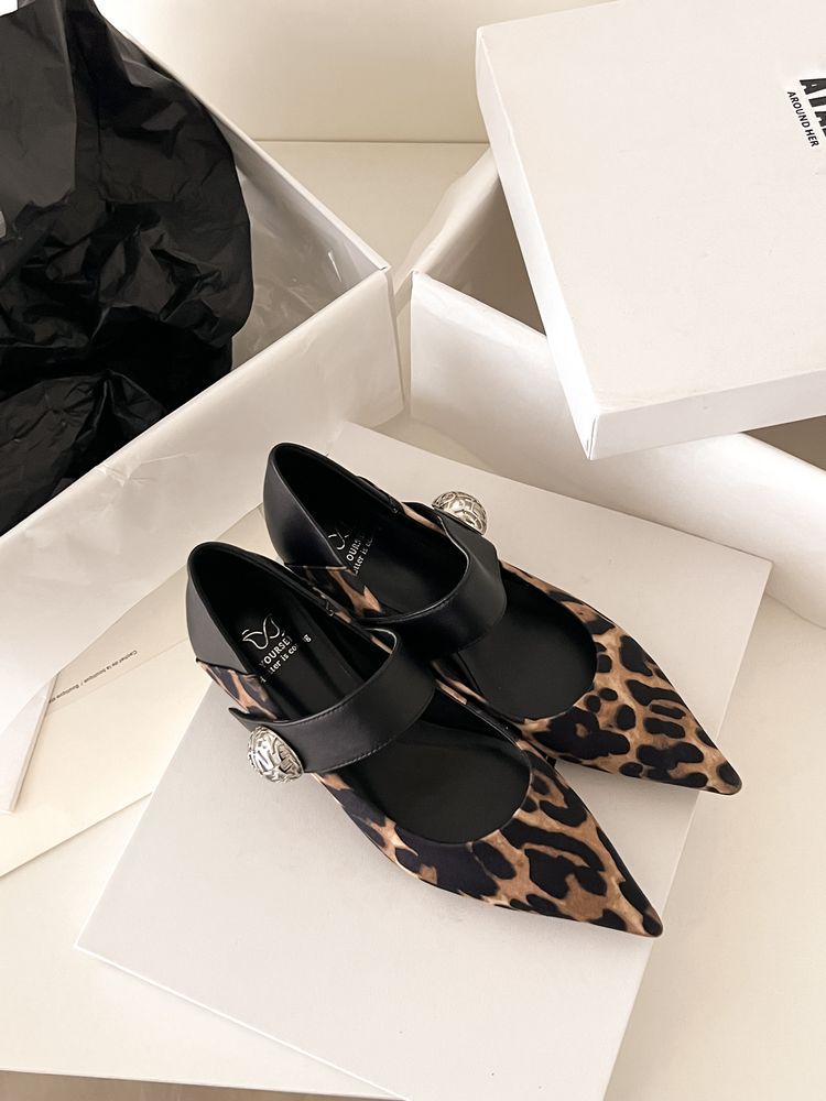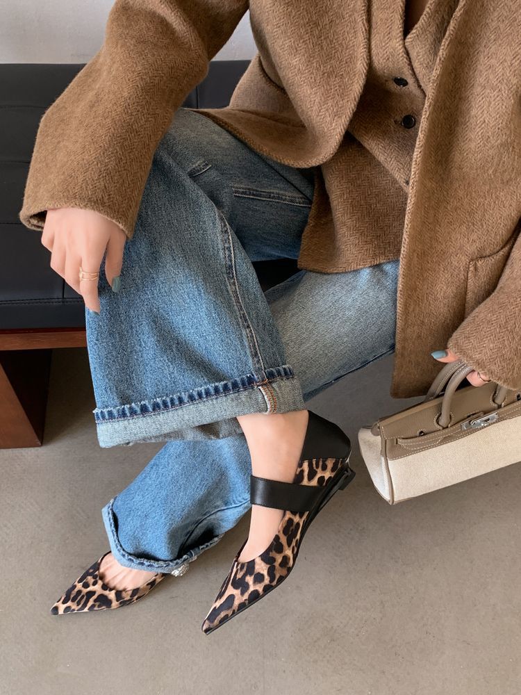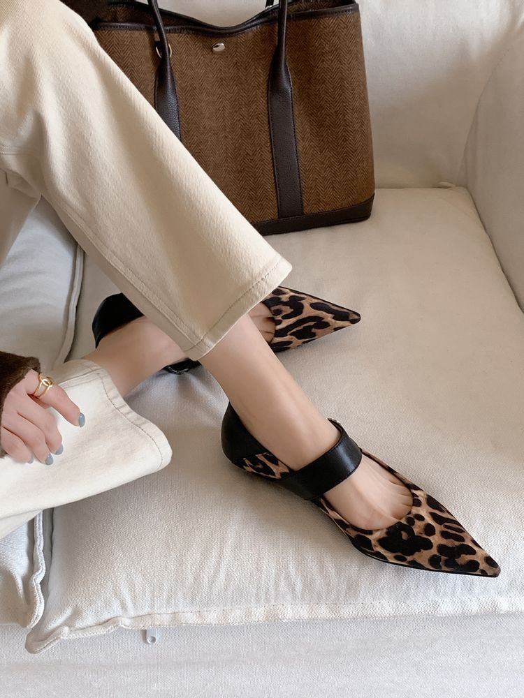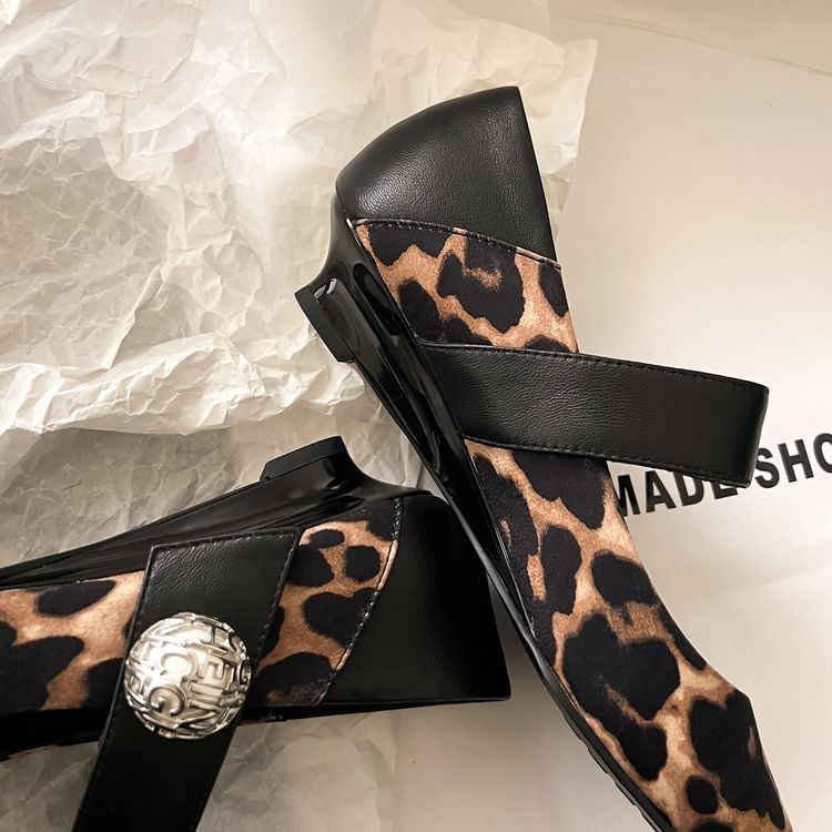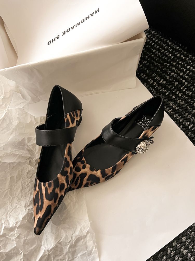 뾰족한 레오파드 무늬 버클 메리 제인 신발 여성의 이른 봄 새 새틴 양가죽 쐐기 얕은 메이스 신발 여성용 미드 힐스토어 가기