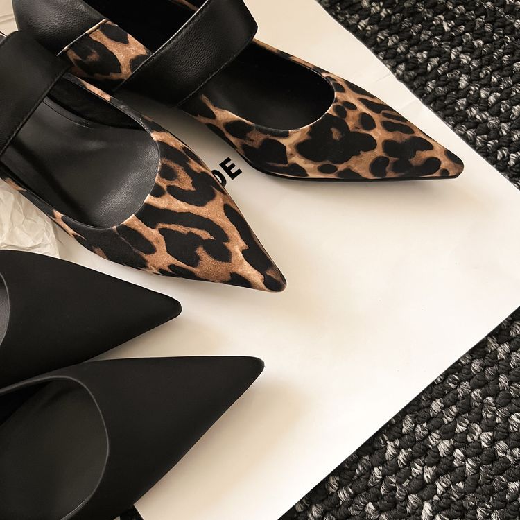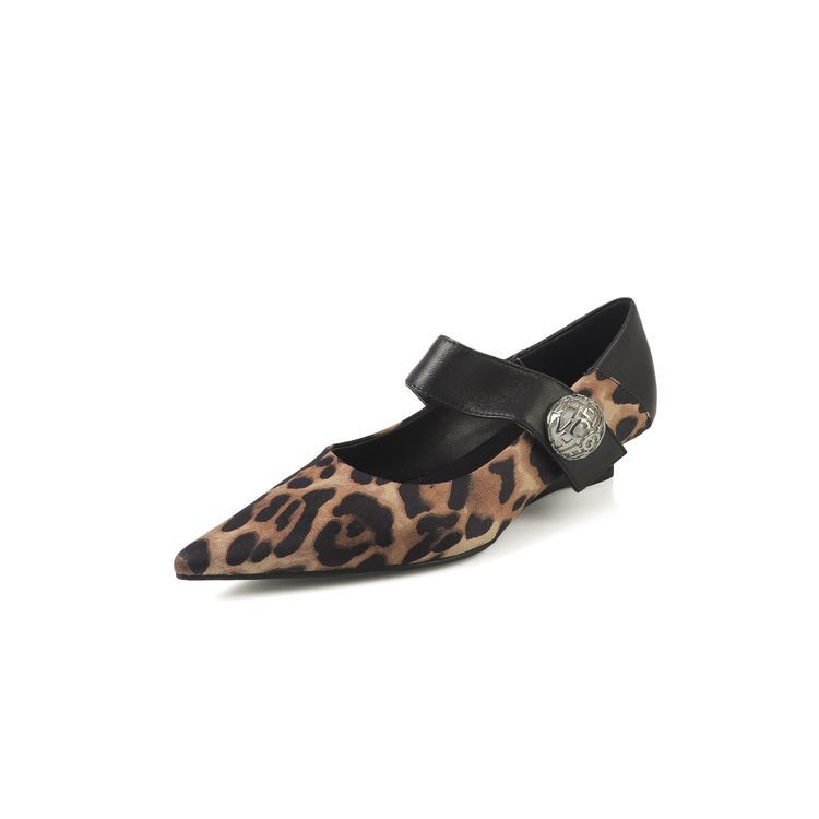 뾰족한 레오파드 무늬 버클 메리 제인 신발 여성의 이른 봄 새 새틴 양가죽 쐐기 얕은 메이스 신발 여성용 미드 힐