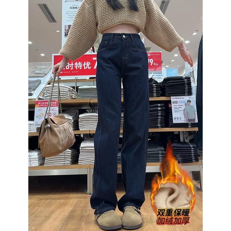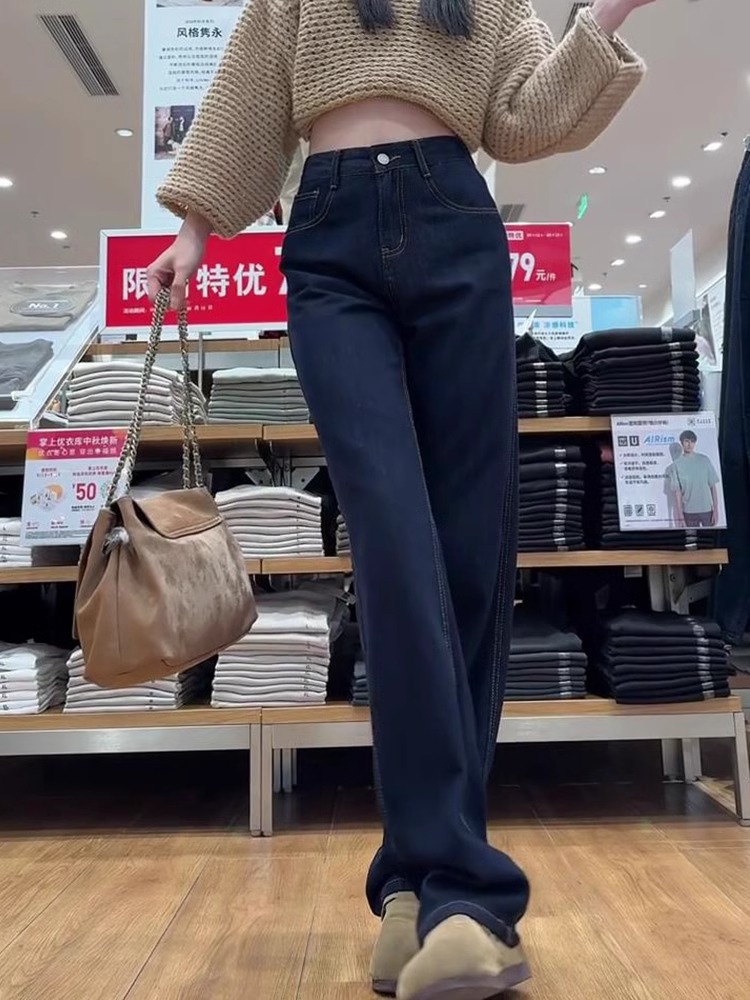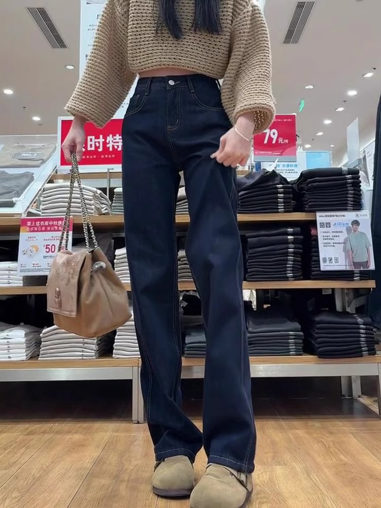 다크 블루 좁은 직선 청바지 여성의 겨울 새 플러스 사이즈 통통녀 높은 허리 슬리밍 배 모양의 넓은 다리 바지스토어 가기