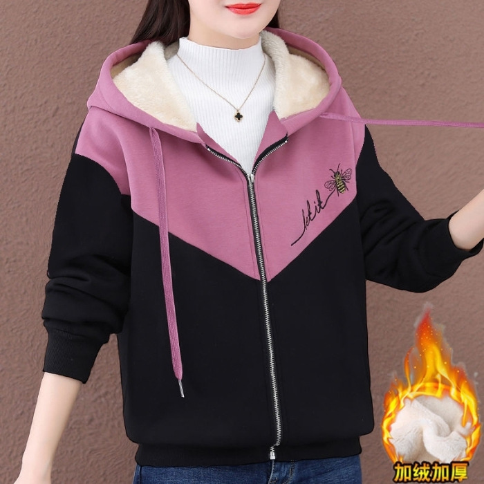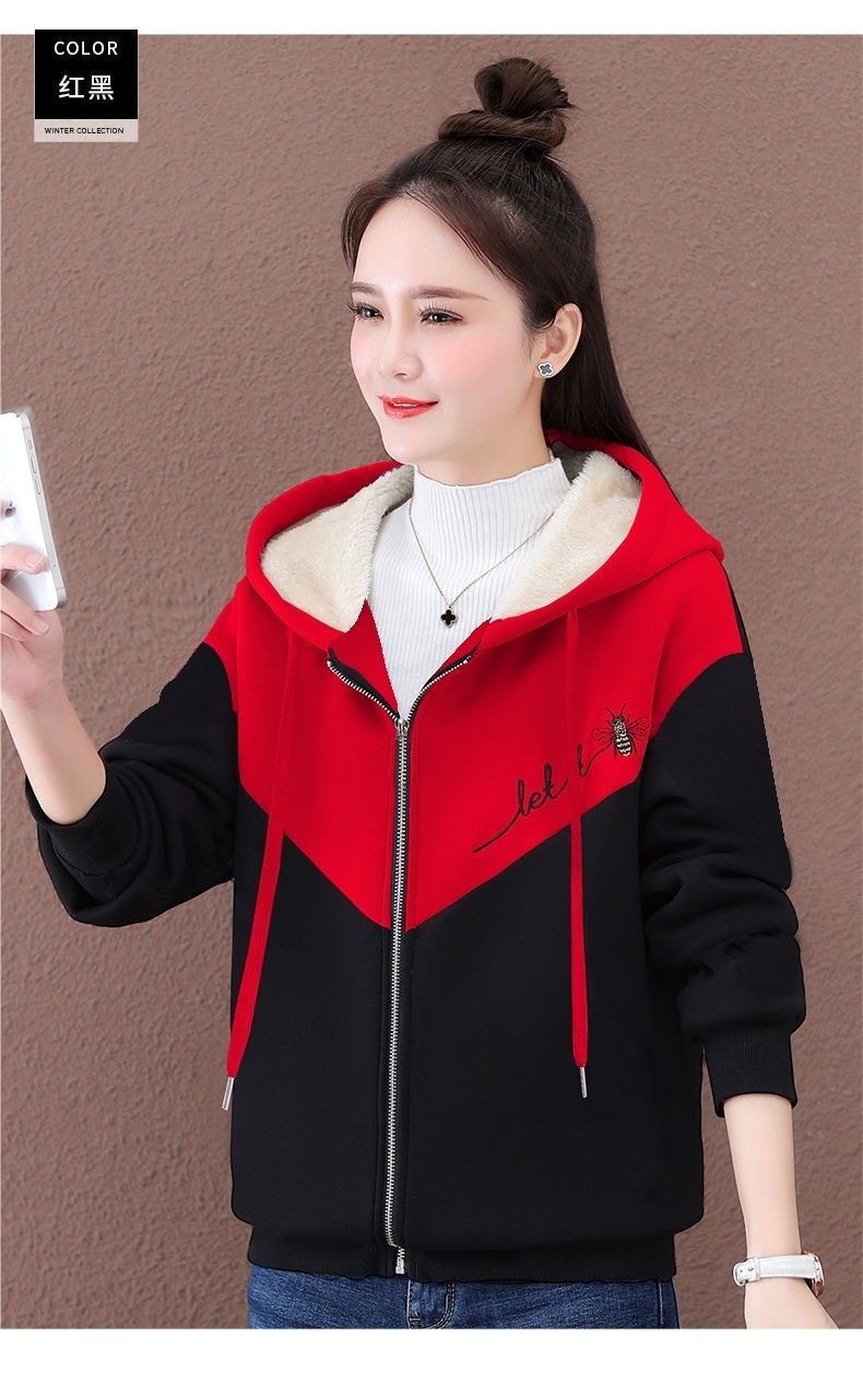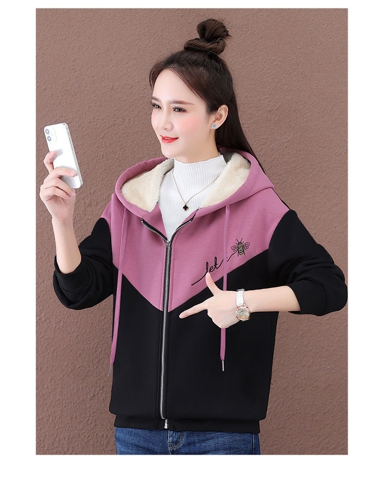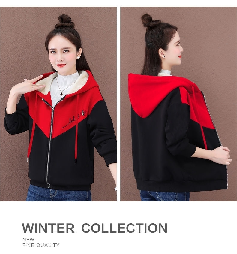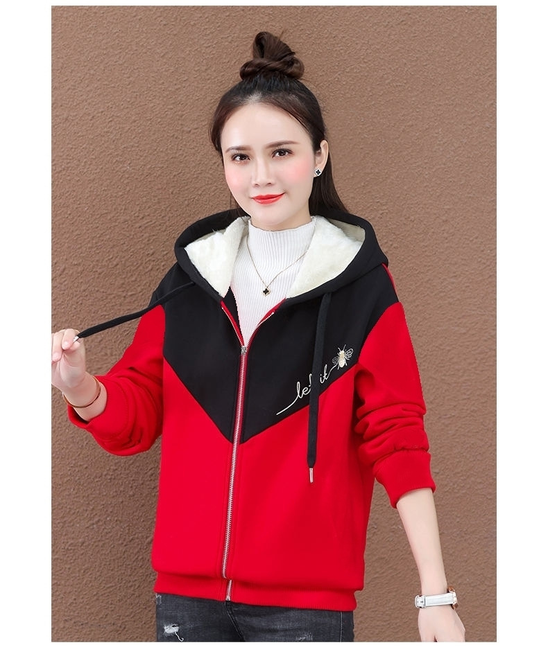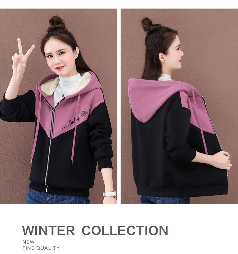 기모 여성 스웨터 새로운 겨울 두꺼운 지퍼 카디건 컬러 매칭 후드 스포츠 재킷 패션 따뜻한 벨벳 스웨터