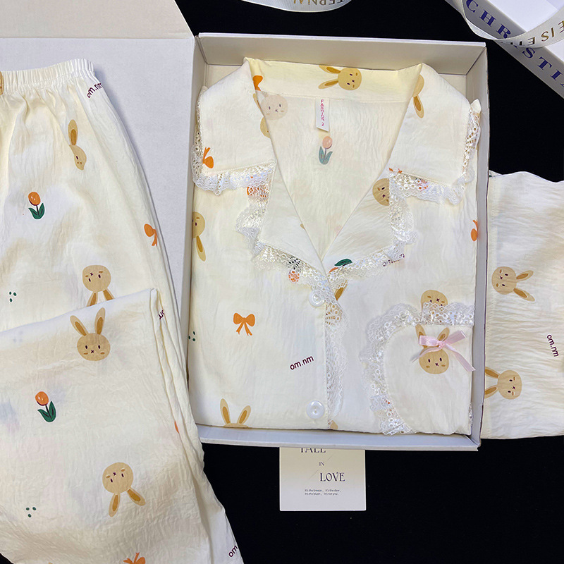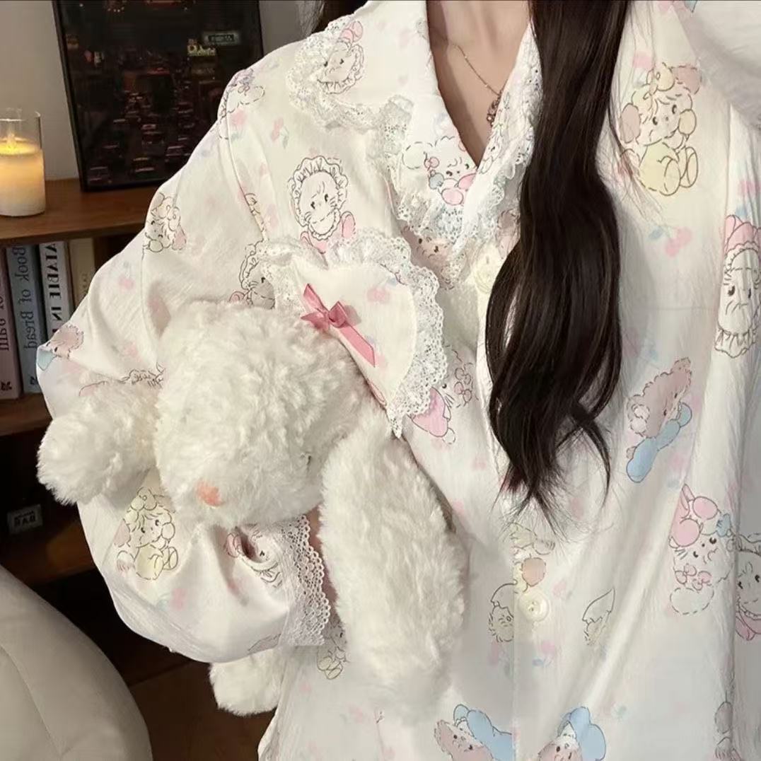 도매 세트 일본식 꽃무늬 잠옷 여성용 봄 가을 신상 구름면 귀여운 긴팔 긴바지 홈웨어 세트