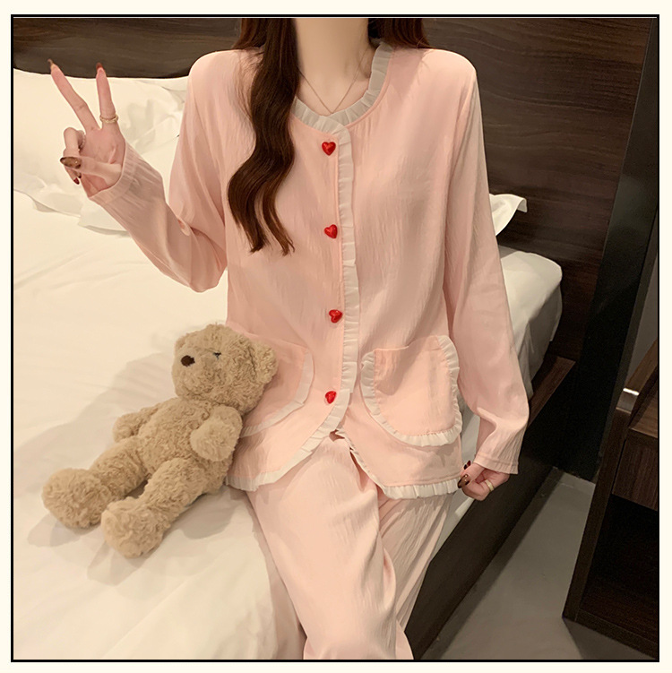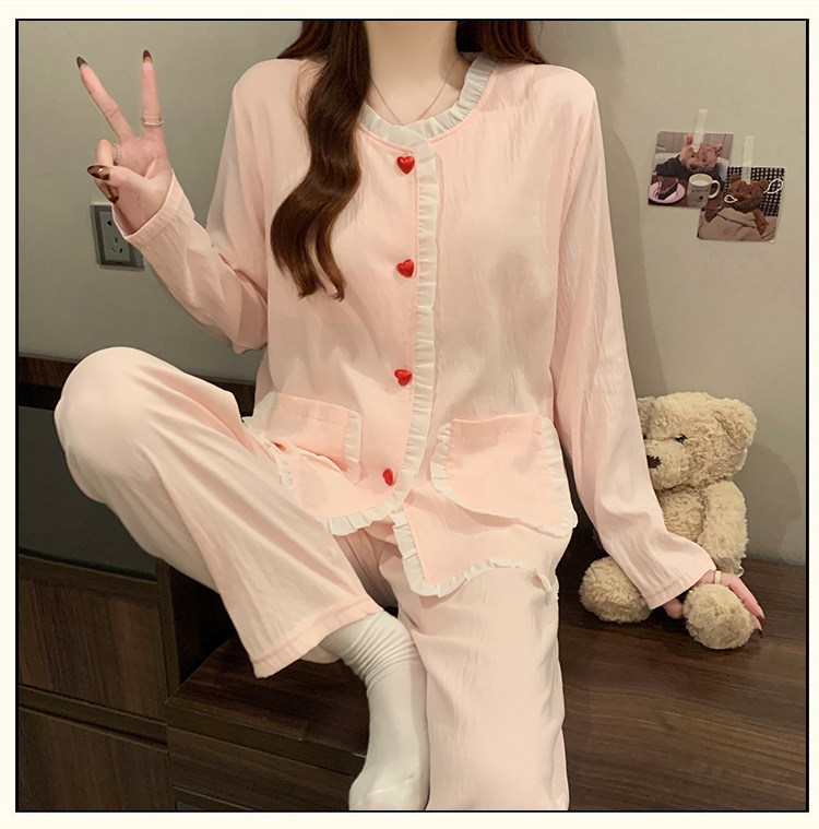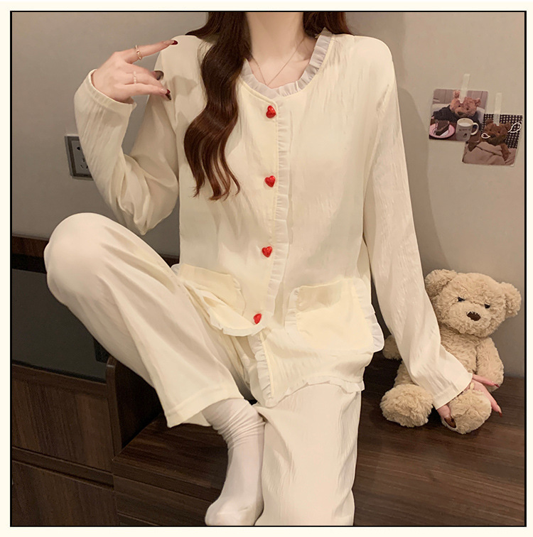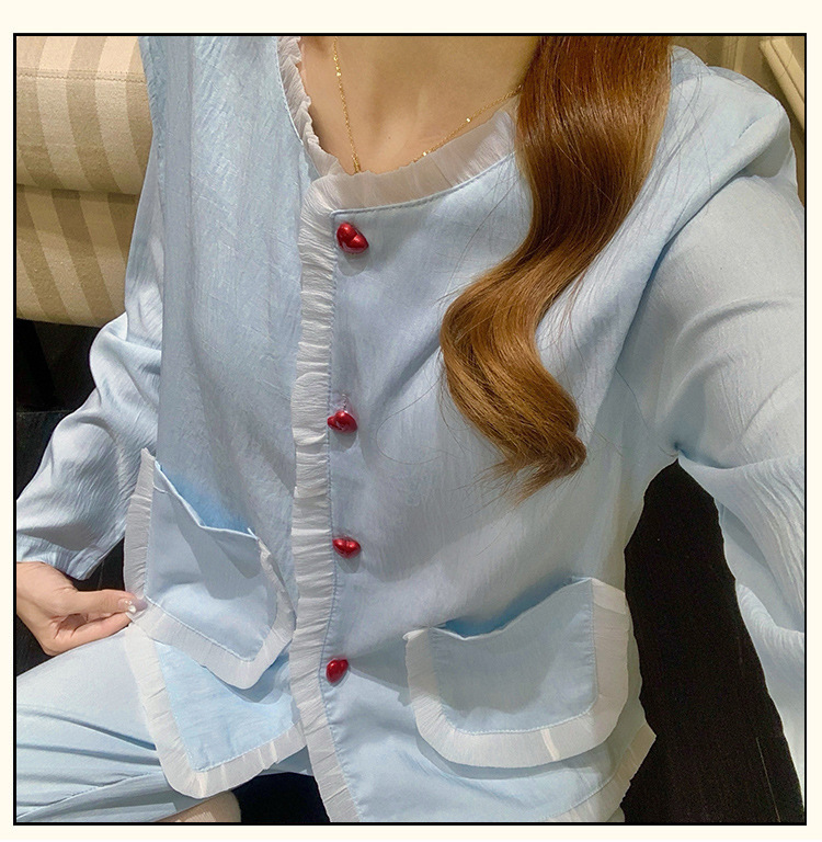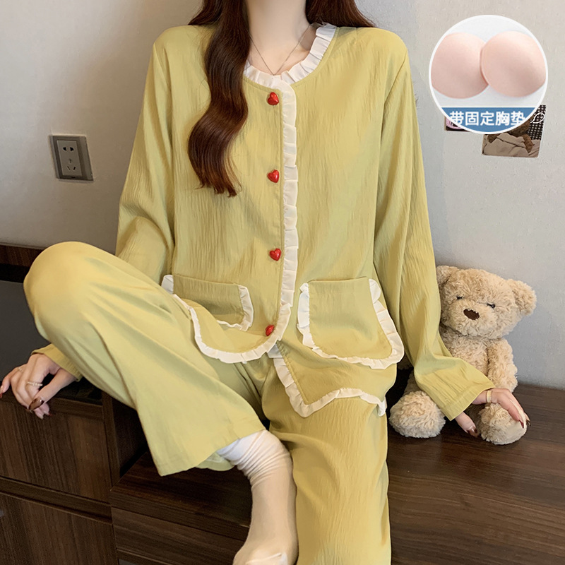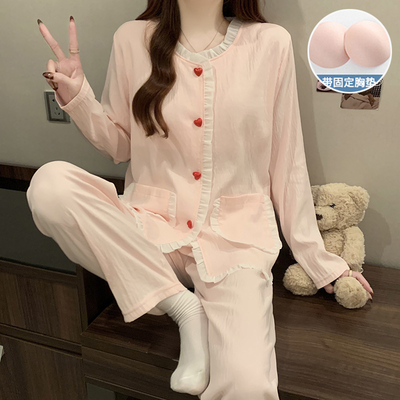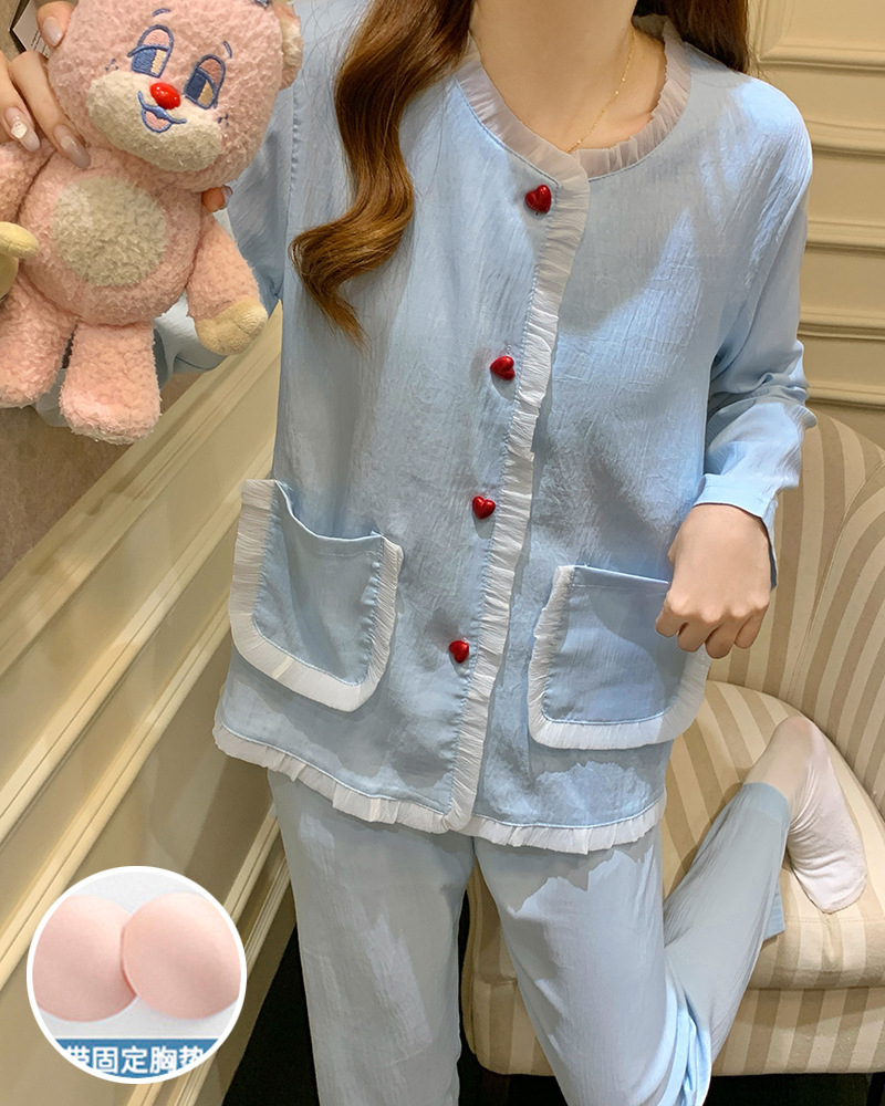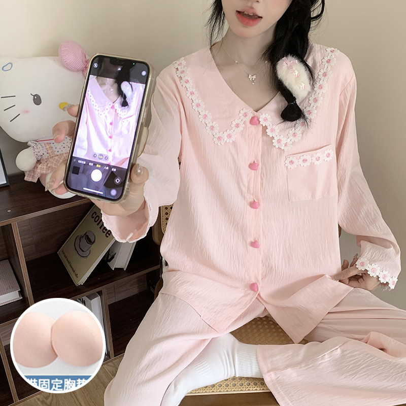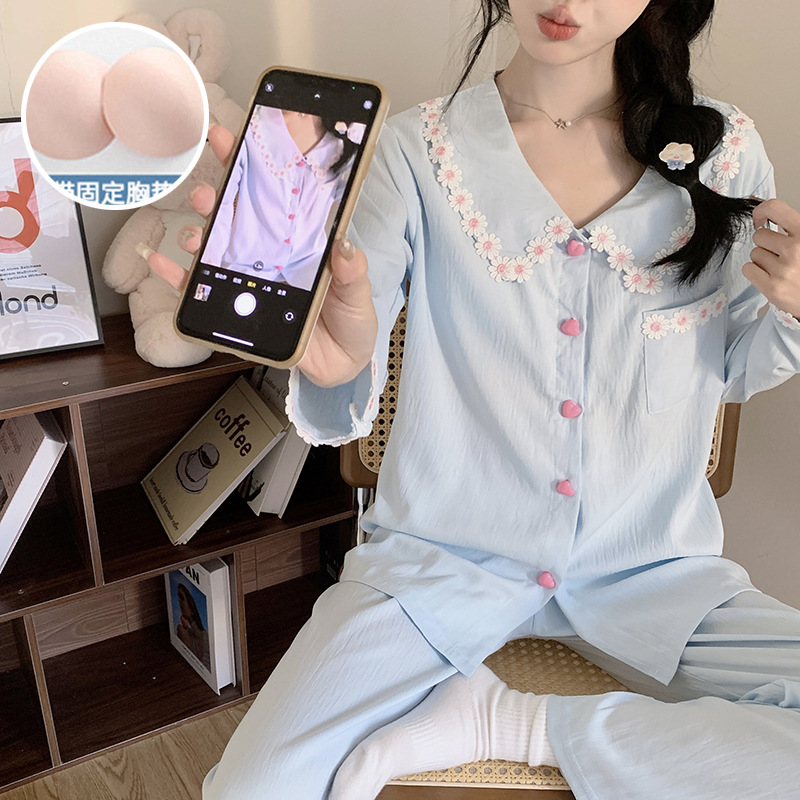 가슴 패드가 달린 잠옷 여성 봄과 가을 얇은 구름 면 카디건 긴 소매 한국 스타일 샤넬 스타일 소녀의 홈 옷 세트