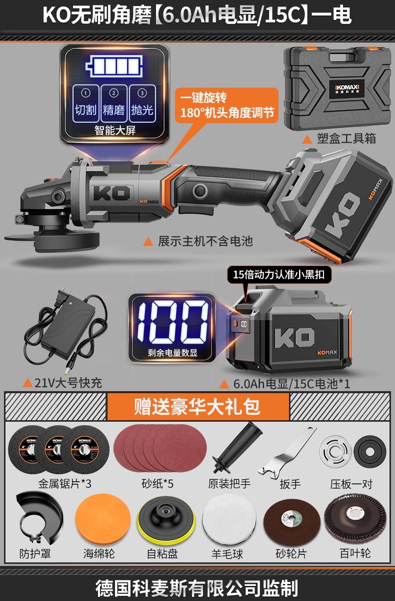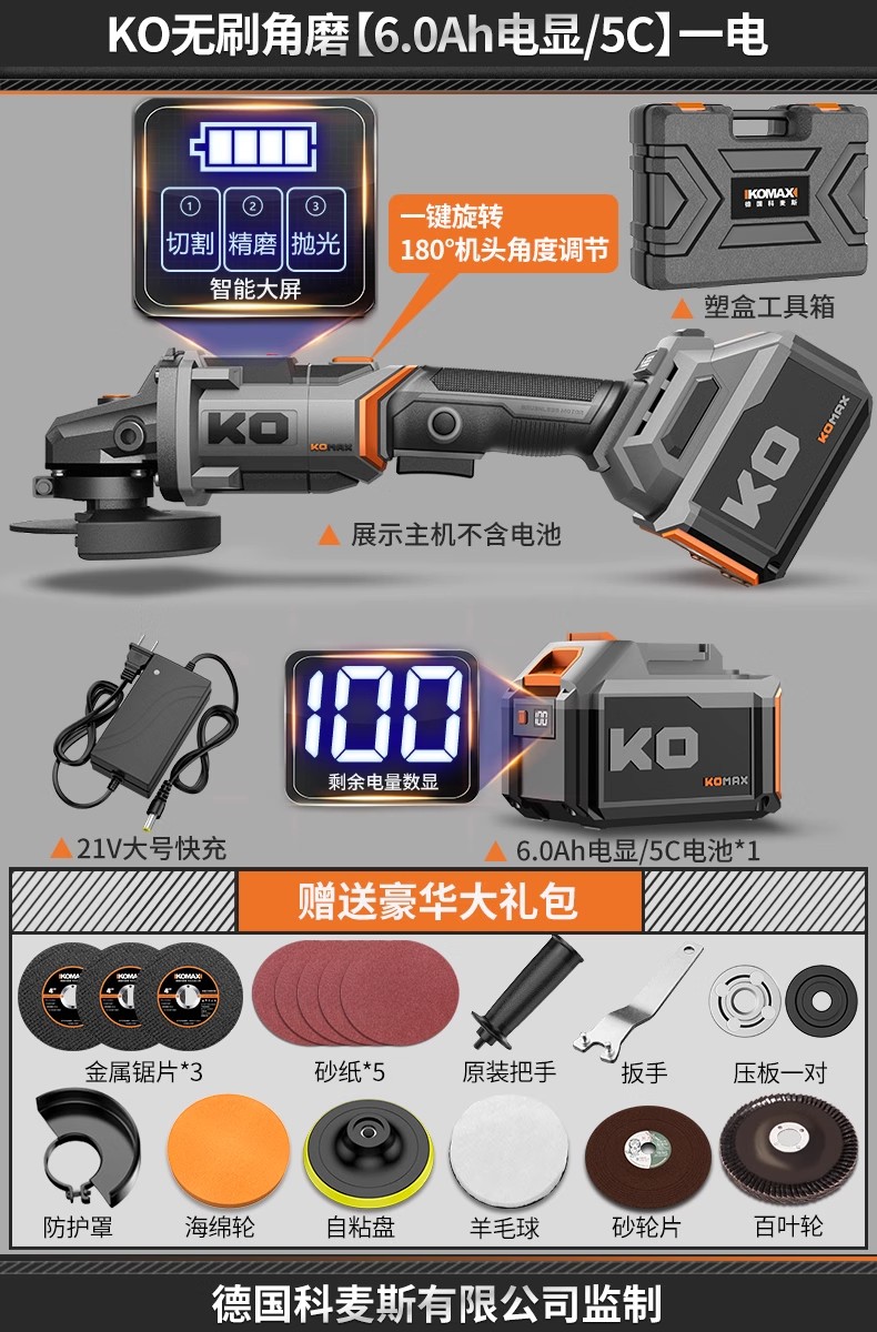 • KO 브러시리스 앵글 그라인더 [6.0Ah 전자 디스플레이/15C] 배터리 1개