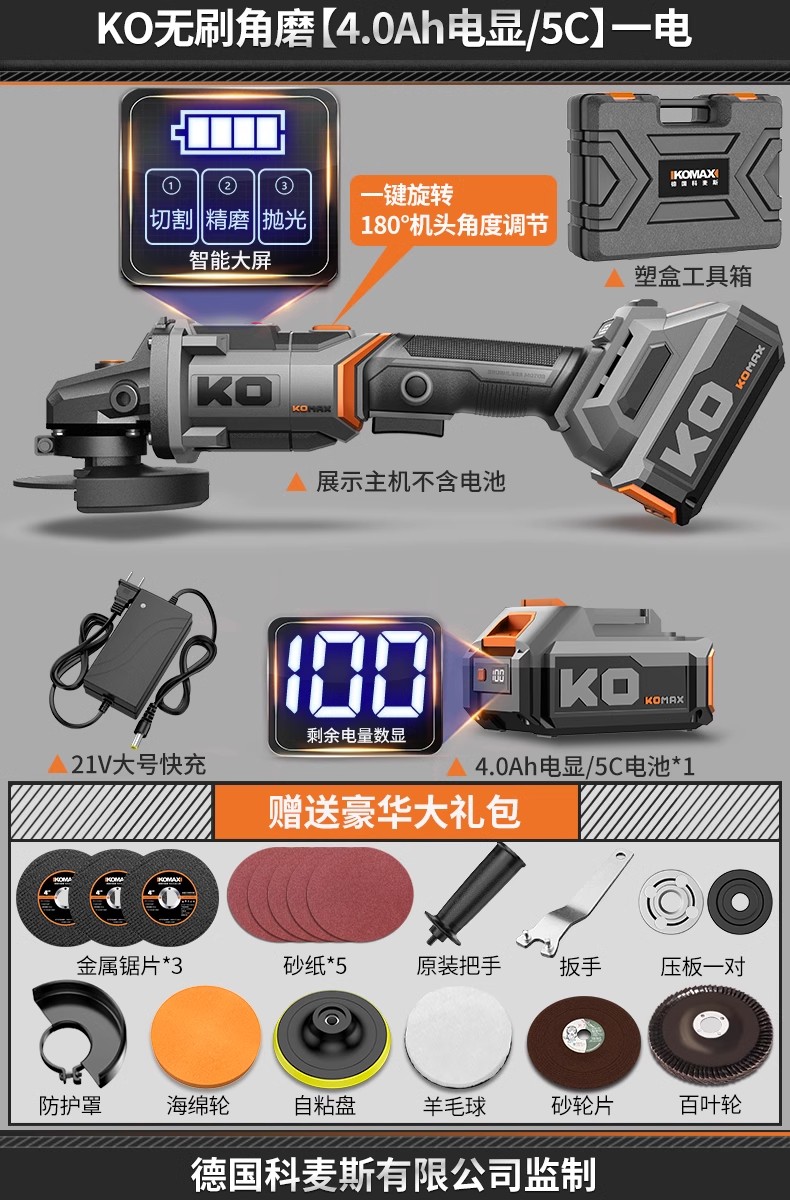 • KO 브러시리스 앵글 그라인더 [4.0Ah 전자 디스플레이/5C] 배터리 1개