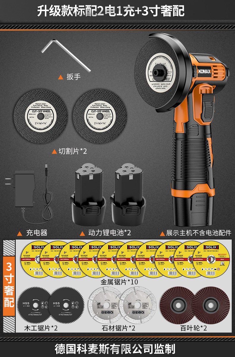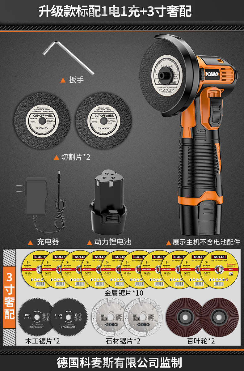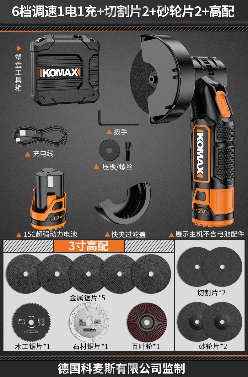 • 6단 속도 조절, 배터리 1개, 충전 1개 + 커팅 디스크 2개 + 그라인딩 휠 디스크 2개 + 고급 구성