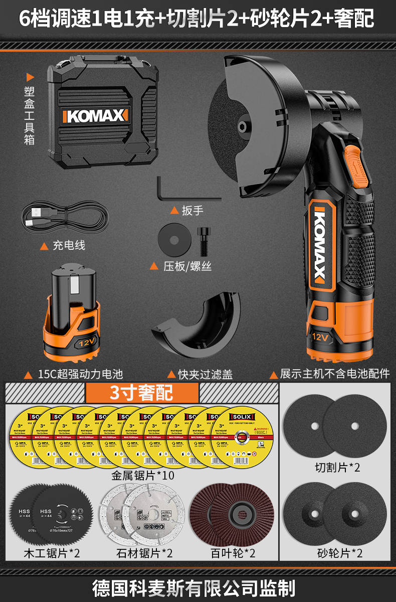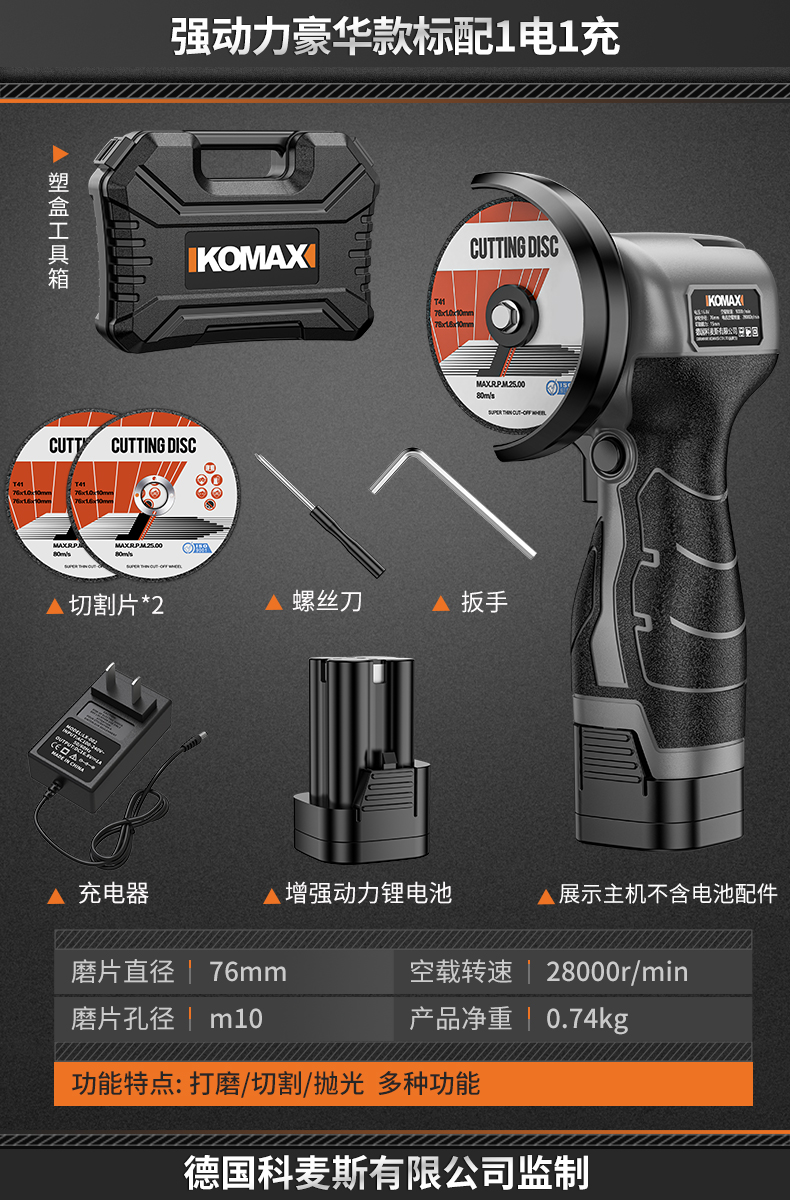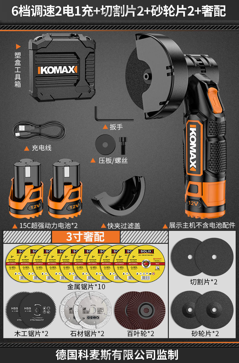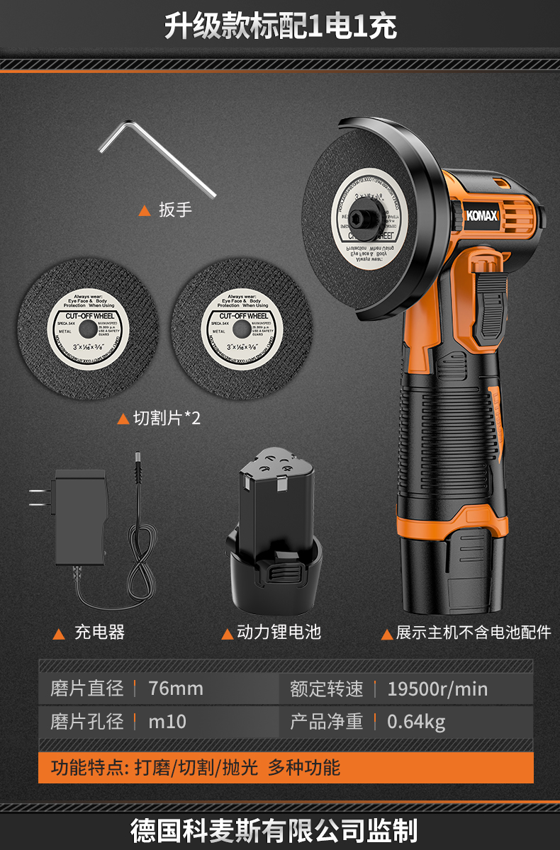 • 6단 속도 조절, 배터리 1개, 충전 1개 + 커팅 디스크 2개 + 그라인딩 휠 디스크 2개 + 고급 구성