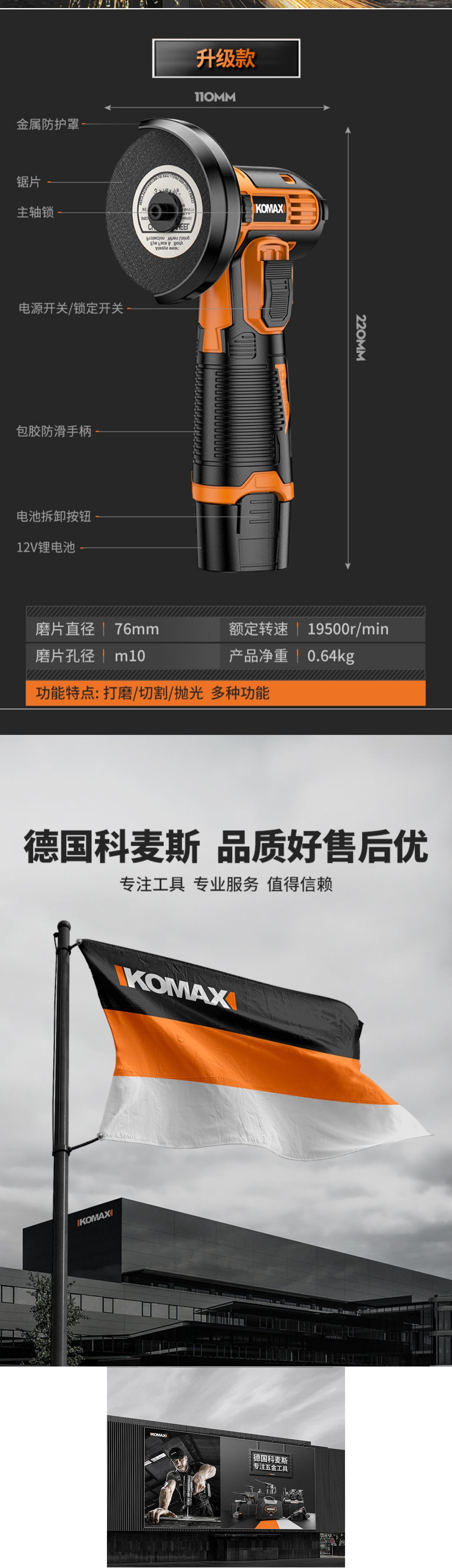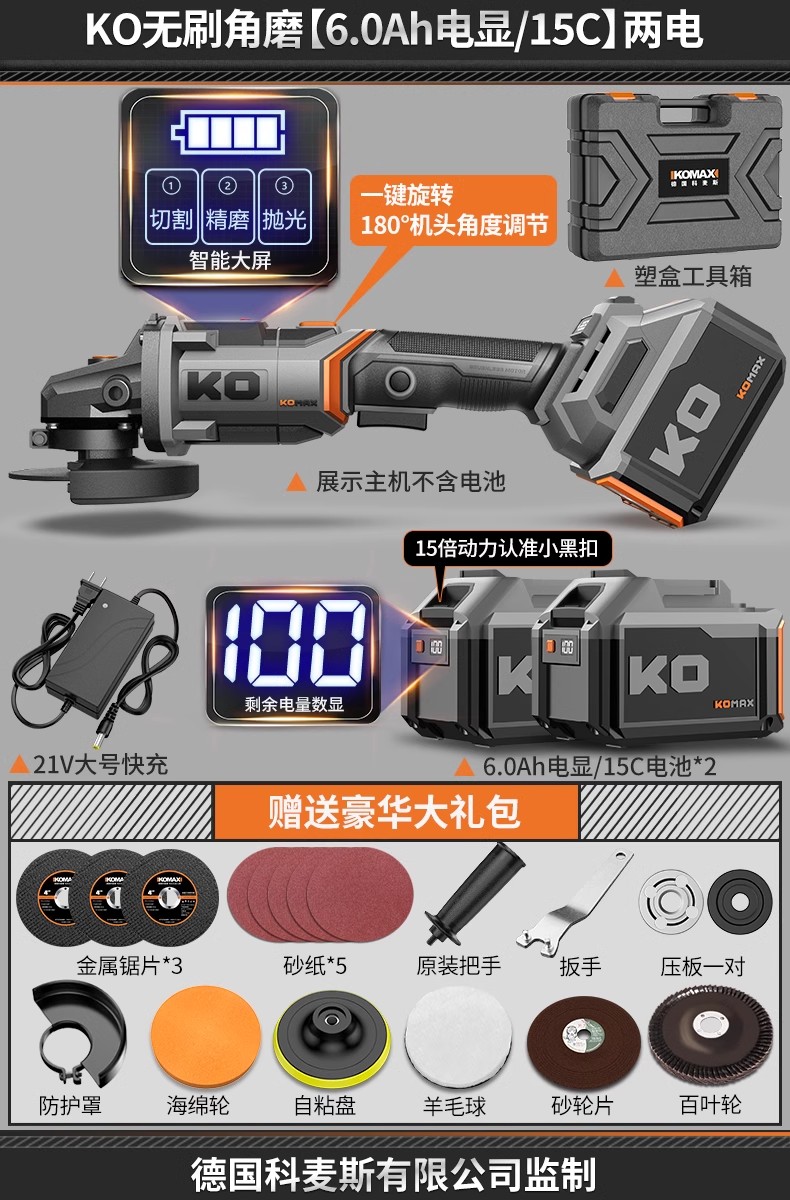• KO 브러시리스 앵글 그라인더 [6.0Ah 전자 디스플레이/15C] 배터리 2개