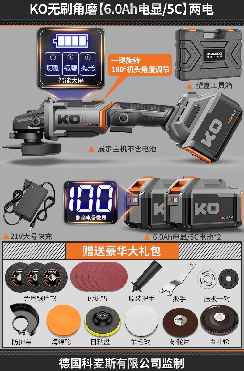 • KO 브러시리스 앵글 그라인더 [6.0Ah 전자 디스플레이/5C] 배터리 2개