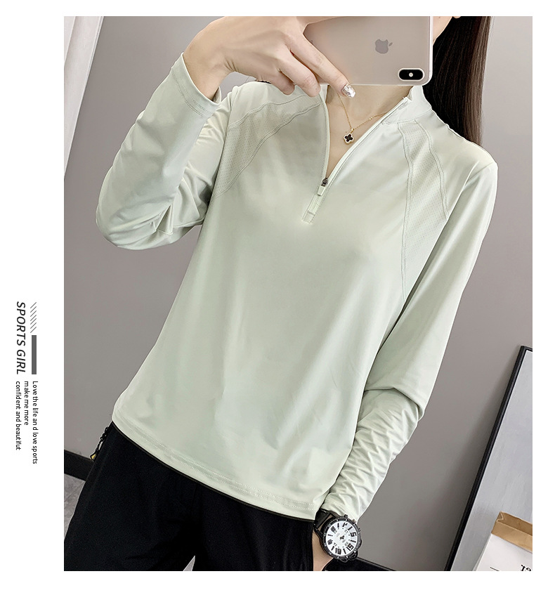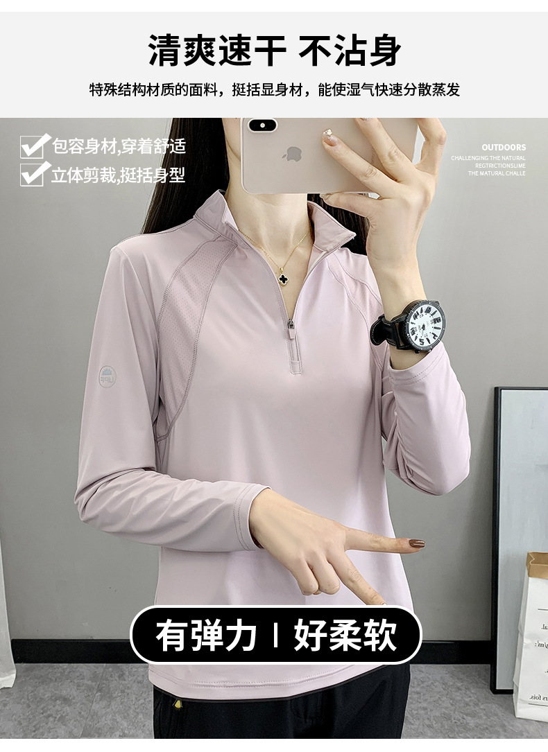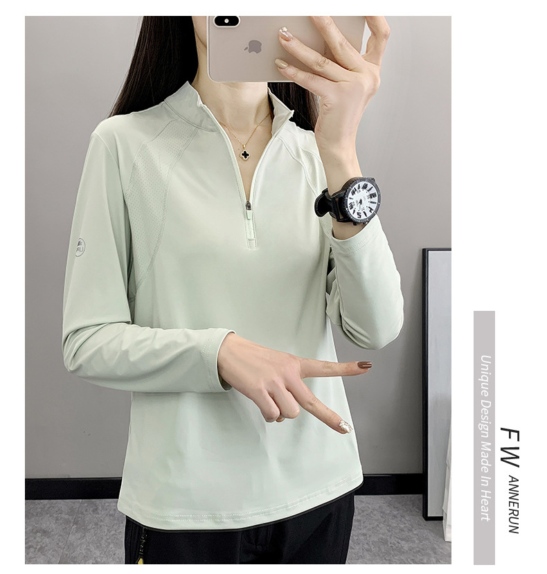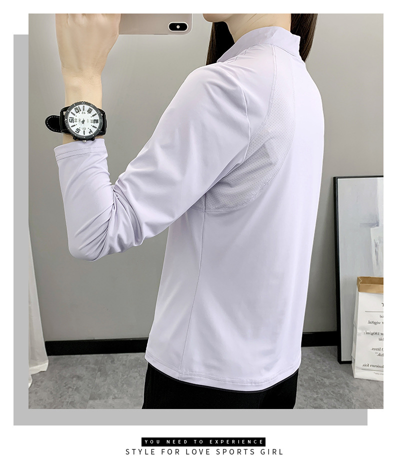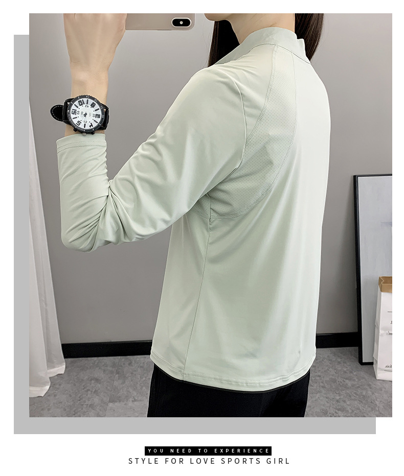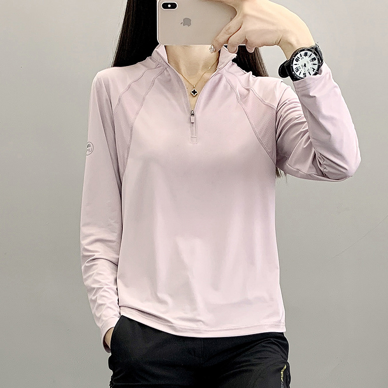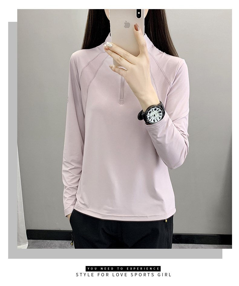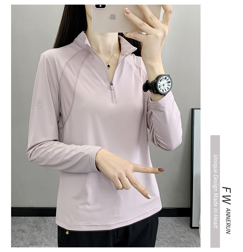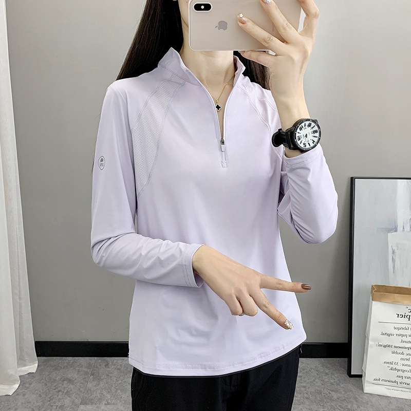 야외 스포츠 빠른 건조 티셔츠 봄과 가을 여름 빛 탄성 스포츠 통기성 여성 긴팔 선 스크린 수직 칼라가있는 빠른 건조 탑스토어 가기